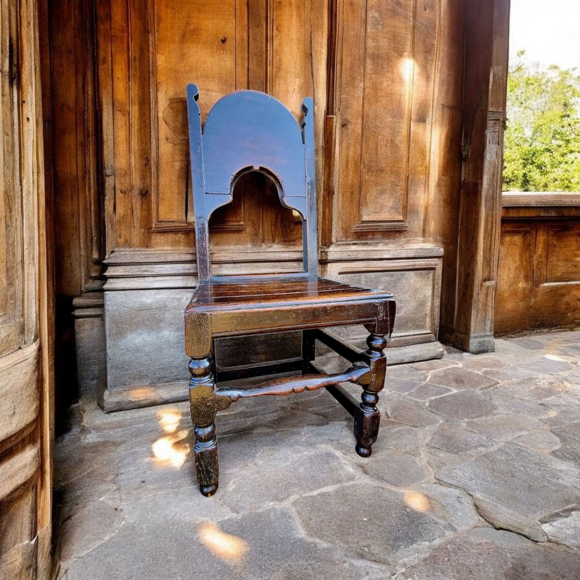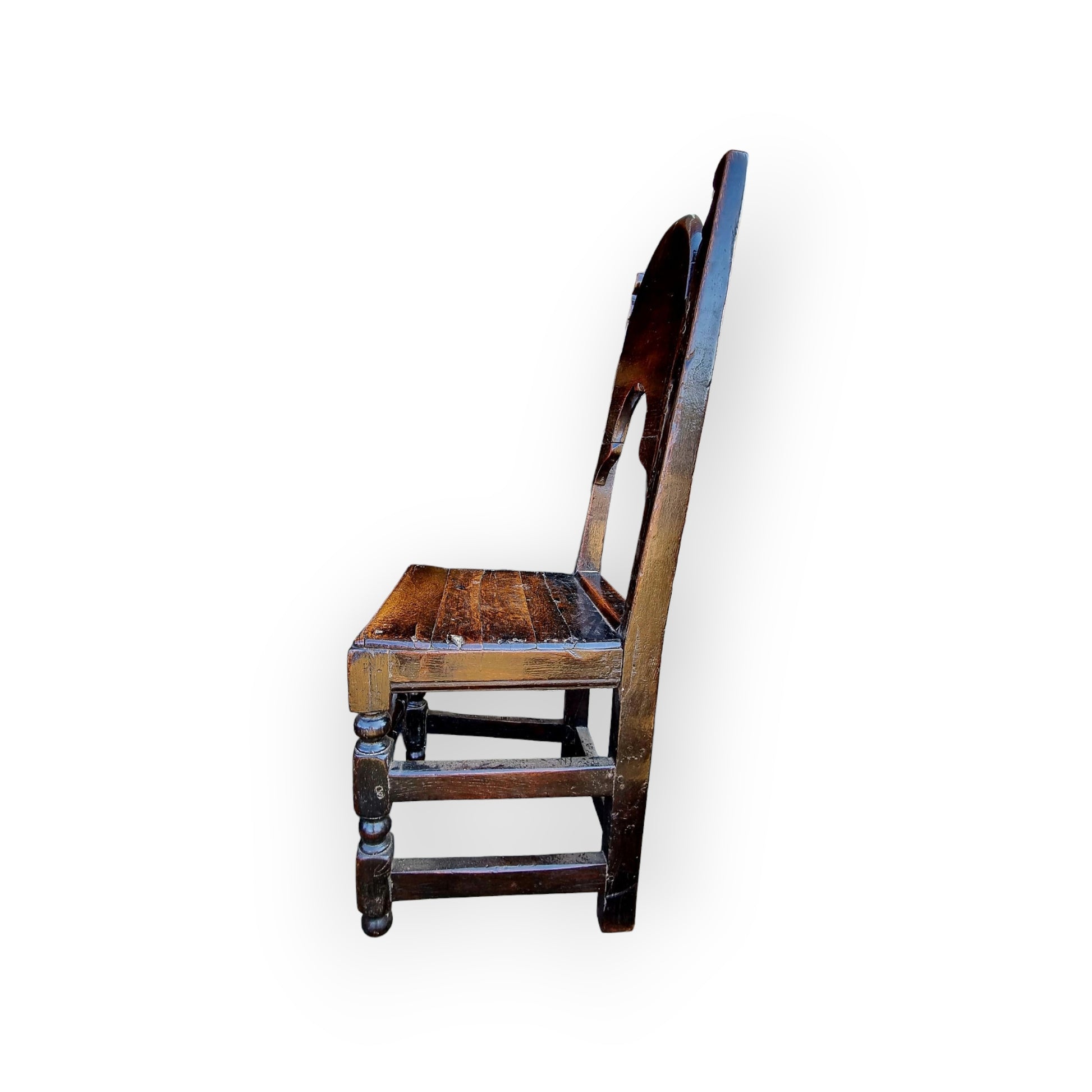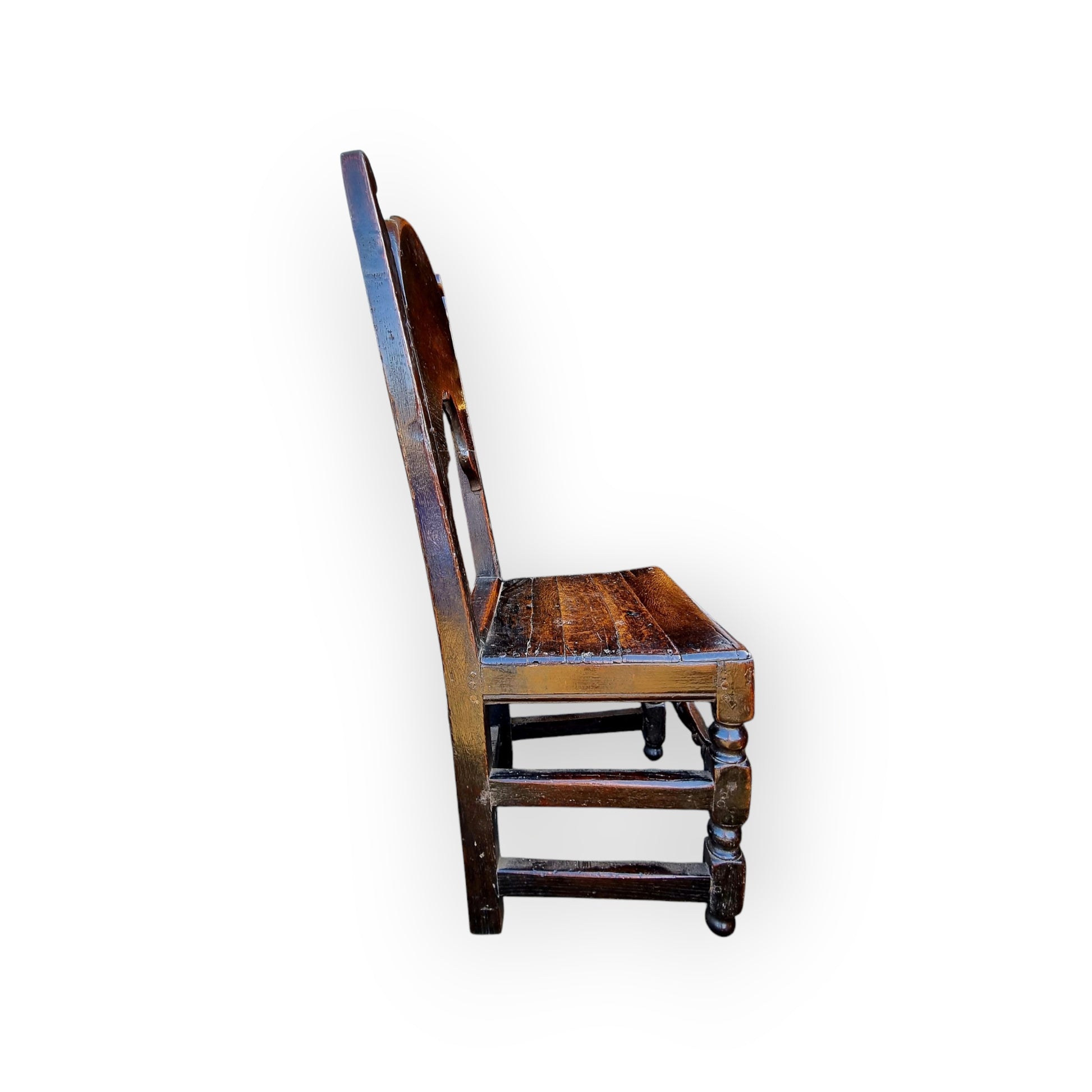With its original plank seat, supported on turned front legs united by a turned stretcher (beautifully worn with use over time), the back legs of square-cut form united by peripheral stretchers to the sides and back.