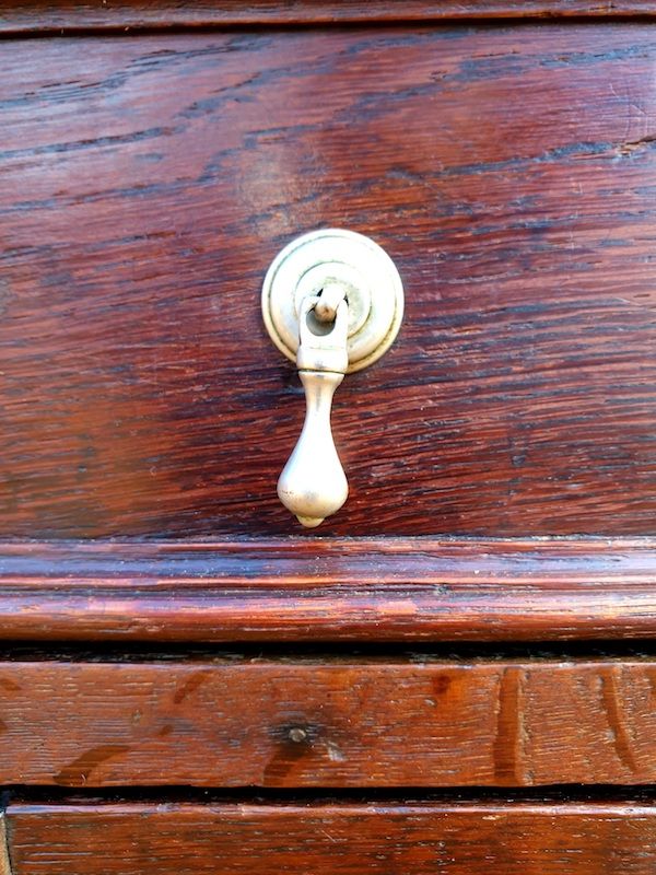 Original drop handles to the drawer fronts. The escutcheons to the drawer fronts have been replaced historically.