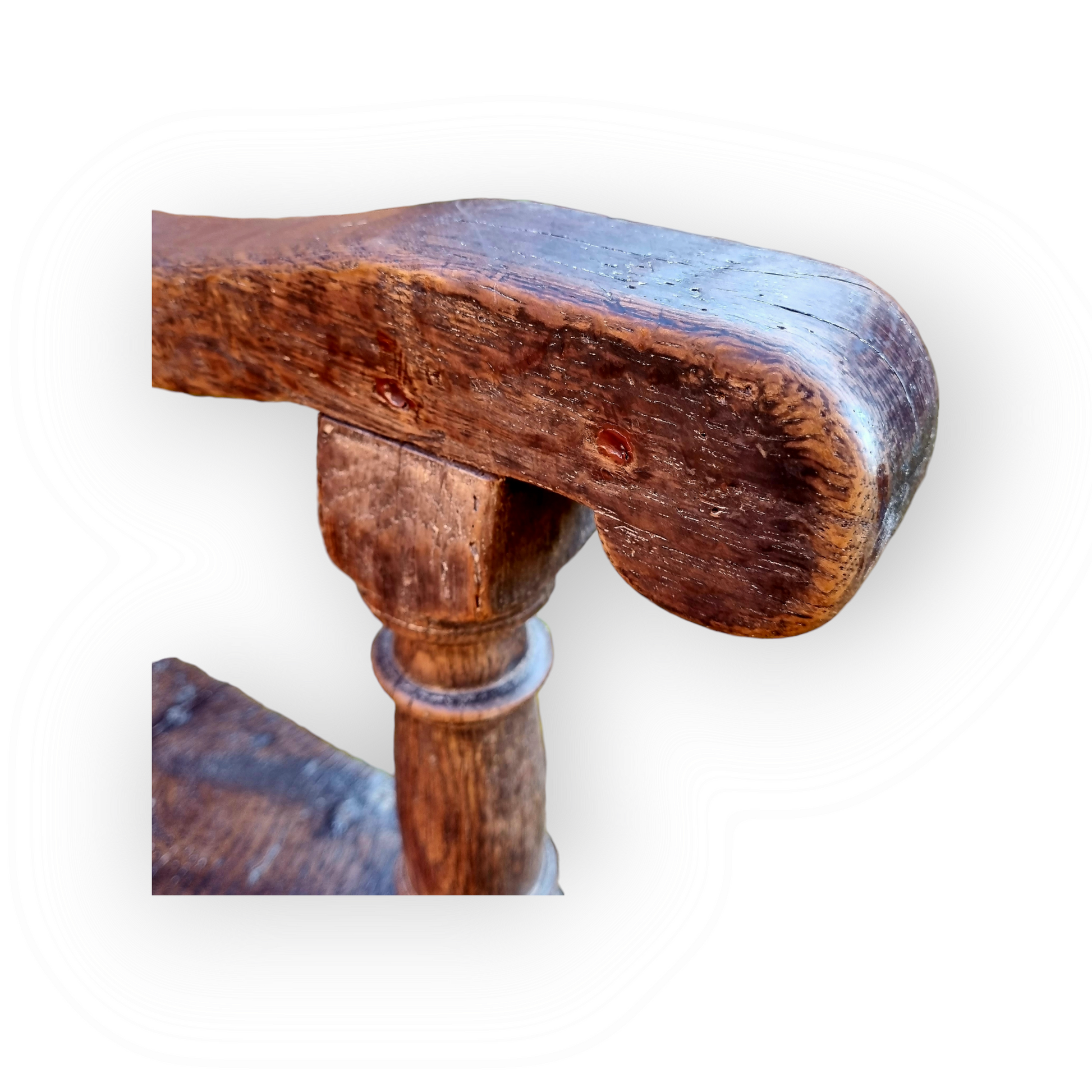 This is a fine example of period seating — ideal for collectors of early oak furniture, English vernacular design, or those seeking a sculptural accent with historical gravitas.