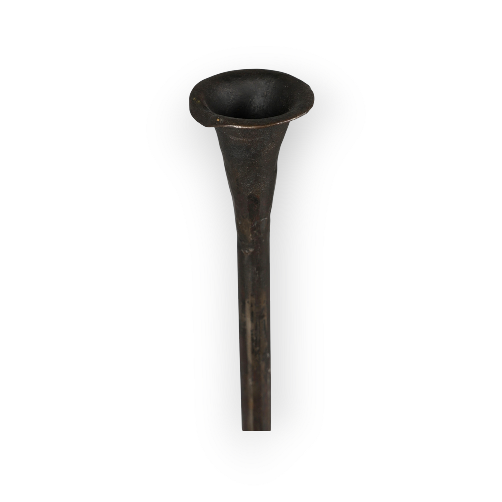 The finial formed as flared and rolled candle socket over a plain shaft with a decorative rise-and-fall bracket below, held by an iron spring against the shaft under tension. The bracket has a nip with pivoted jaw, used to hold a taper, its counter balance formed as an additional candlesocket of identical form to the other.