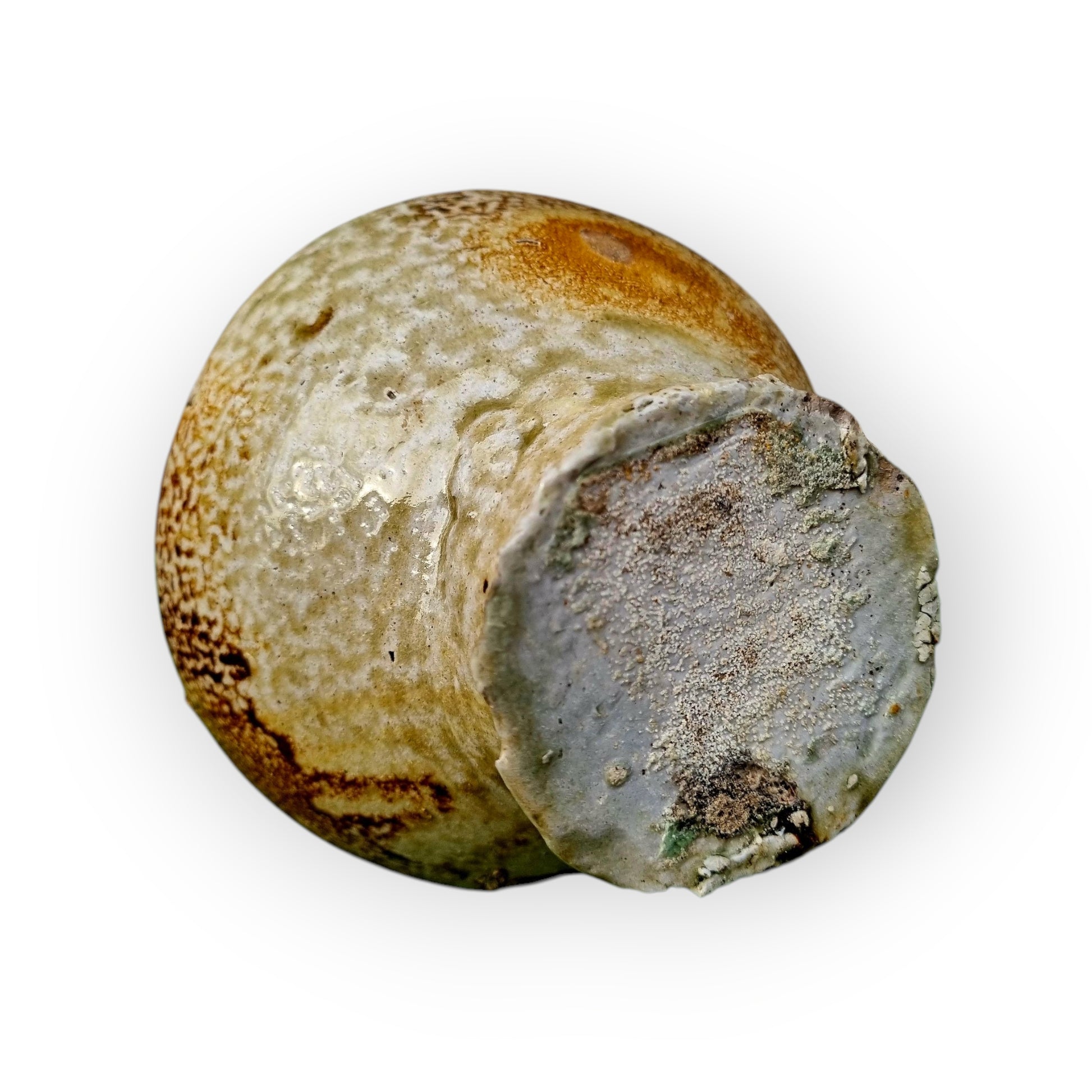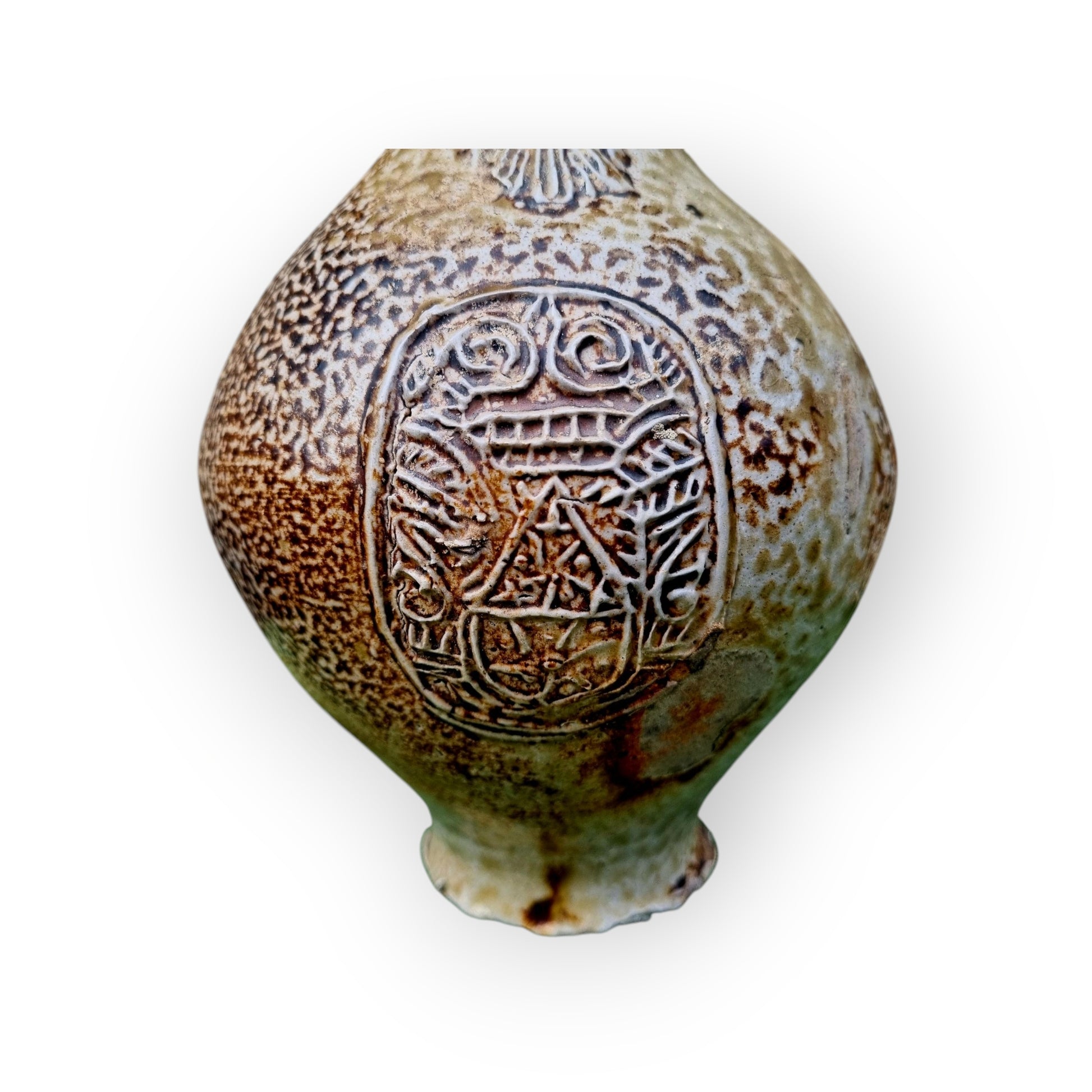 Decorated with salt-glaze, producing a "tiger-glaze" once fired in the kiln.