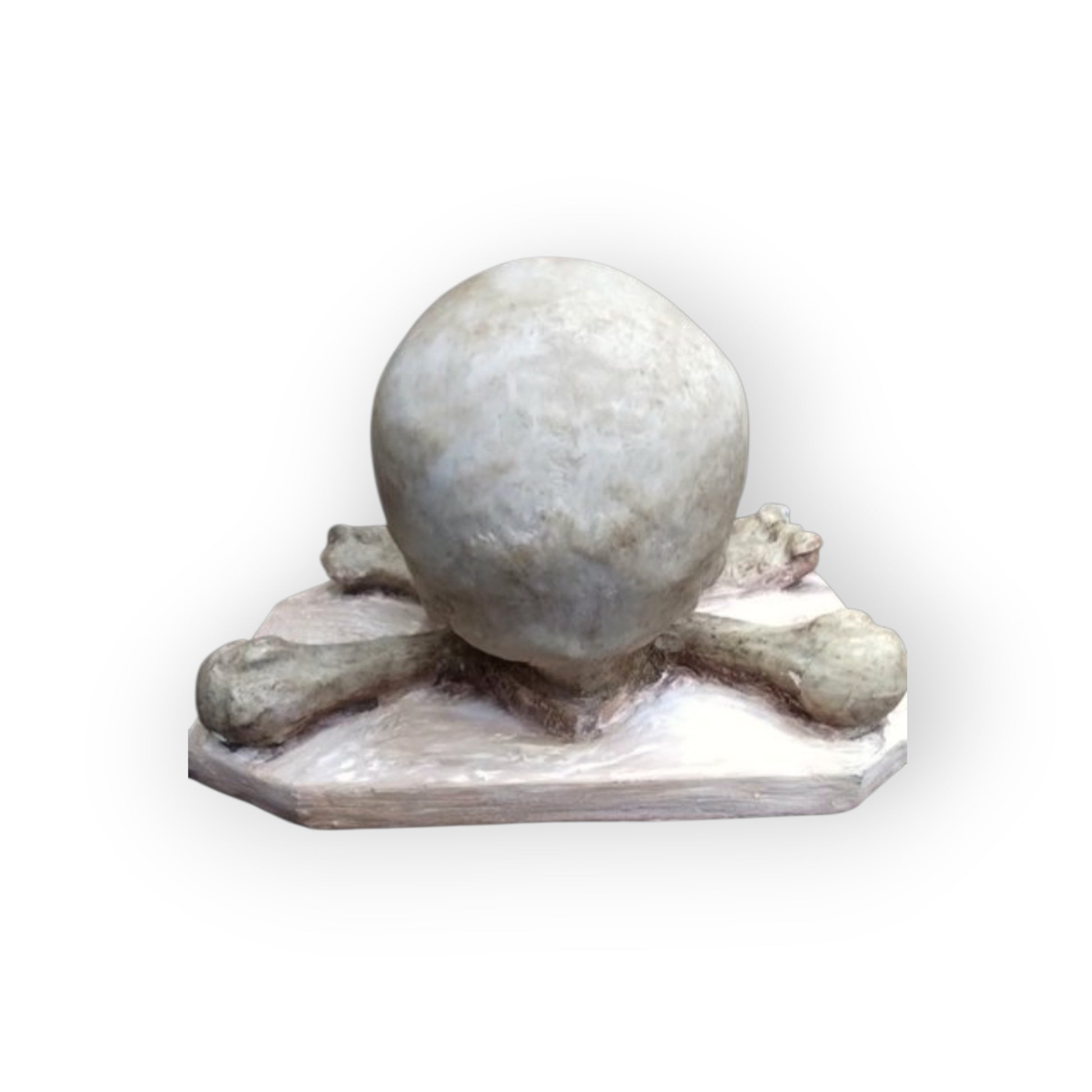 The skull is carved with deep eye sockets, defined cheekbones, and a well‑modelled jaw, resting above a pair of crossed tibiae. The contrast between the polished surfaces and natural stone veining gives the sculpture a dramatic, tactile quality. This is a classic memento mori motif — a reminder of mortality that has appeared in European art for centuries.