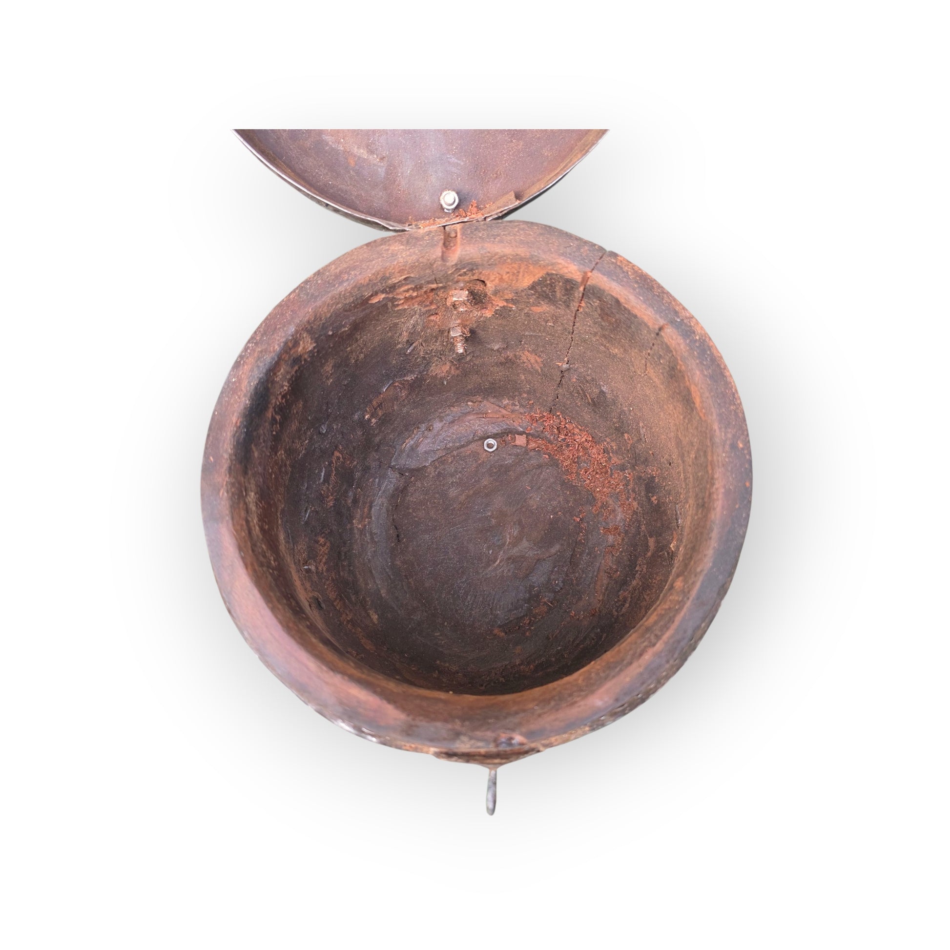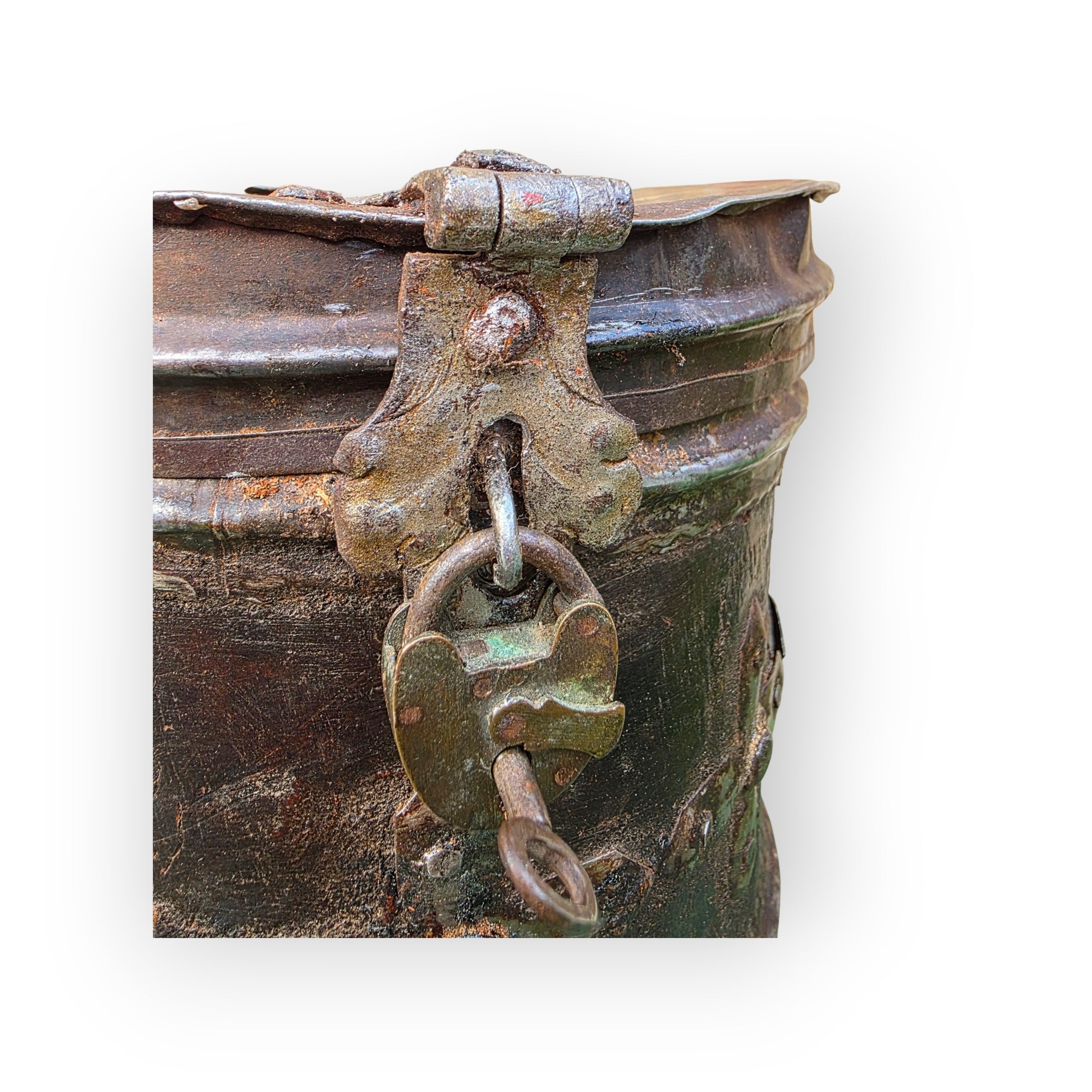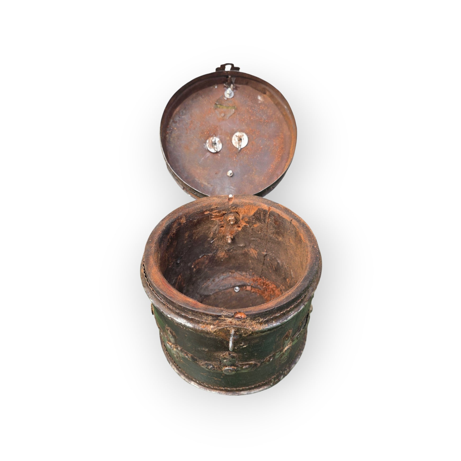 A characterful 18th-century continental alms box, crafted in wood and metal with a cylindrical form and circular lid. Traditionally used for charitable offerings in ecclesiastical or civic settings, this example evokes the quiet dignity of European public giving.