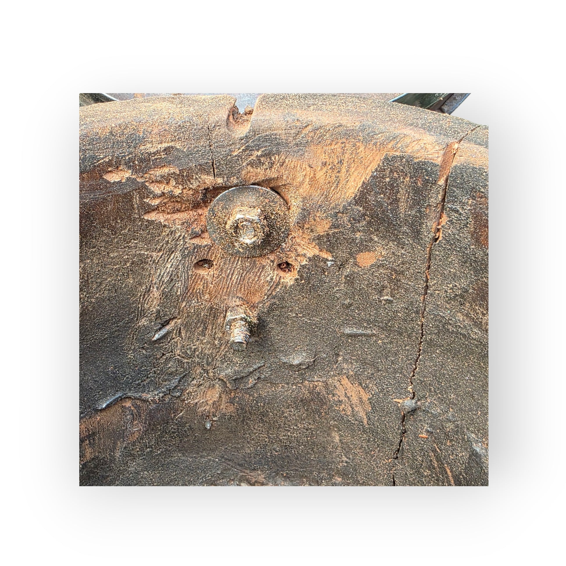 The carcass has been dug out and hewn from a single piece of timber. The external surface is decorated with metal embellishments and keep for the hasp. The lid, with a coin aperture, is made from sheet metal with a carry handle and hasp. The padlock is of a later date.