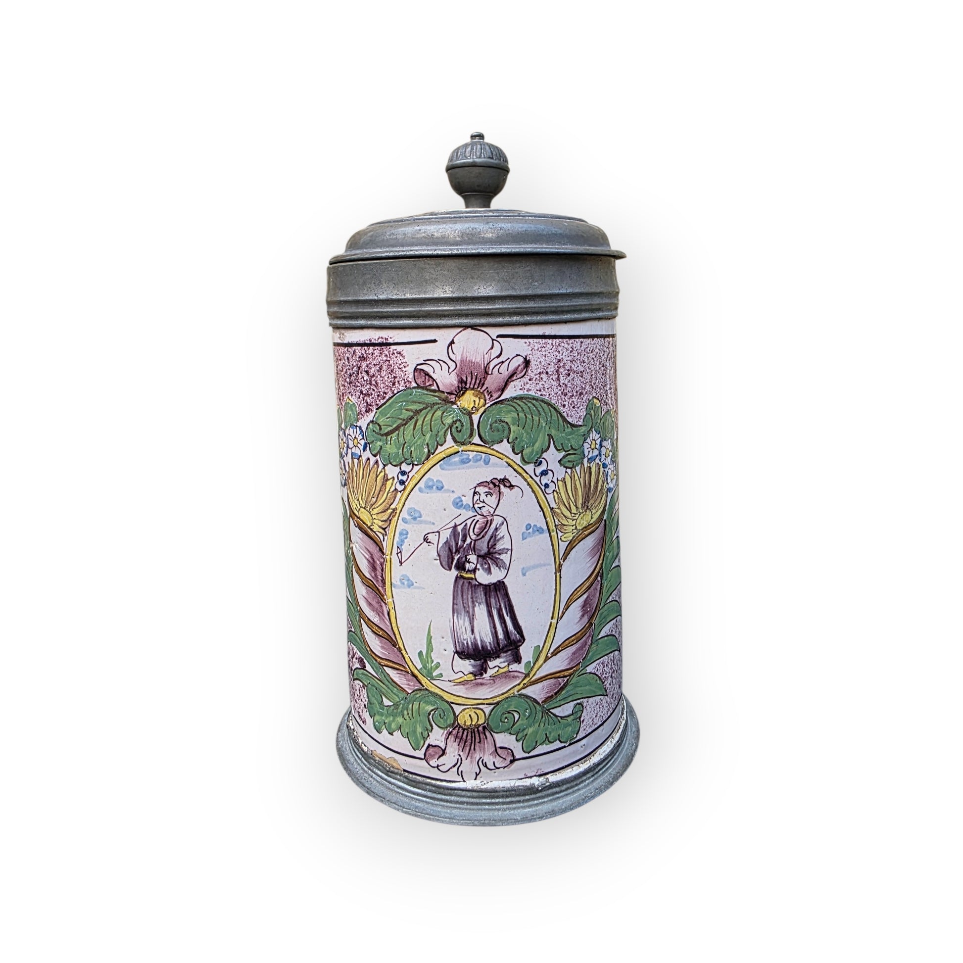 18th‑Century Antique Faience / Tin-Glazed Earthenware Tankard – Lid Inlaid with a Medal of Louis XV
