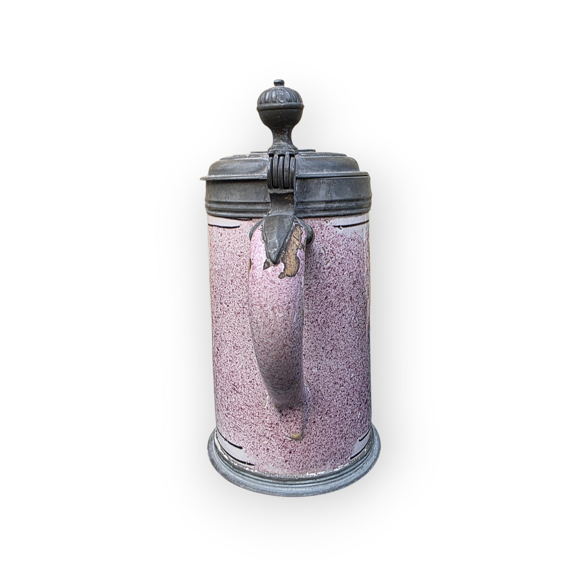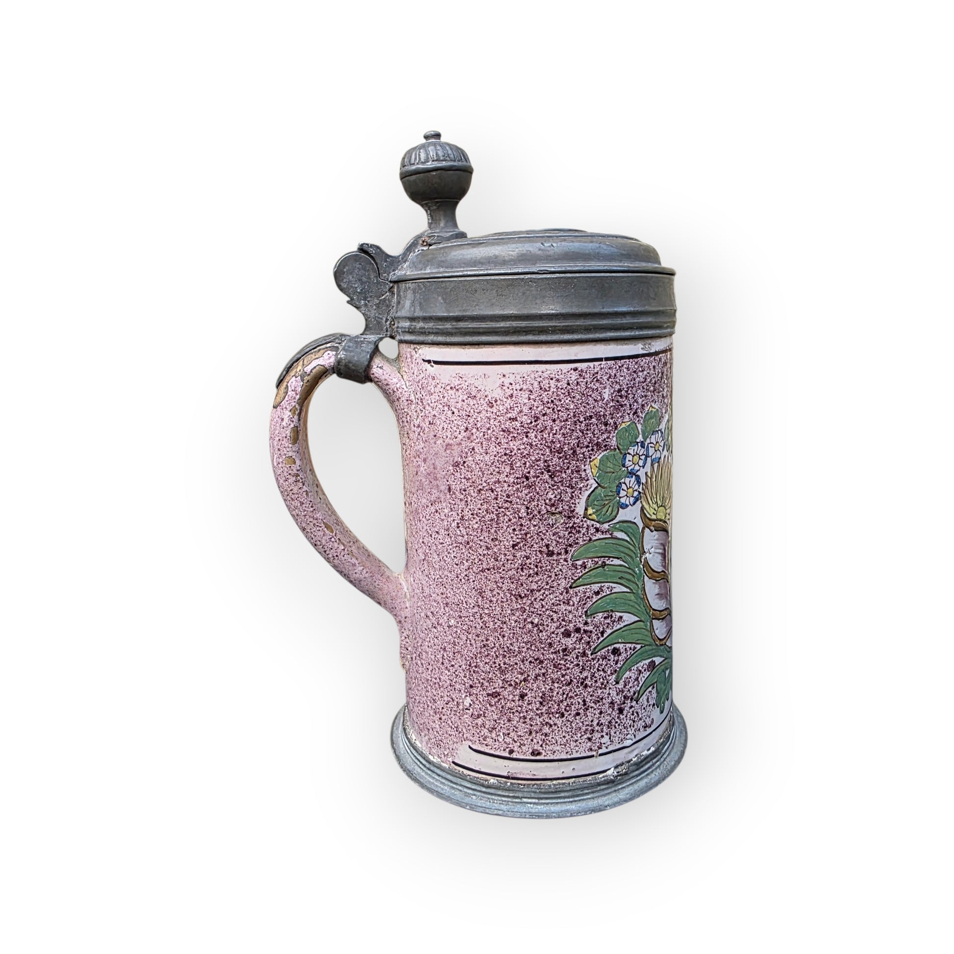 Tankards of this type were often produced in faience centres such as Ansbach, Schrezheim, and Bayreuth, where potters combined tin‑glazed earthenware with metal mounts to create luxurious drinking vessels.