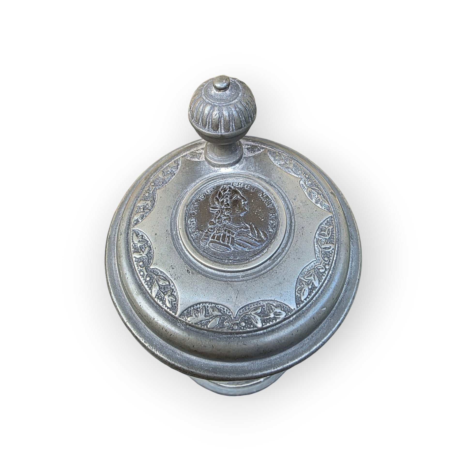 Louis XV reigned from 1715 to 1774. This is likely a French medal or jeton (token) from his reign, inset into the lid of a German-made tankard. The classical Roman-style portrait with the laurel wreath was a common way to depict French monarchs in the 18th century, following the tradition of depicting kings in the manner of Roman emperors.