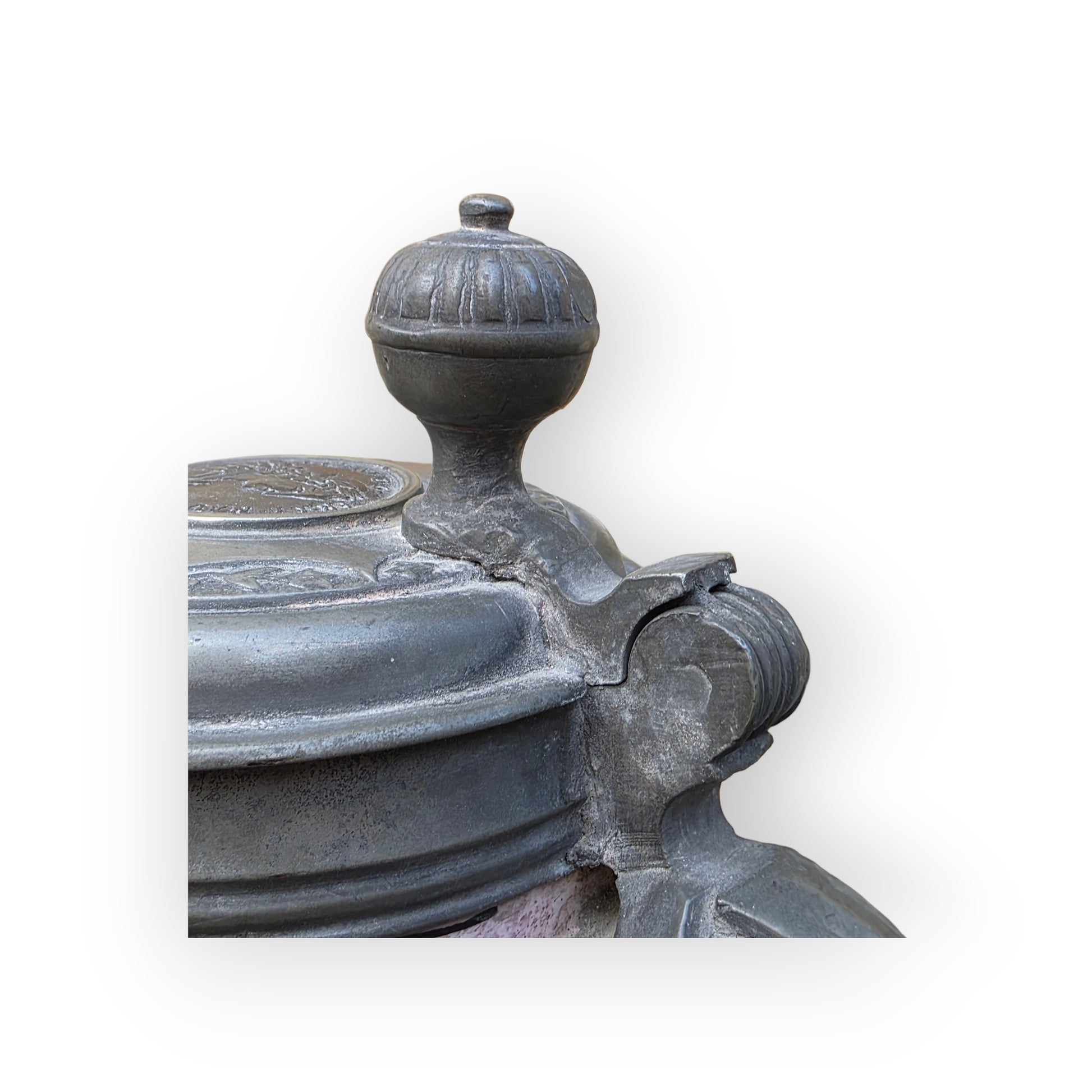 Condition: French faience with pewter‑mounted lid. Lid inlaid with a portrait medal of Louis XV. Hand‑painted decoration in tin glaze on an earthenware body. Age‑related wear and small blemishes. No structural issues. Photos show the actual item.