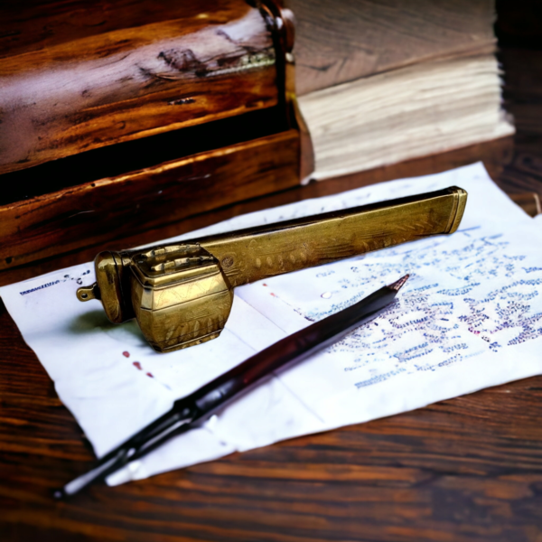 The form is compact yet refined, with a shaped base, integrated inkwell, and slot for a quill. Brass was favoured for its durability and aesthetic warmth, often used in personal deskware and clerical instruments. Such items were essential in courts, libraries, and merchant offices, where legibility and permanence were paramount.