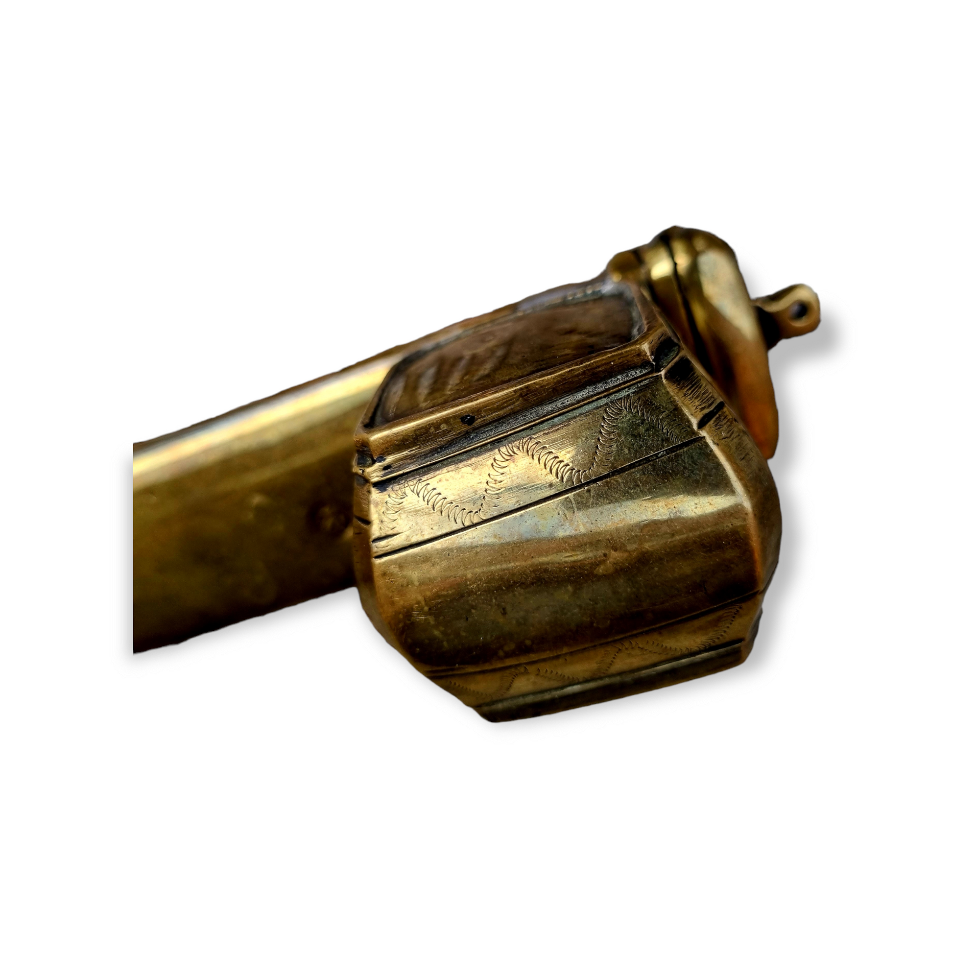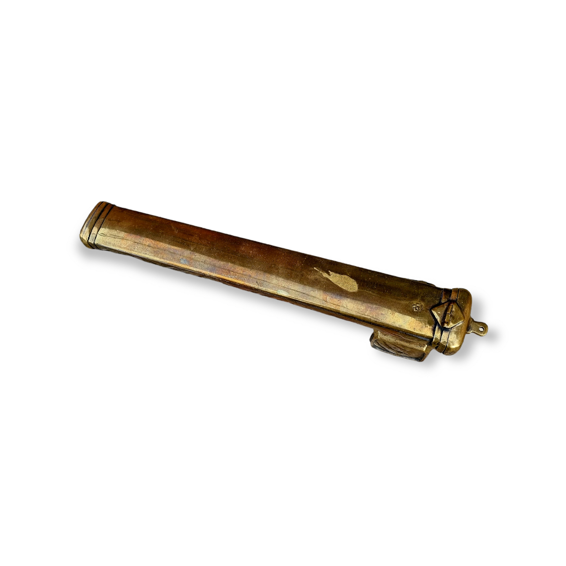 An elegant 18th-century Continental brass quill pen holder and inkwell, used by a scribe—a professional copyist or record keeper—during the Enlightenment era. Crafted with precision and patinated by time, this piece embodies the scholarly tools of a pre-industrial world.