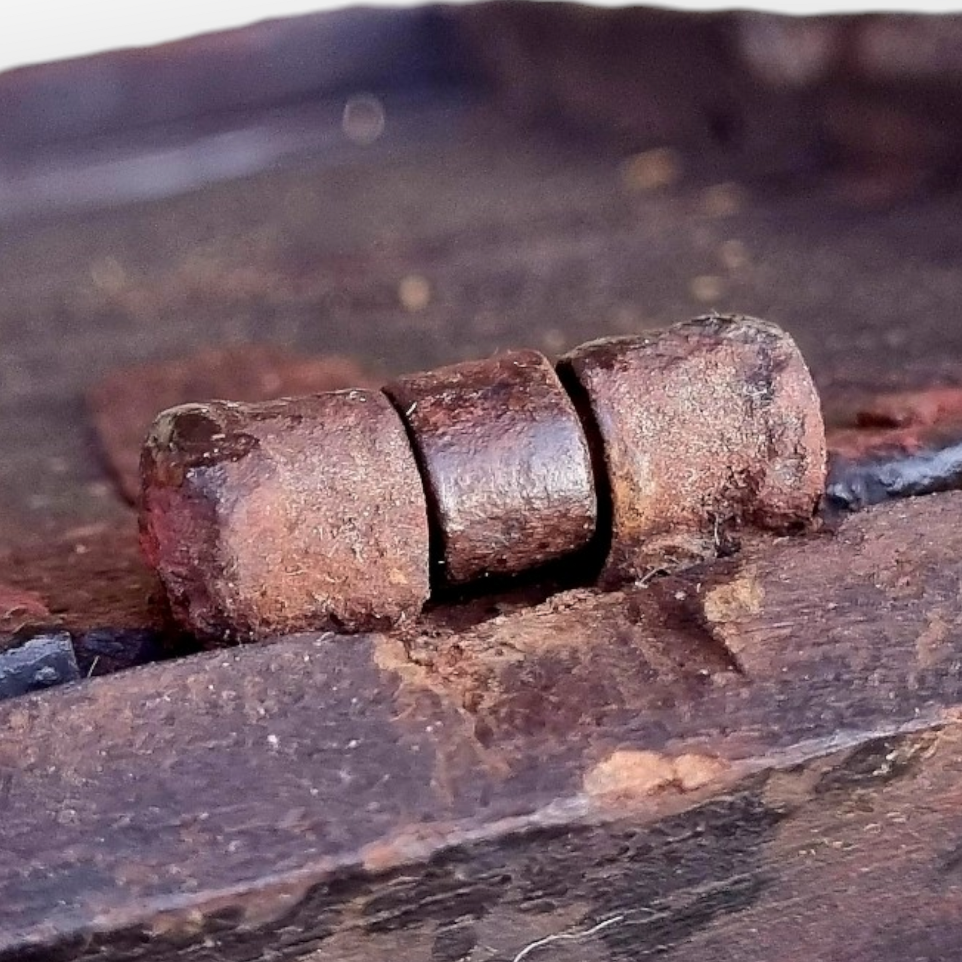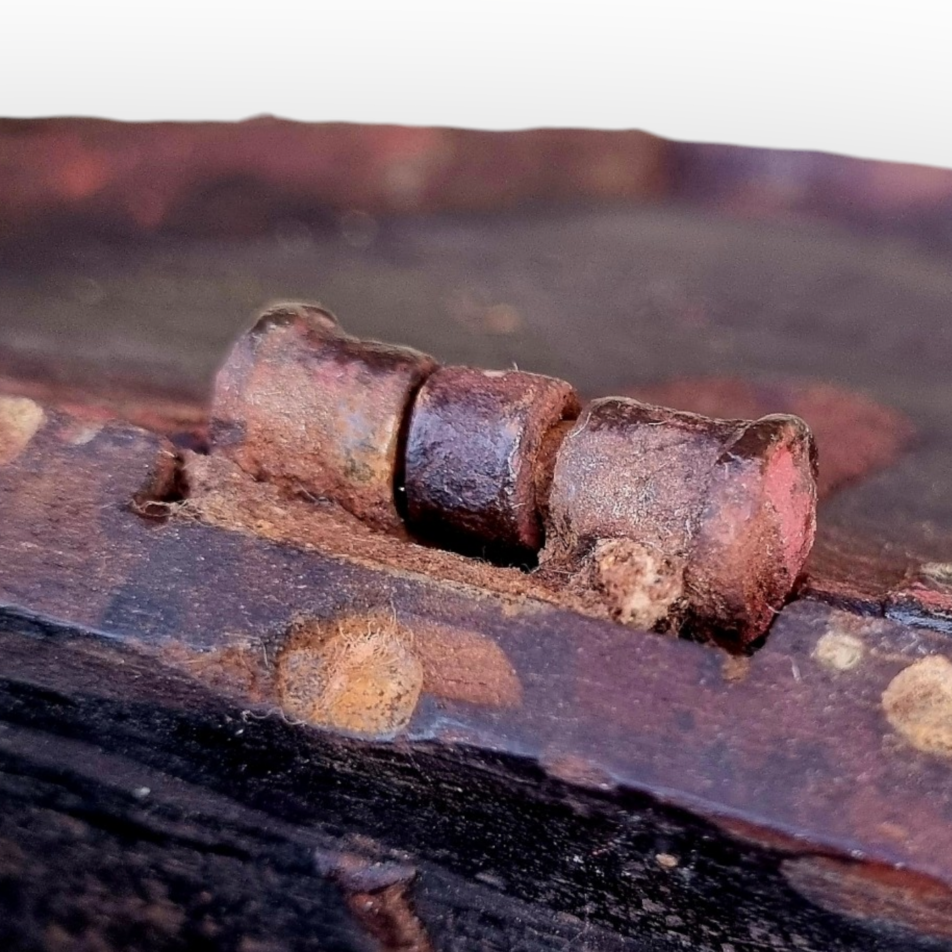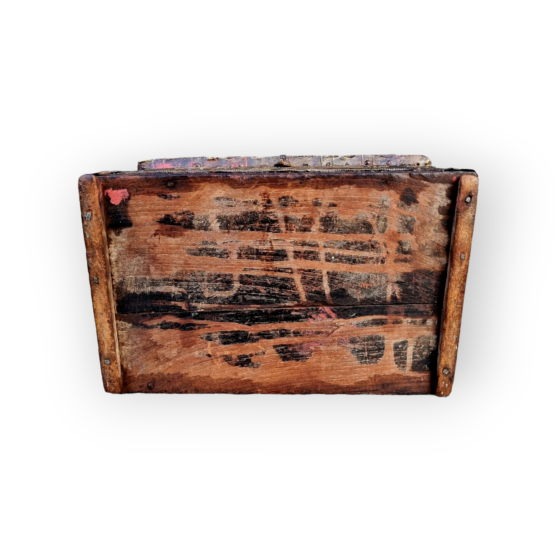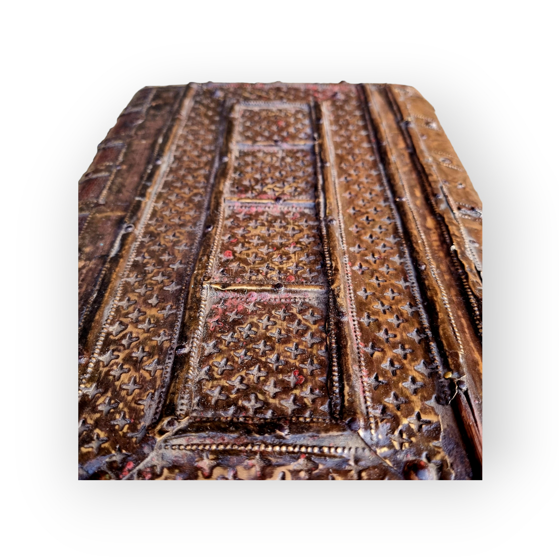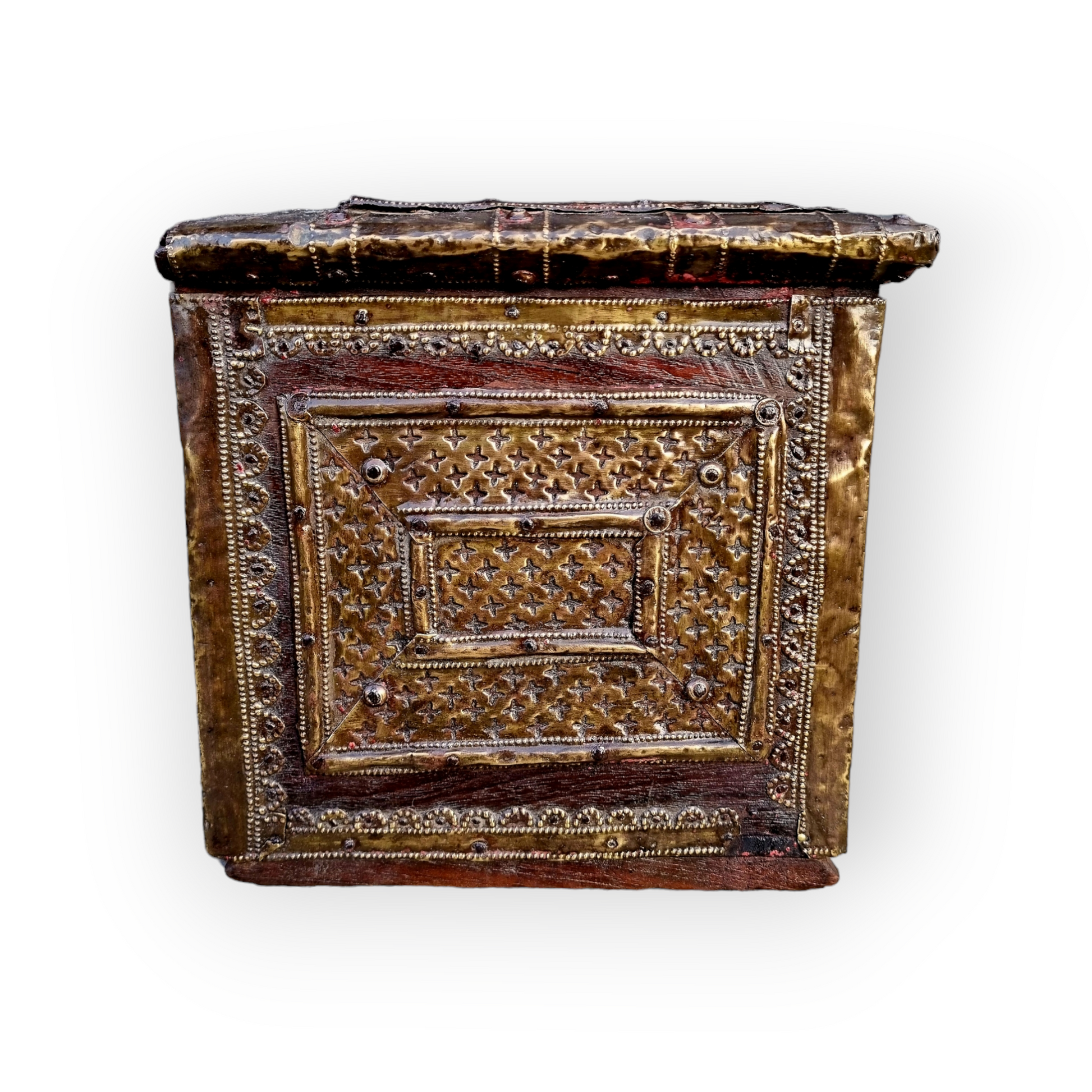 The external surfaces clad in repousee-worked brass with traces of polychrome. The back board is decorated with brass lattice-work. The lid is joined to the carcass by way of old iron hinges and opens to reveal a void interior.
