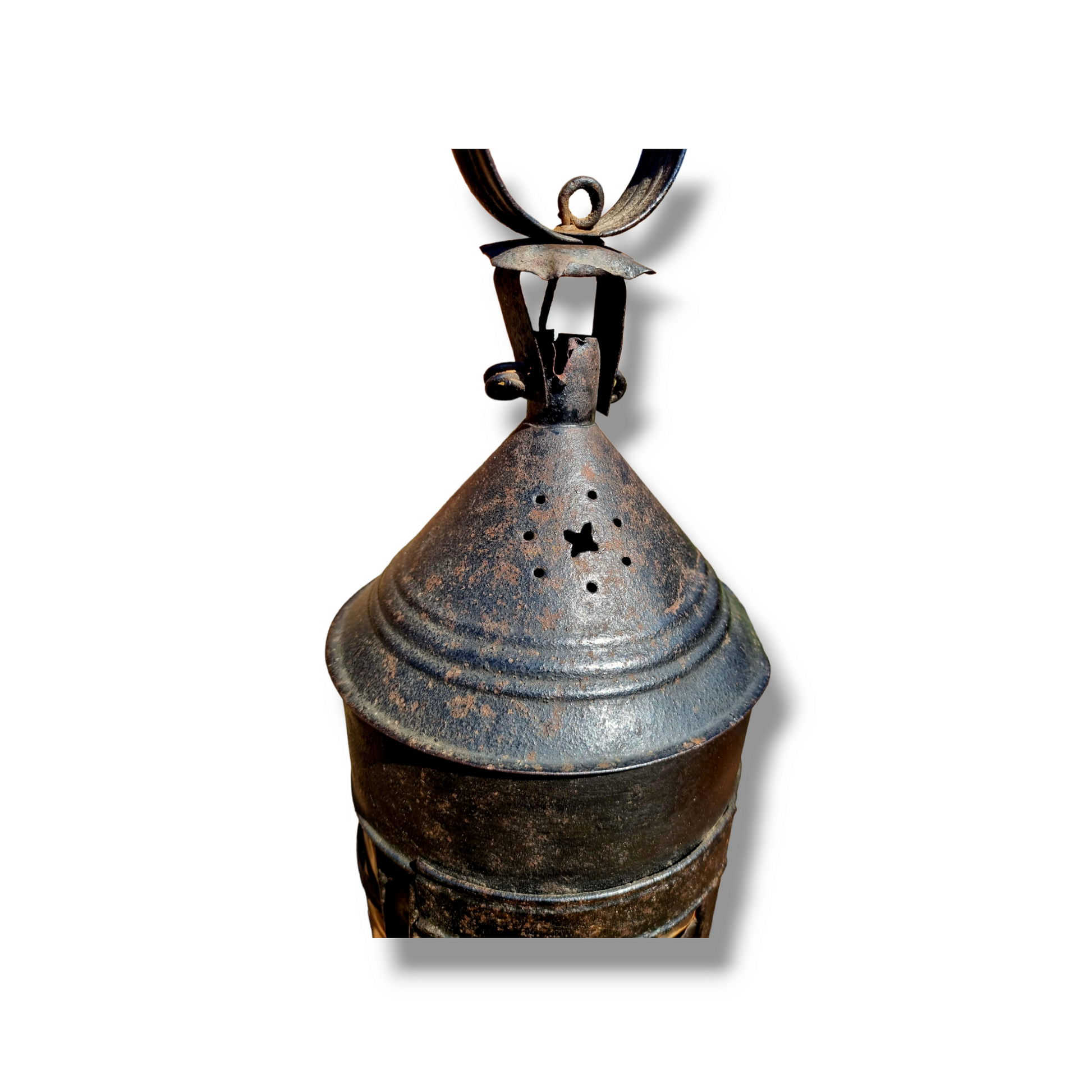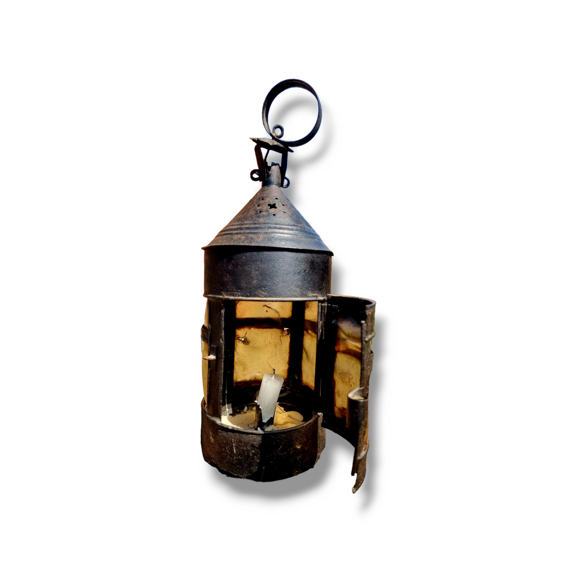 With a hanging hoop over a conical lid with decorative cut-out vents and below, an elongated body with light apertures glazed with bovine horn and a single door which opens to reveal an interior fitted with a single candlesconce.