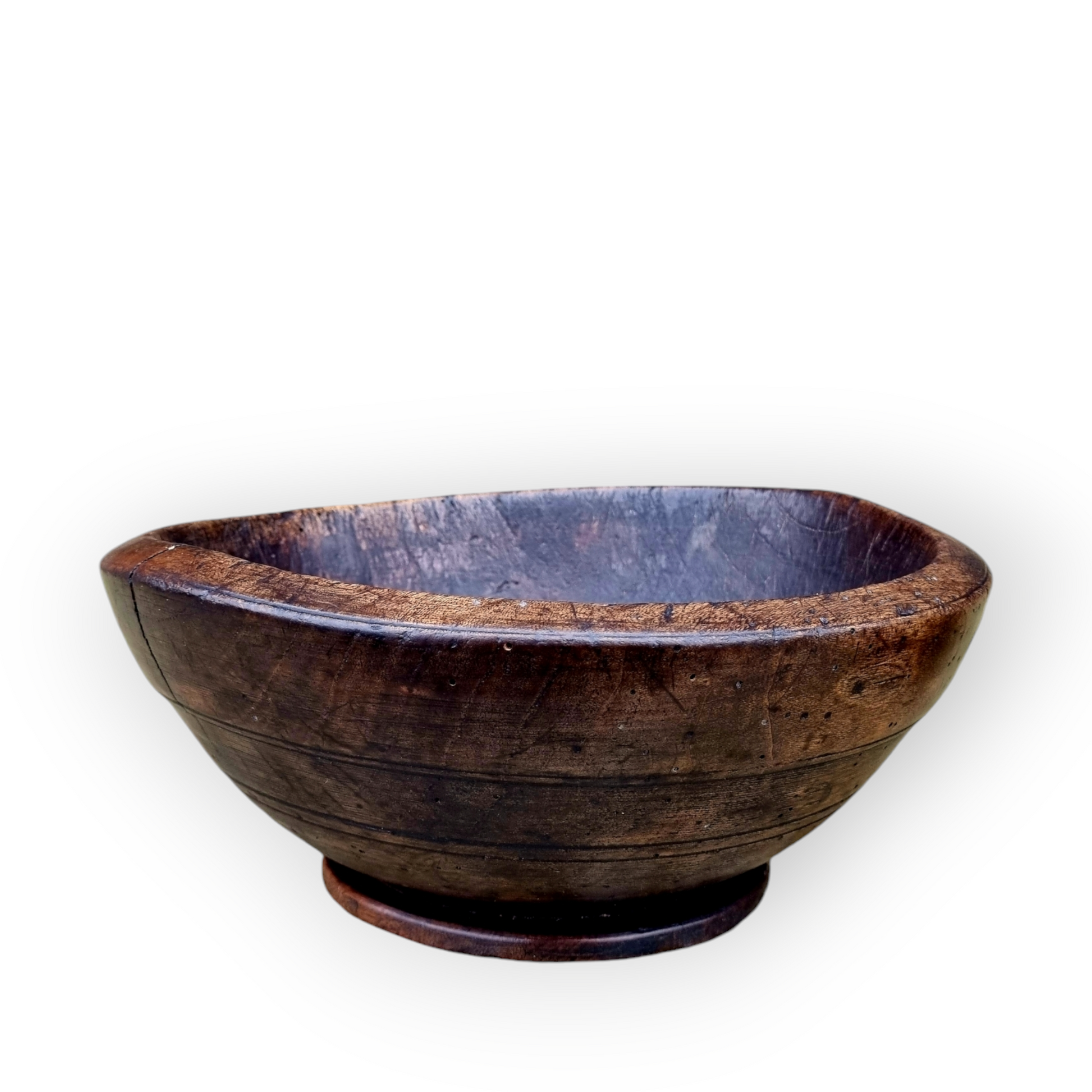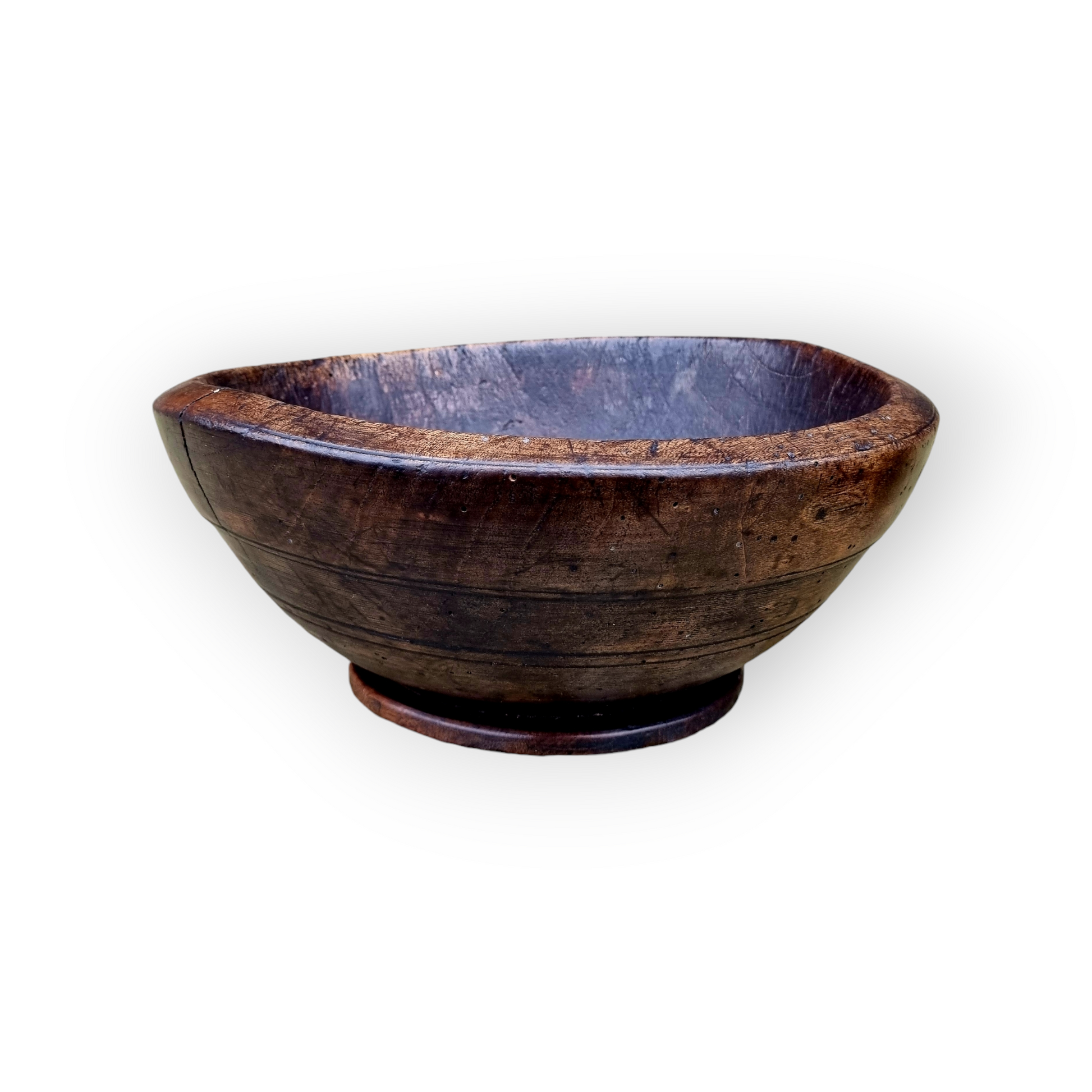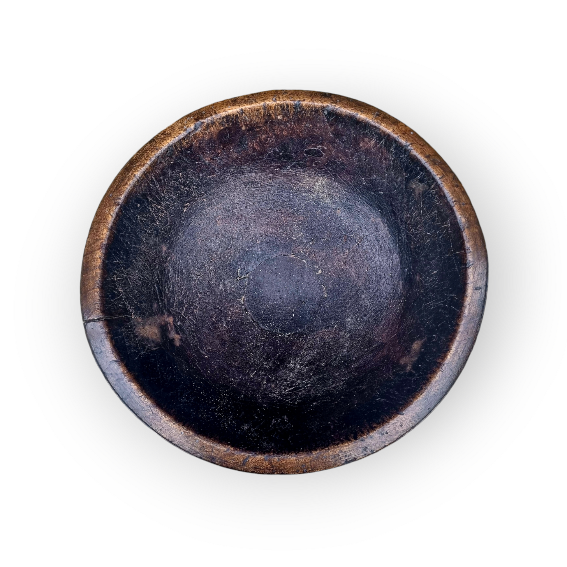 This bowl has been well used, so much so, that the base has worn through and has been repaired historically with the application of an additional circular piece of timber to the underside of the base.
