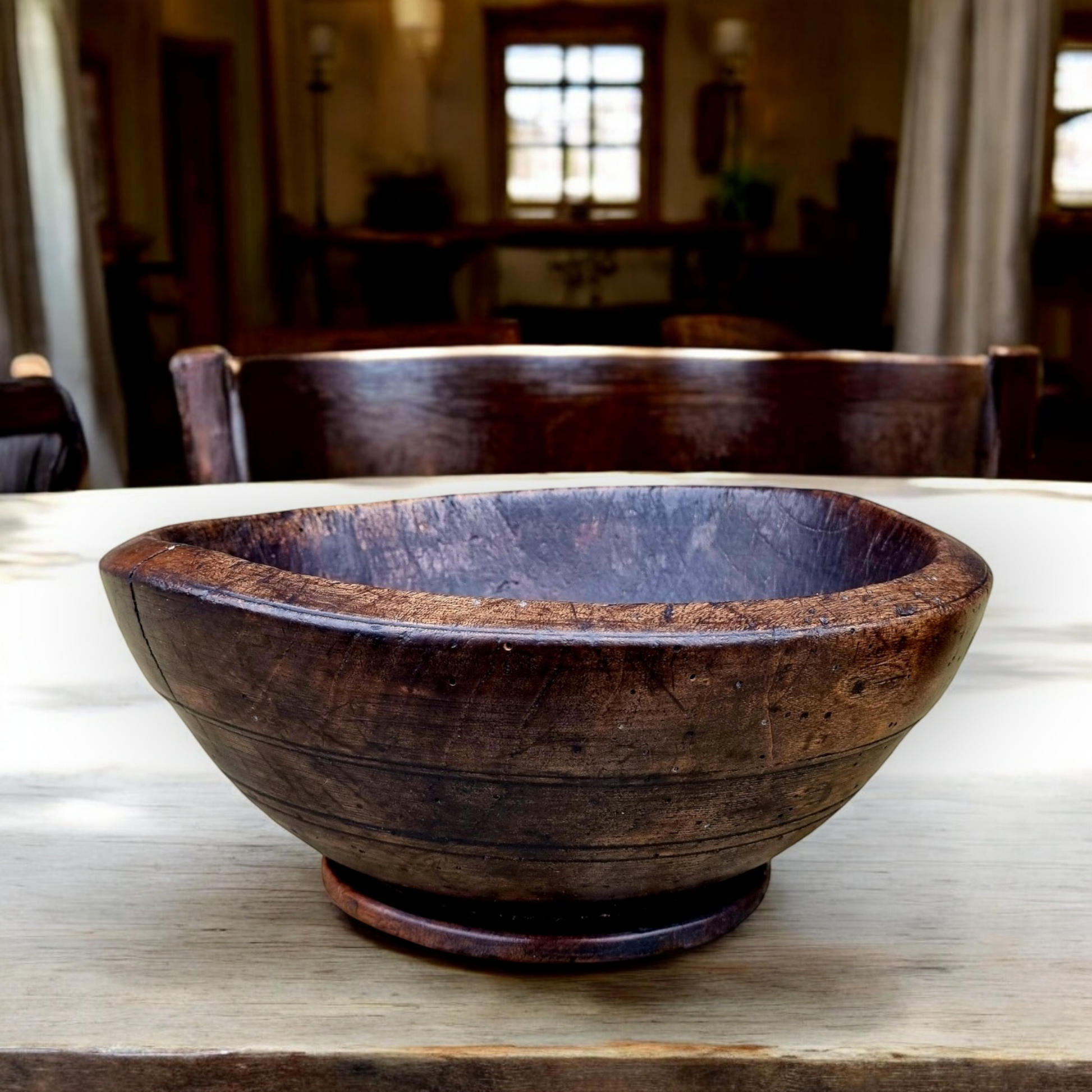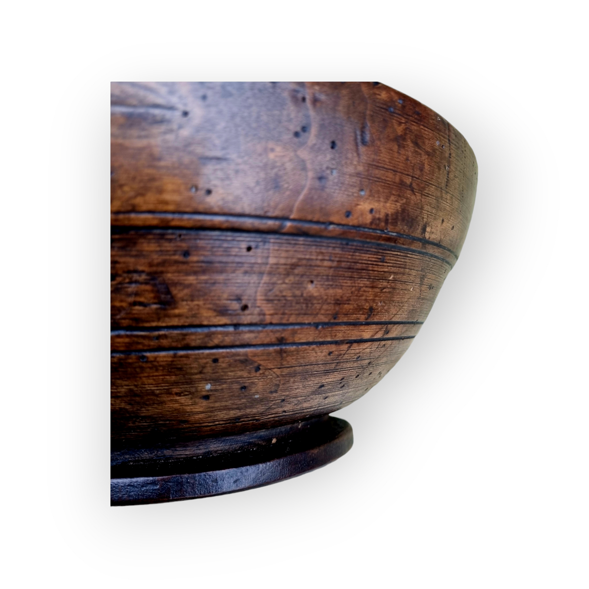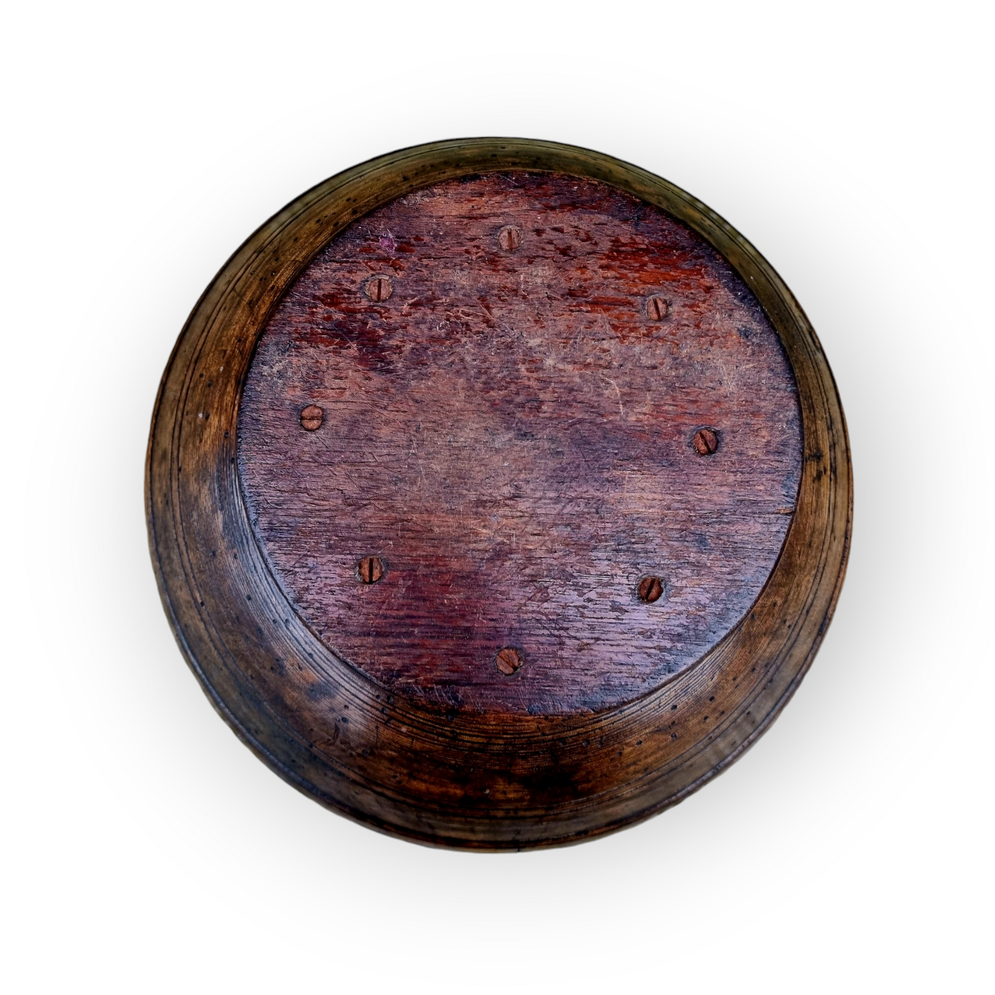 This bowl has been well used, so much so, that the base has worn through and has been repaired historically with the application of an additional circular piece of timber to the underside of the base.