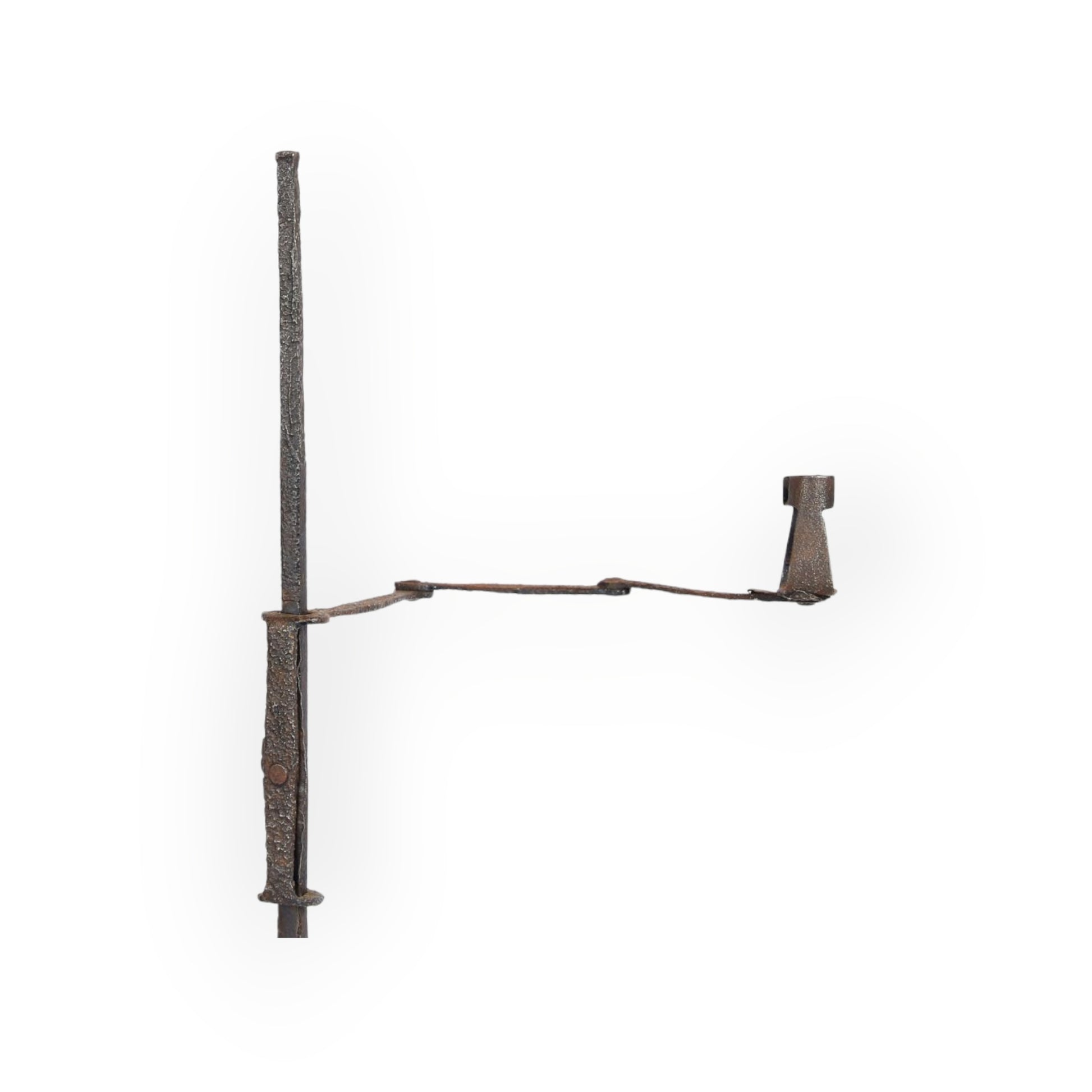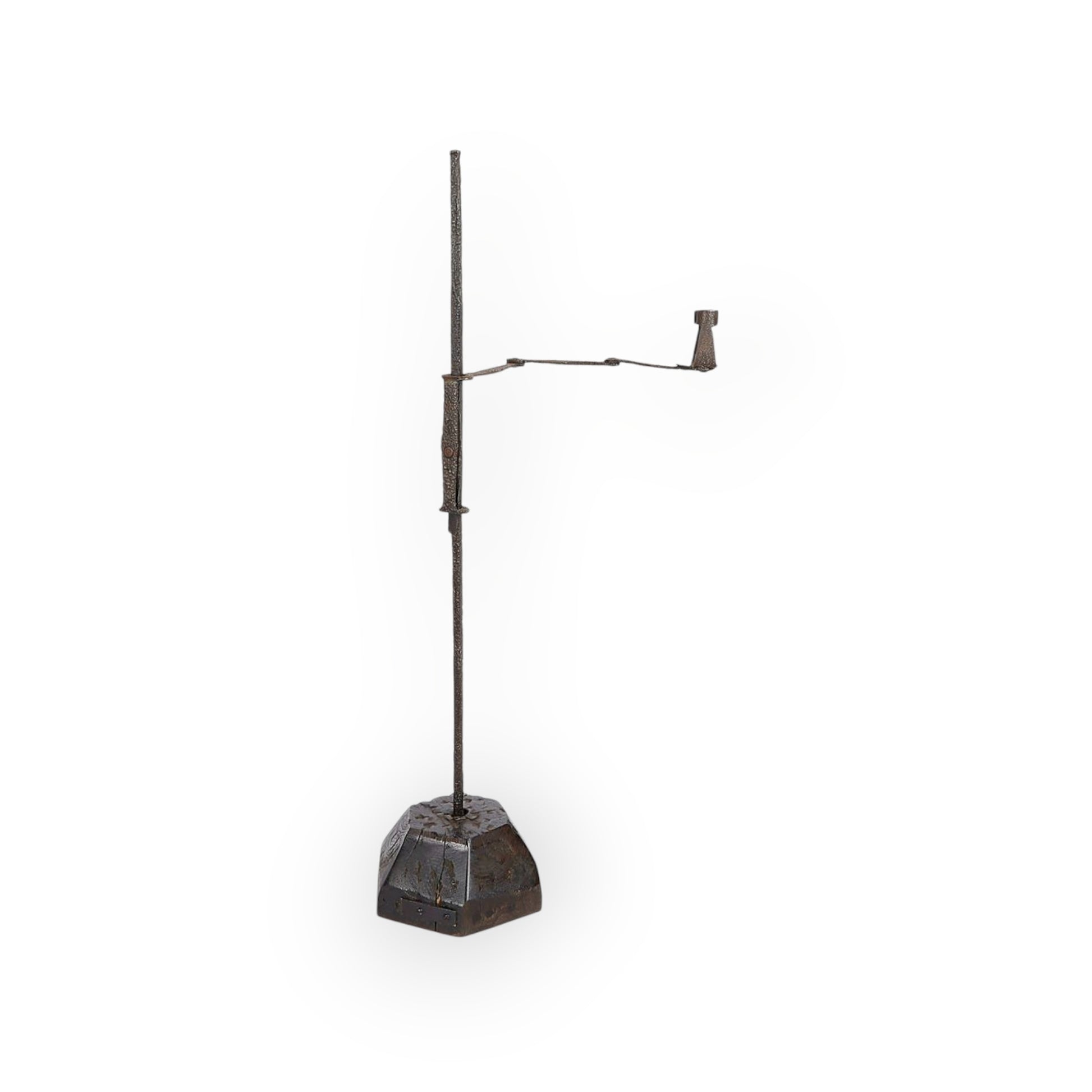 The candleholder is situated at the end of an articulated, retractable arm, connected to an iron upright stem by way of a rise-and-fall bracket, held against the stem by a sprung tensioner.