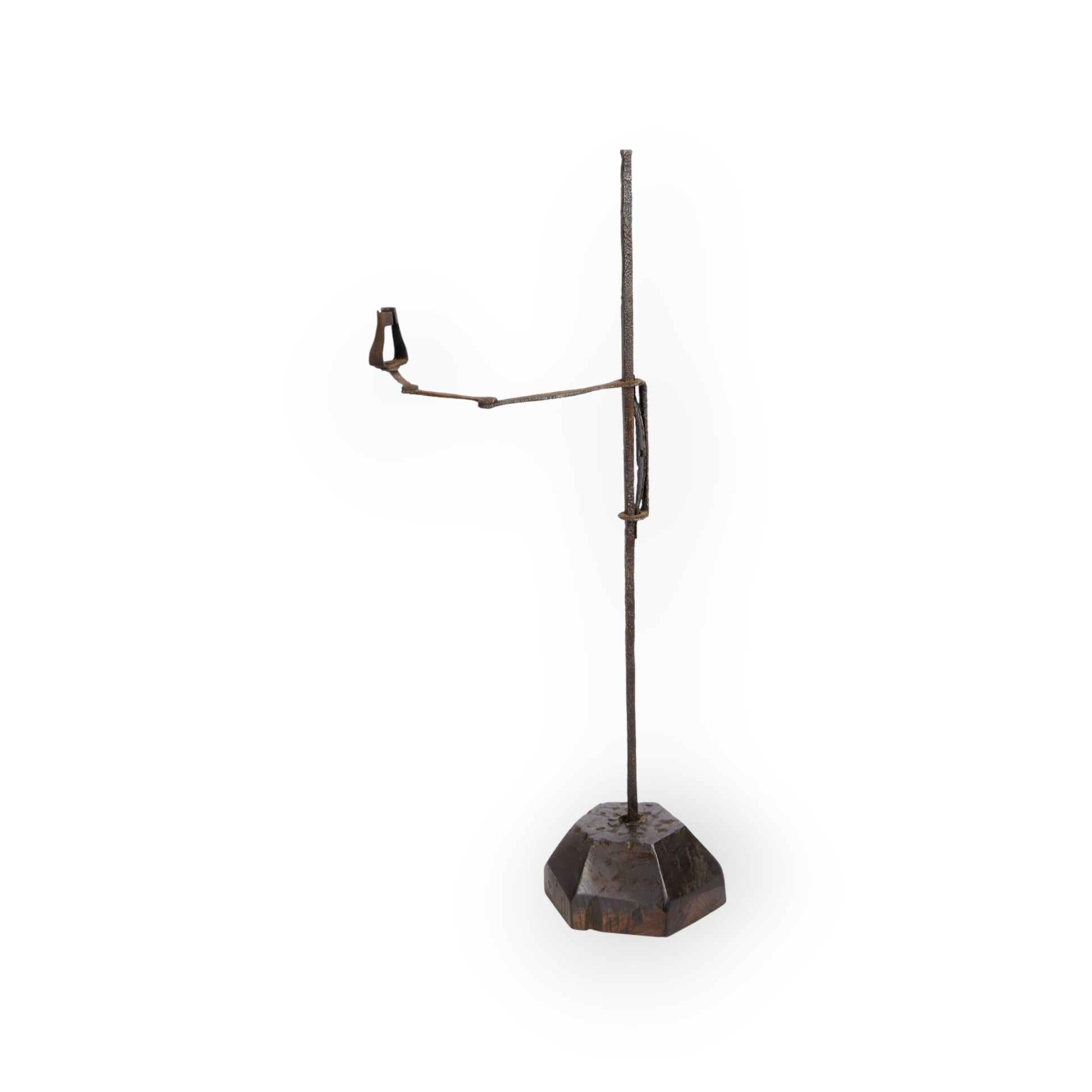 A Large, Rustic, 18th Century English Antique Wrought Iron Adjustable Candleholder On A Hexagonal Wooden Base