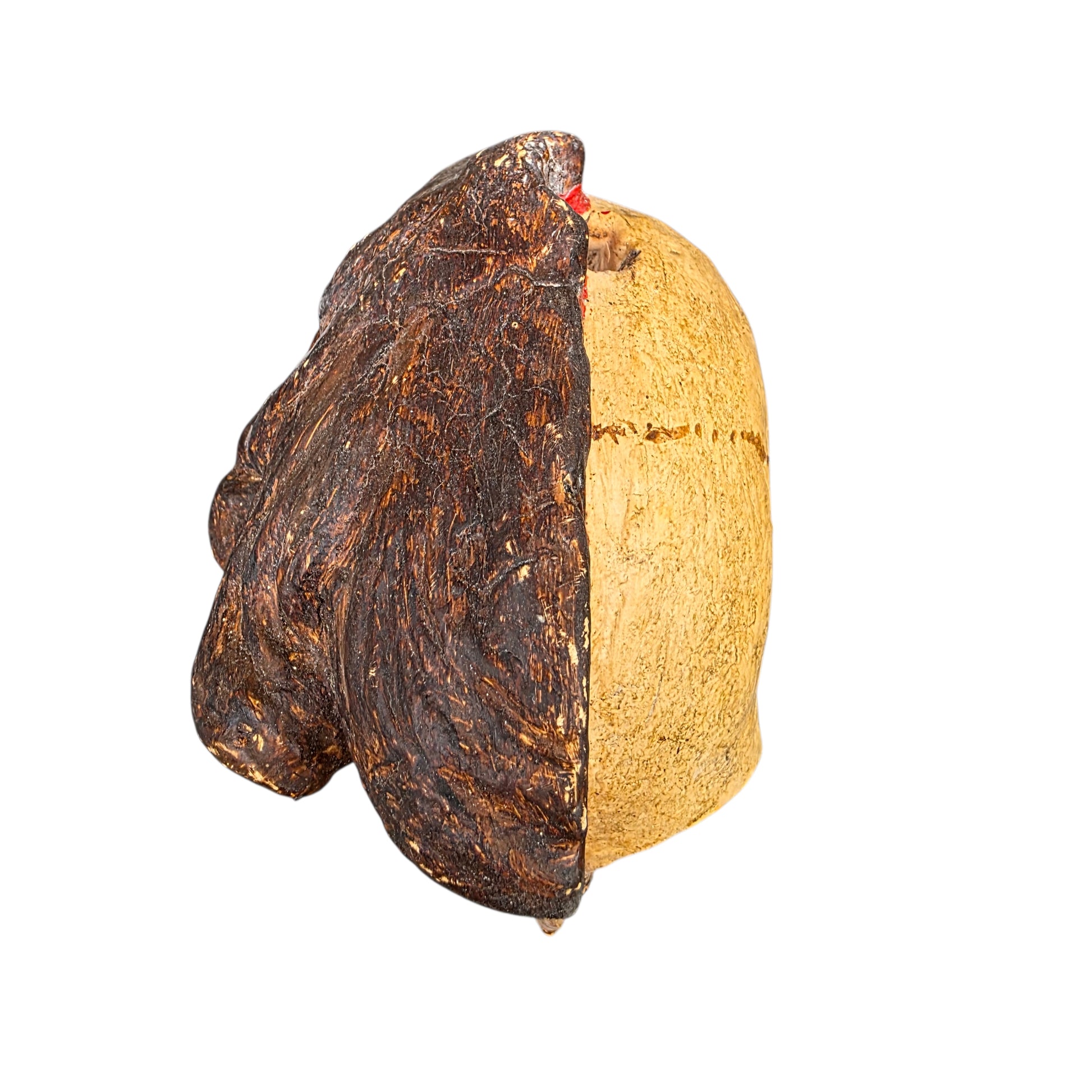 A powerful and visually arresting memento mori bust, this sculptural piece explores the eternal duality of life and death. Split vertically down the centre, the left half portrays a stylised human visage complete with hair, eye, and moustache, while the right half reveals the skeletal structure beneath — hollow eye socket, exposed teeth, and jaw rendered with anatomical precision. Mounted on a tiered ebonised pedestal, the bust evokes themes of mortality, transience, and philosophical reflection.