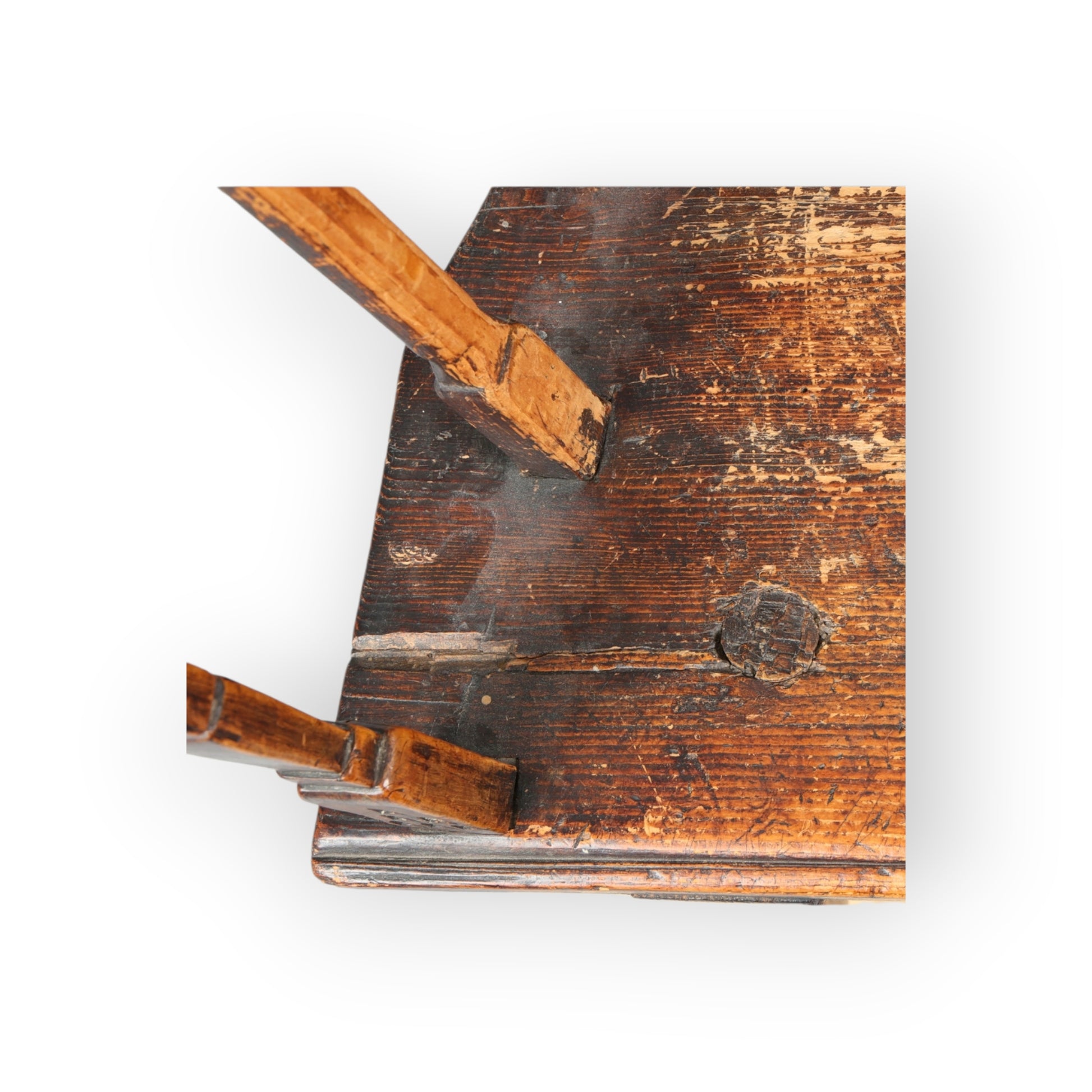 Condition: Please refer to the images. There is a loss and a split to the left of the seatboard. There are age-related splits to some of the spindles and two legs. There is general wear to the finish and other marks commensurate with age.