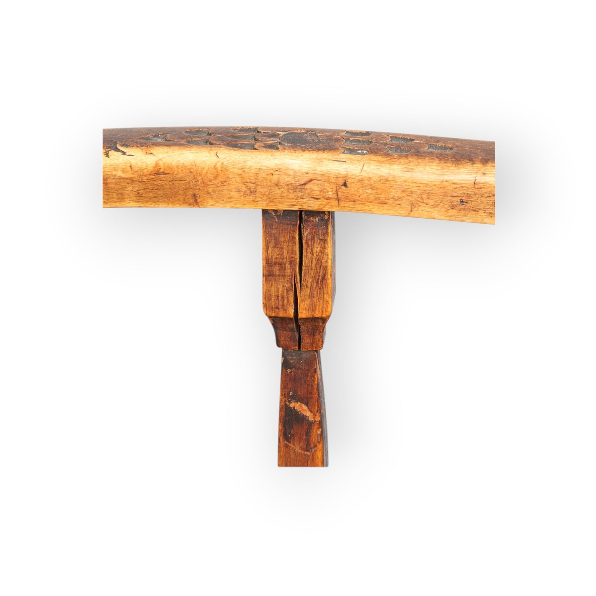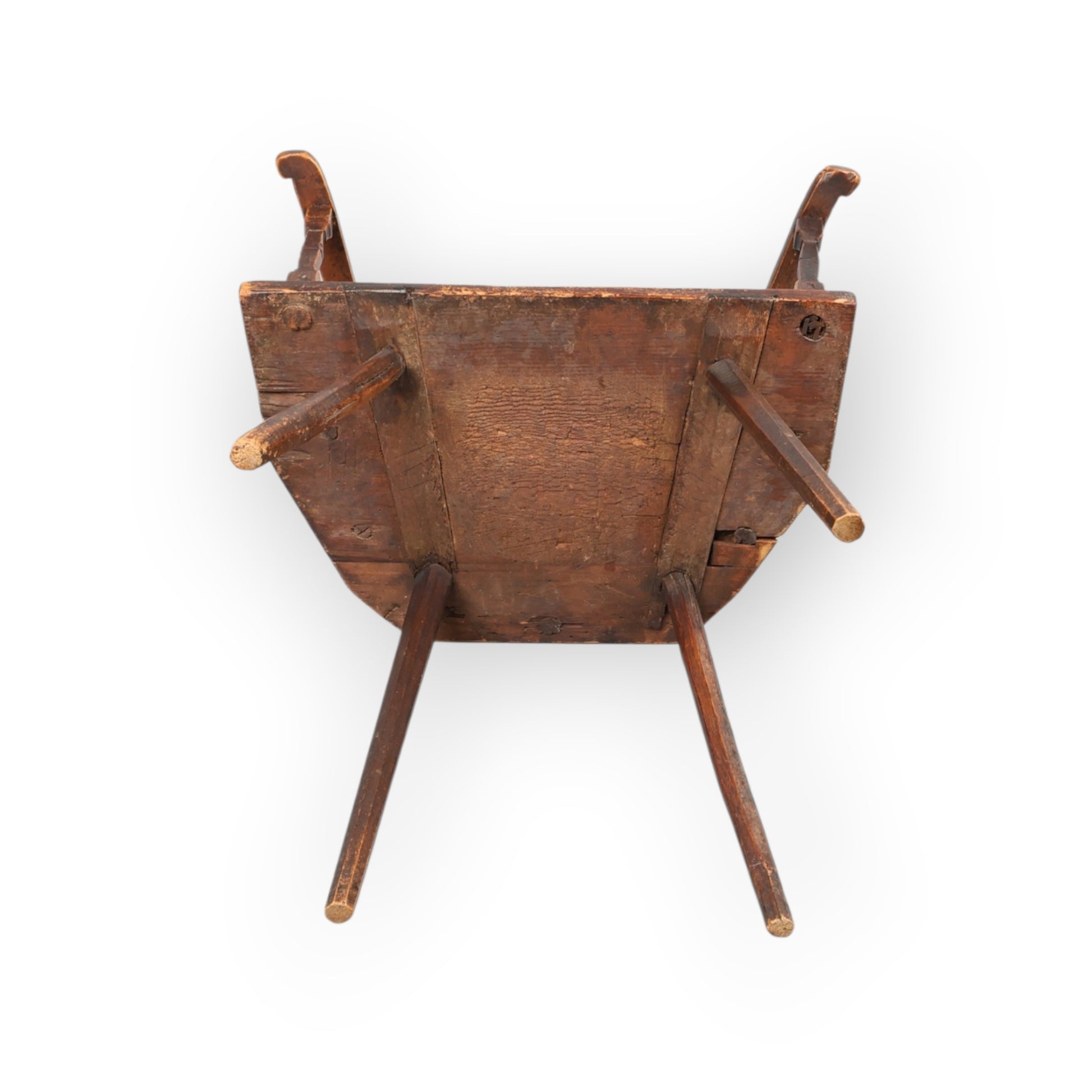 This is vernacular furniture at its most authentic: hand‑shaped, functional, and full of character. The seat is hewn from a single block of elm, with the irregular geometry and tool marks that define true primitive work. The back spindles are individually turned and set into the rail with charming asymmetry, giving the chair a sculptural, almost folk‑art presence.