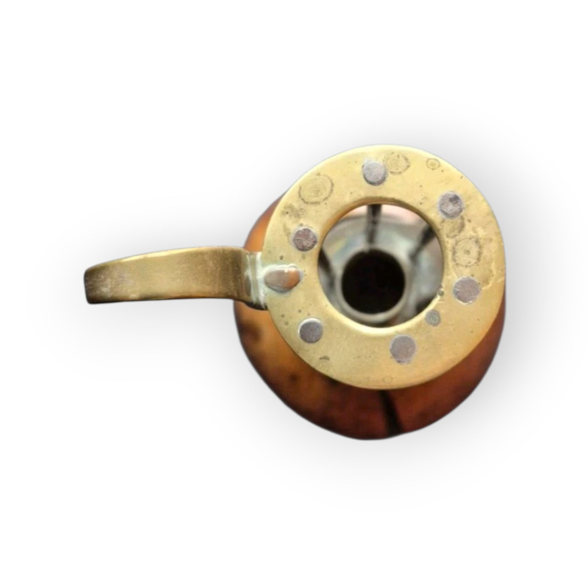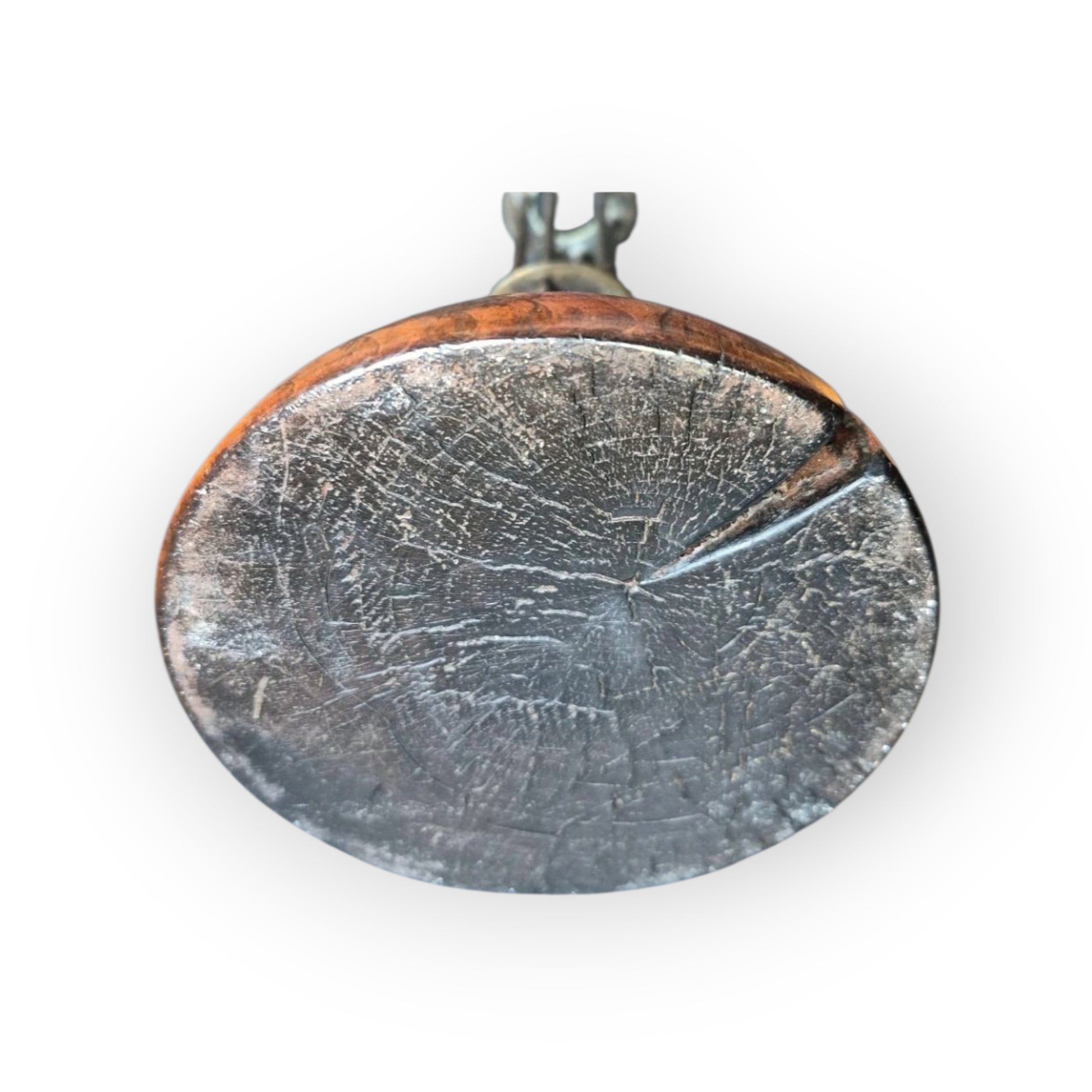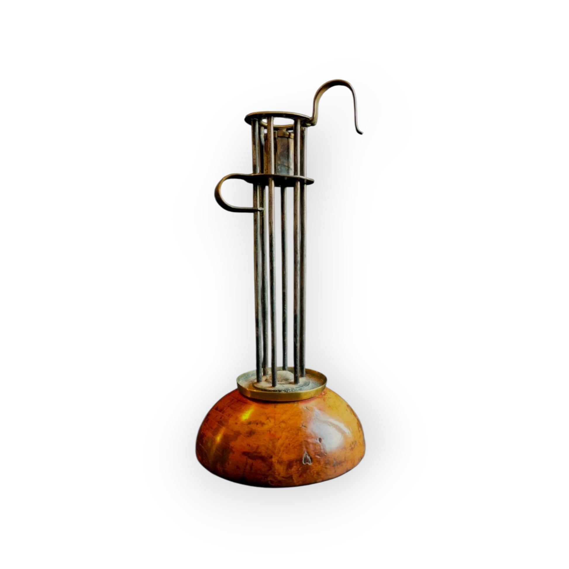 The candleholder is mounted on a beautifully aged domed base, likely crafted from pearwood, a timber prized for its fine grain and warm, mellow tone. A natural shrinkage crack has developed over time, adding to the authenticity and character of the piece, while the base remains securely attached to the brass structure above.