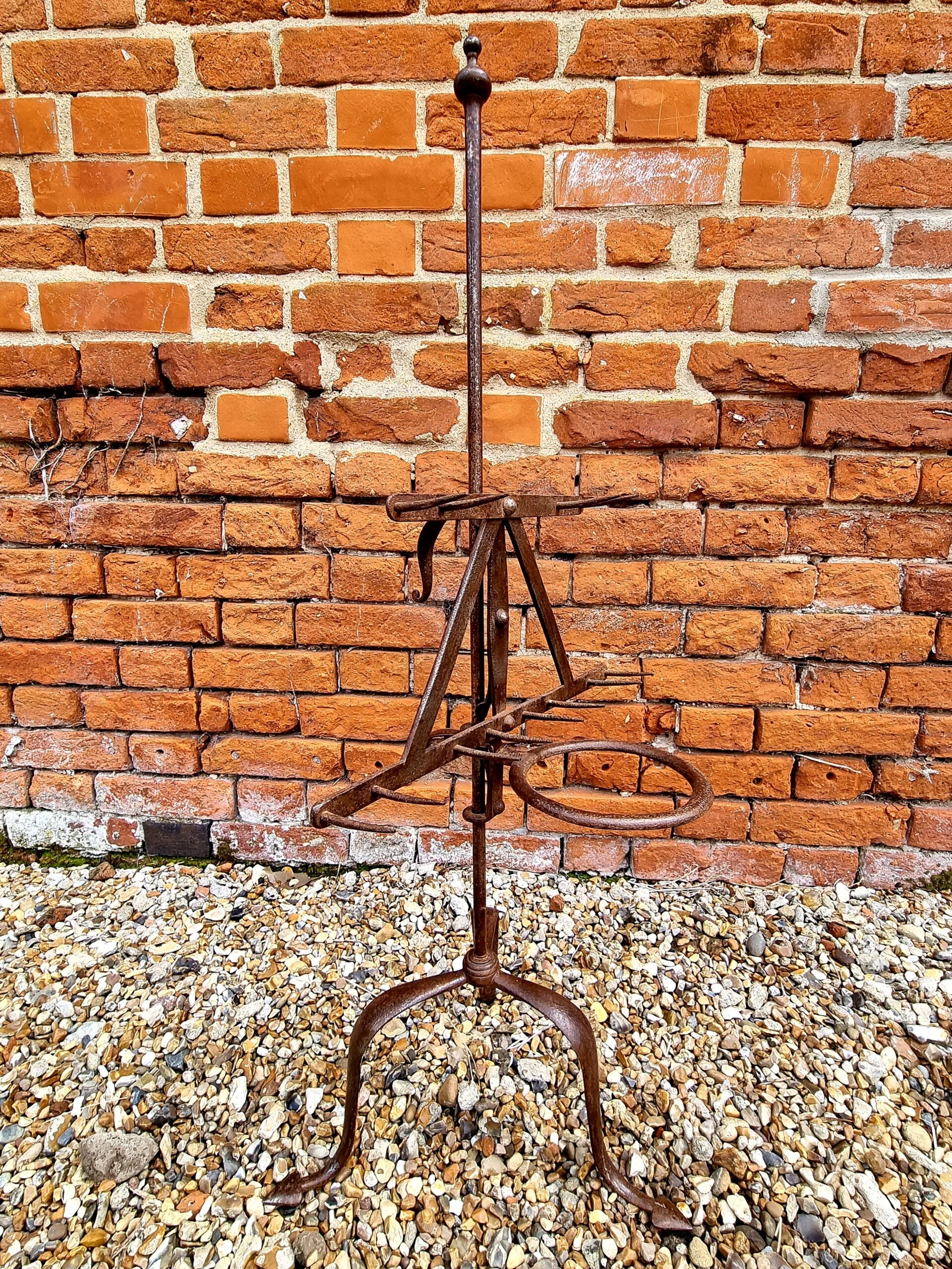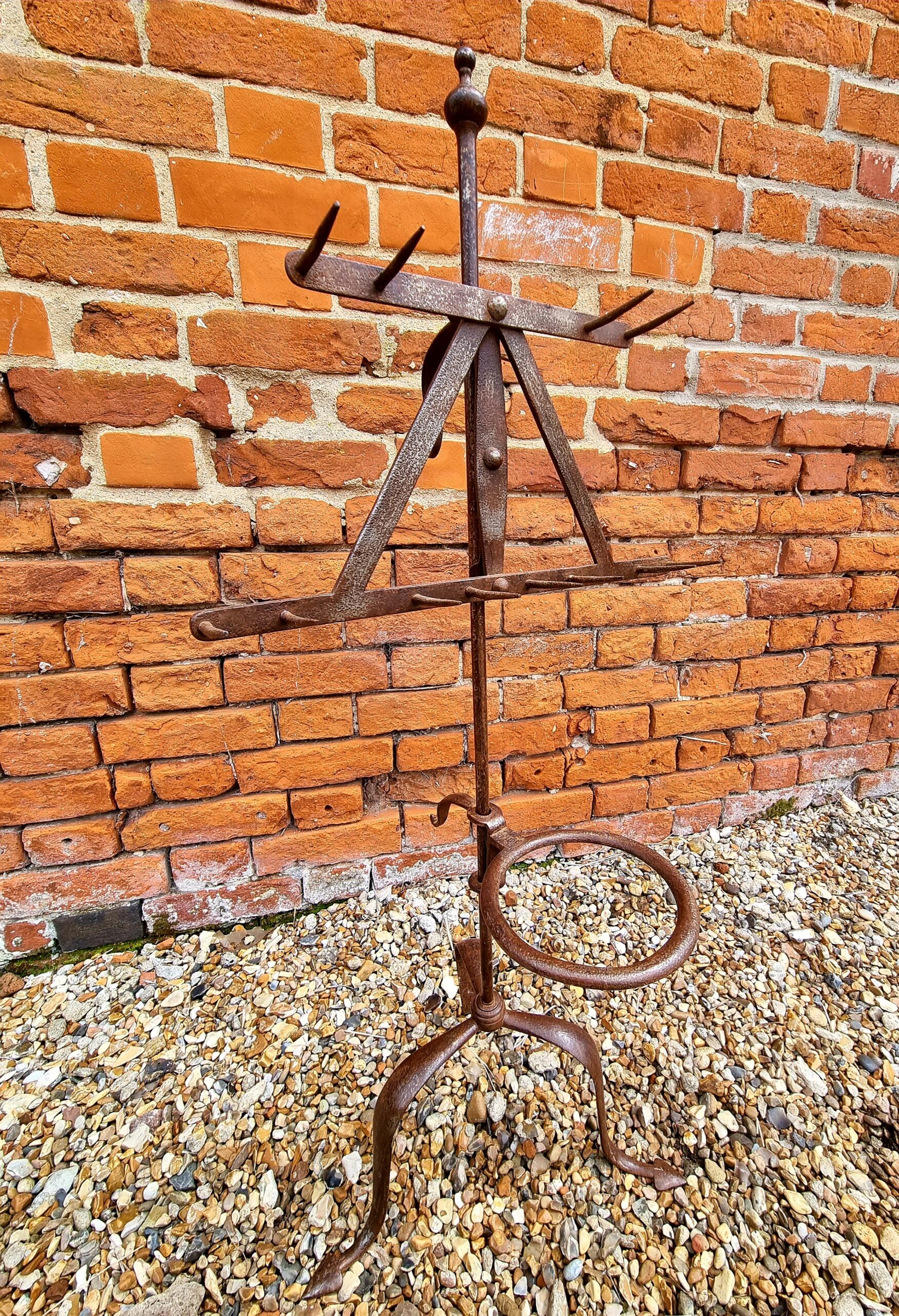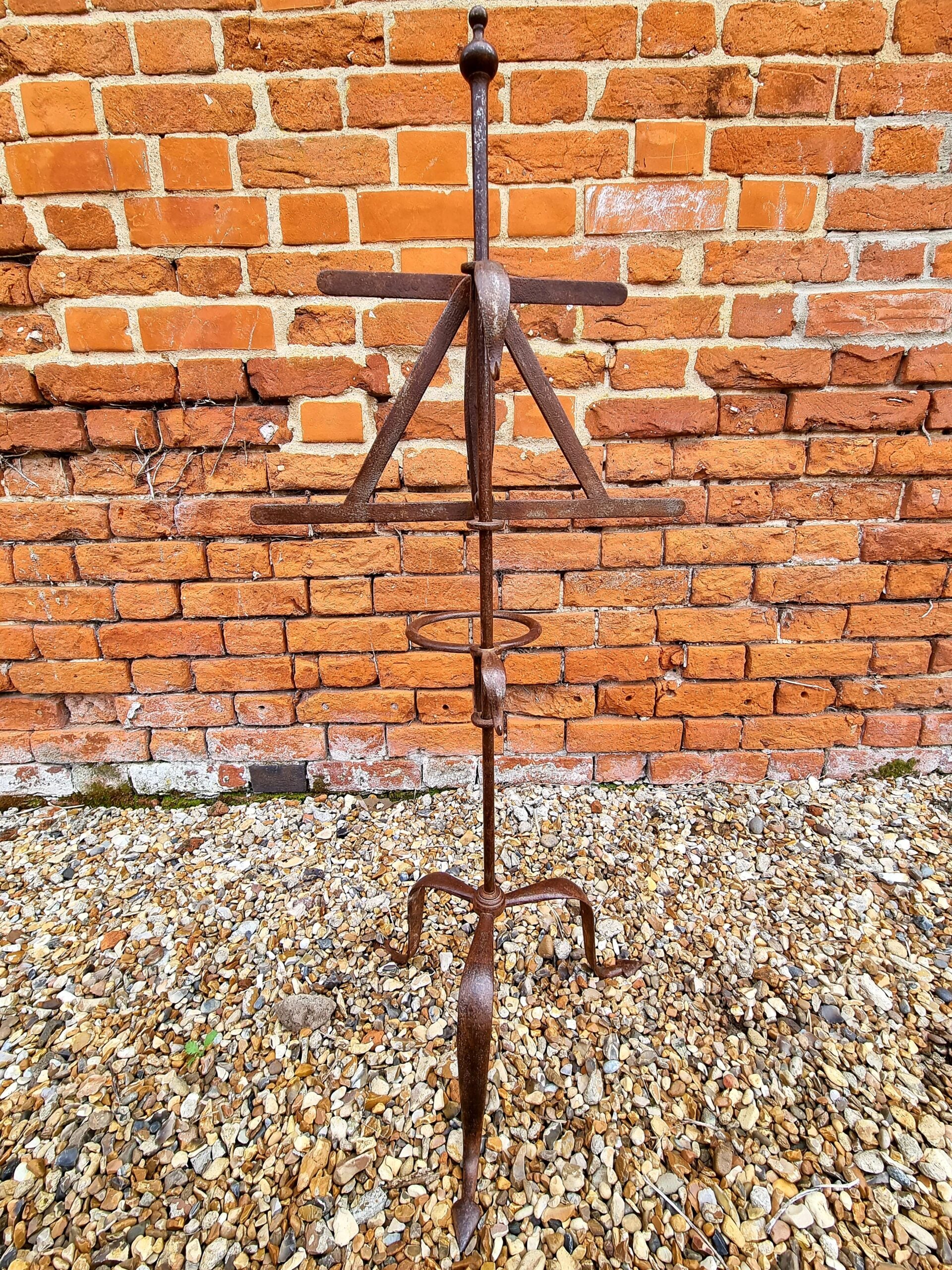 The spit and hoop can be moved up and down the steel shaft/stem (the shaft is decorated with a knop at the top). Supported overall on a tripod base.