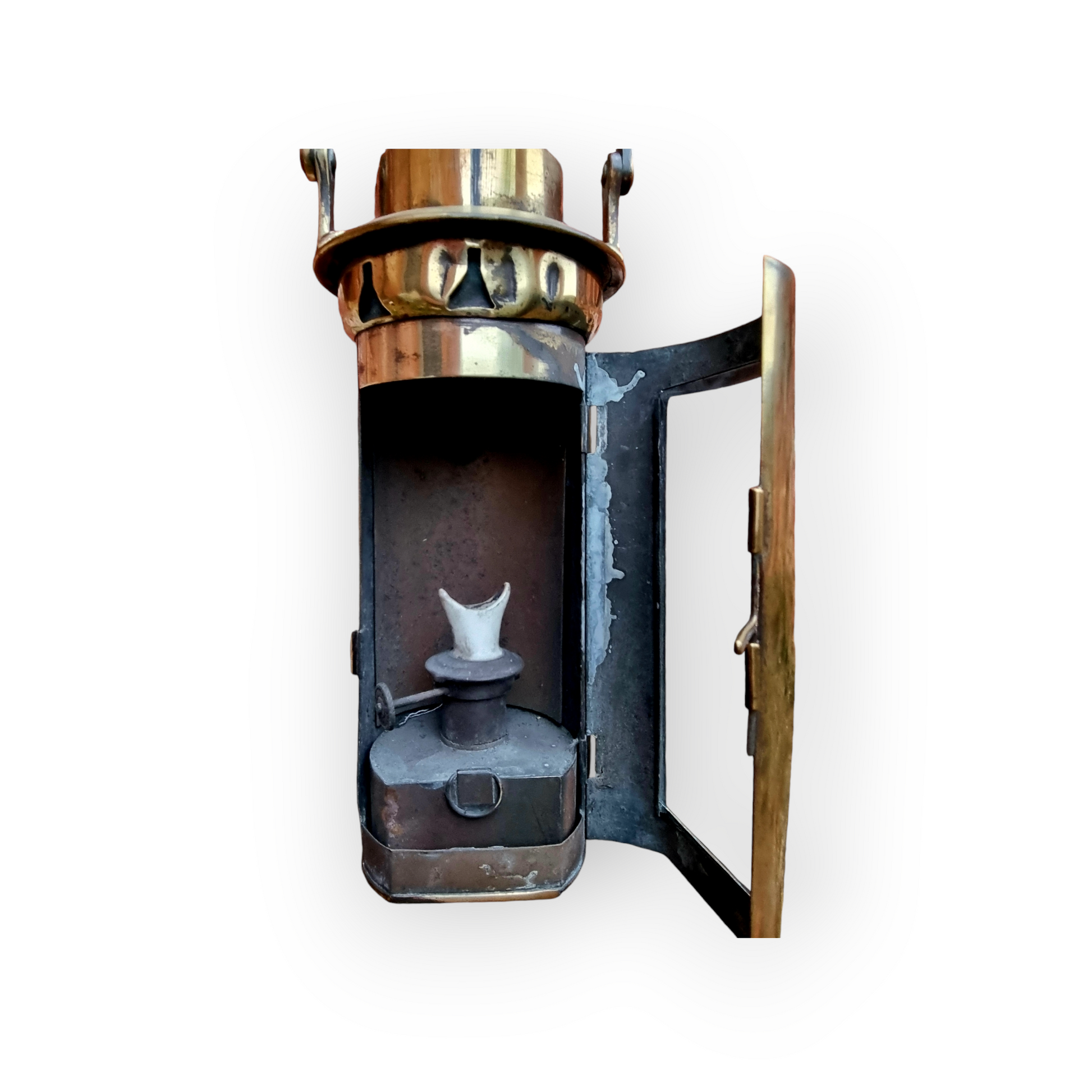 This form of Lamp is also referred to as a "binnacle lamp" and may have been used to illuminate a ships binnacle at night time. A binnacle is the housing used to protect a ships compass.