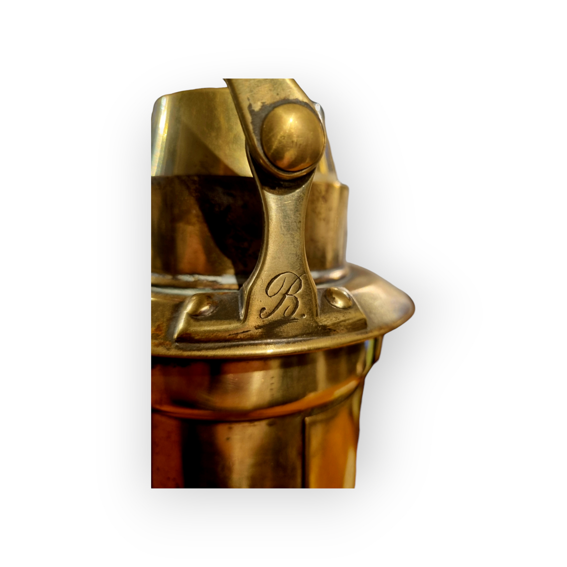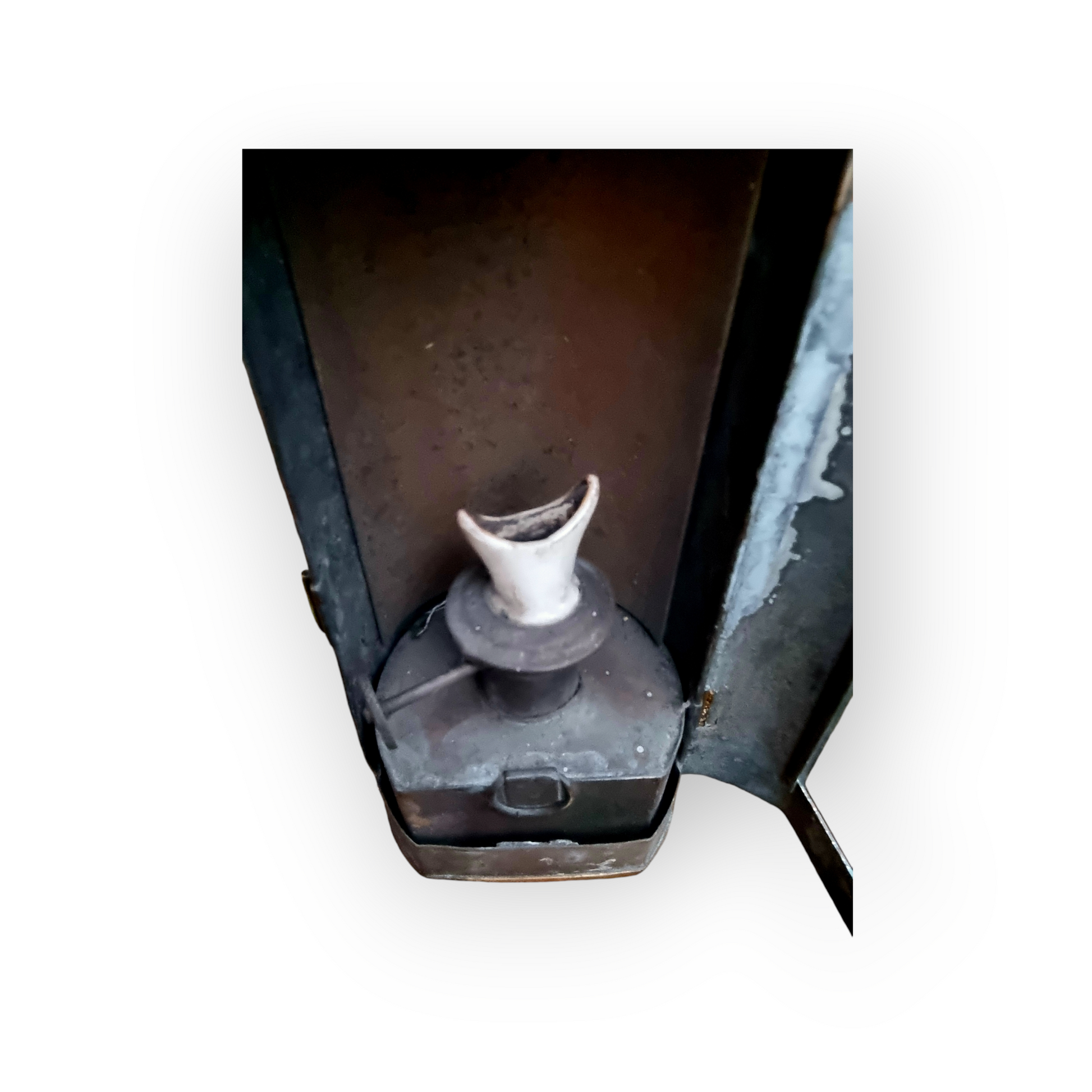 With a sturdy turned wooden handle and shaped, hinged supports which flank the flue, an elongated-cylindrical body with a single door with a glass lens, the door opens to reveal the original oil reservoir and ceramic burner. The lamp bears the engraved initial "B" at the base of the carry-handle hinge.