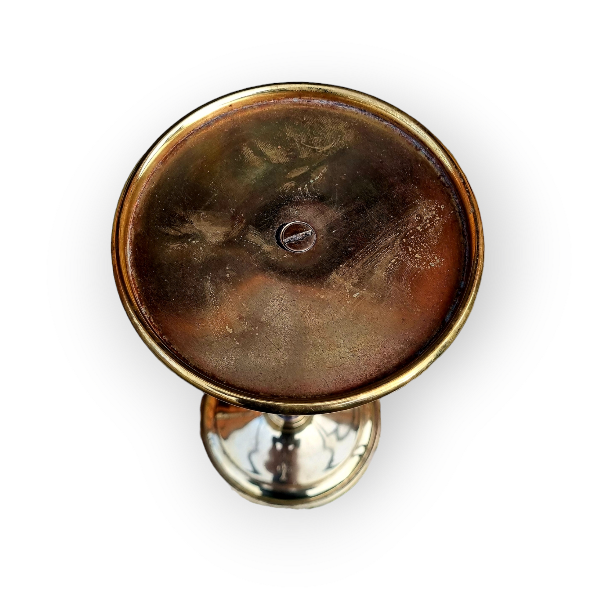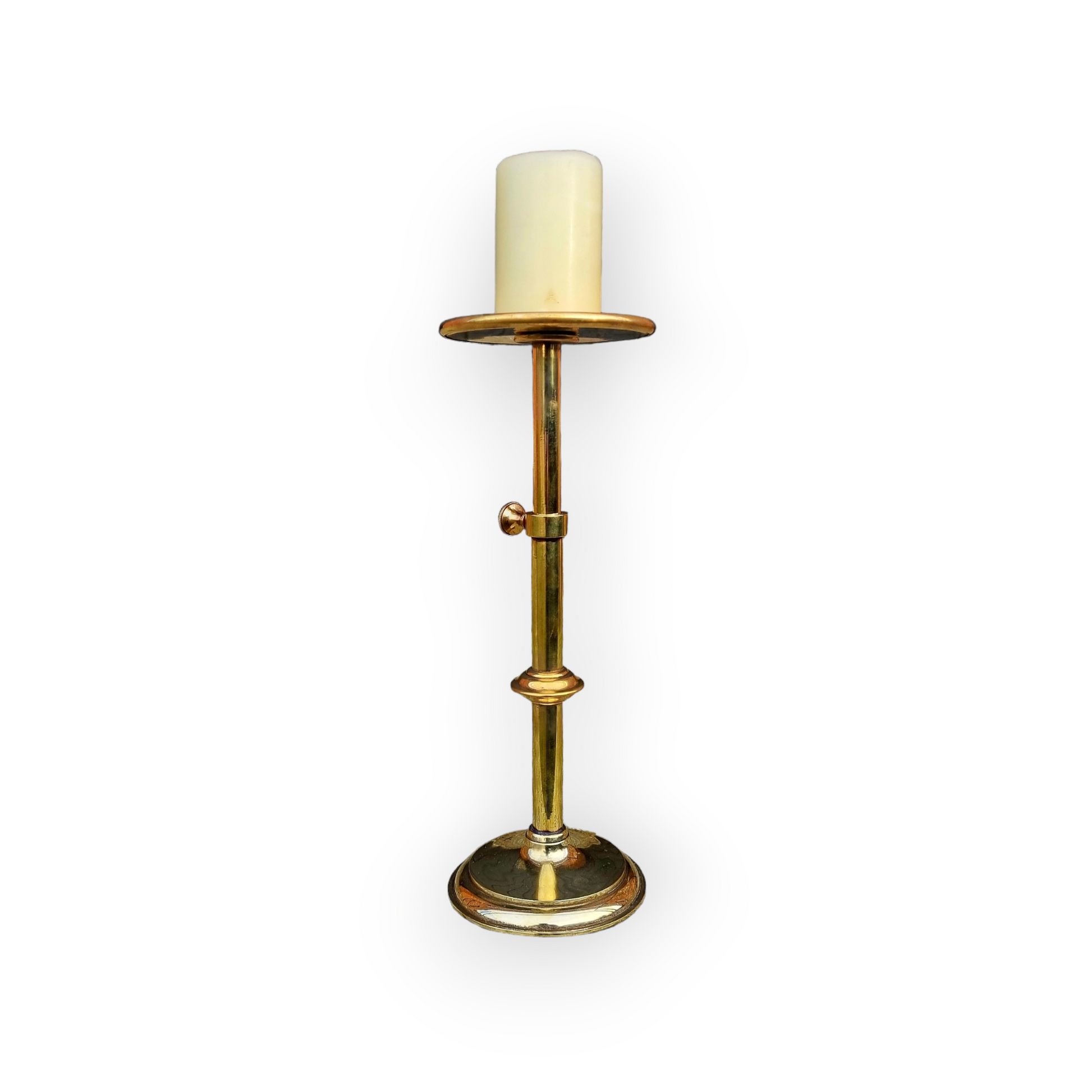 With a rise-and-fall stem. The circular pediment/drip pan over a knopped stem with inner movable shaft. Overall, supported on a raised circular base.