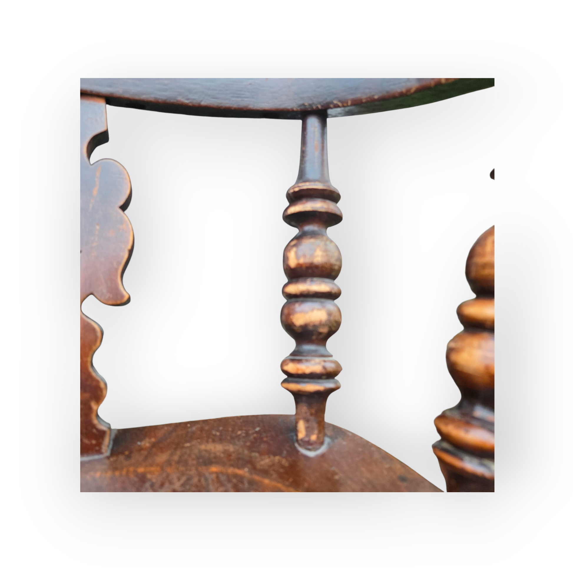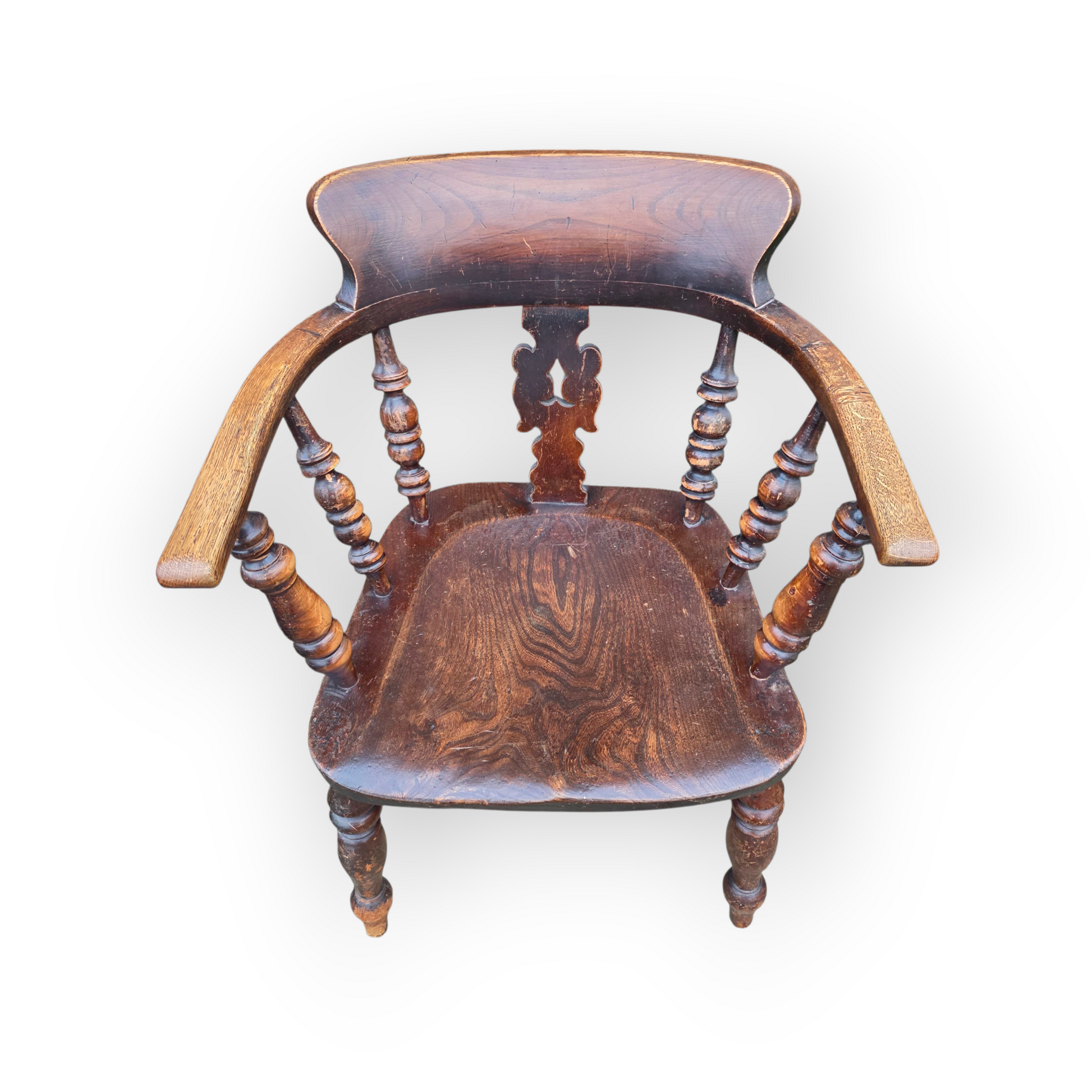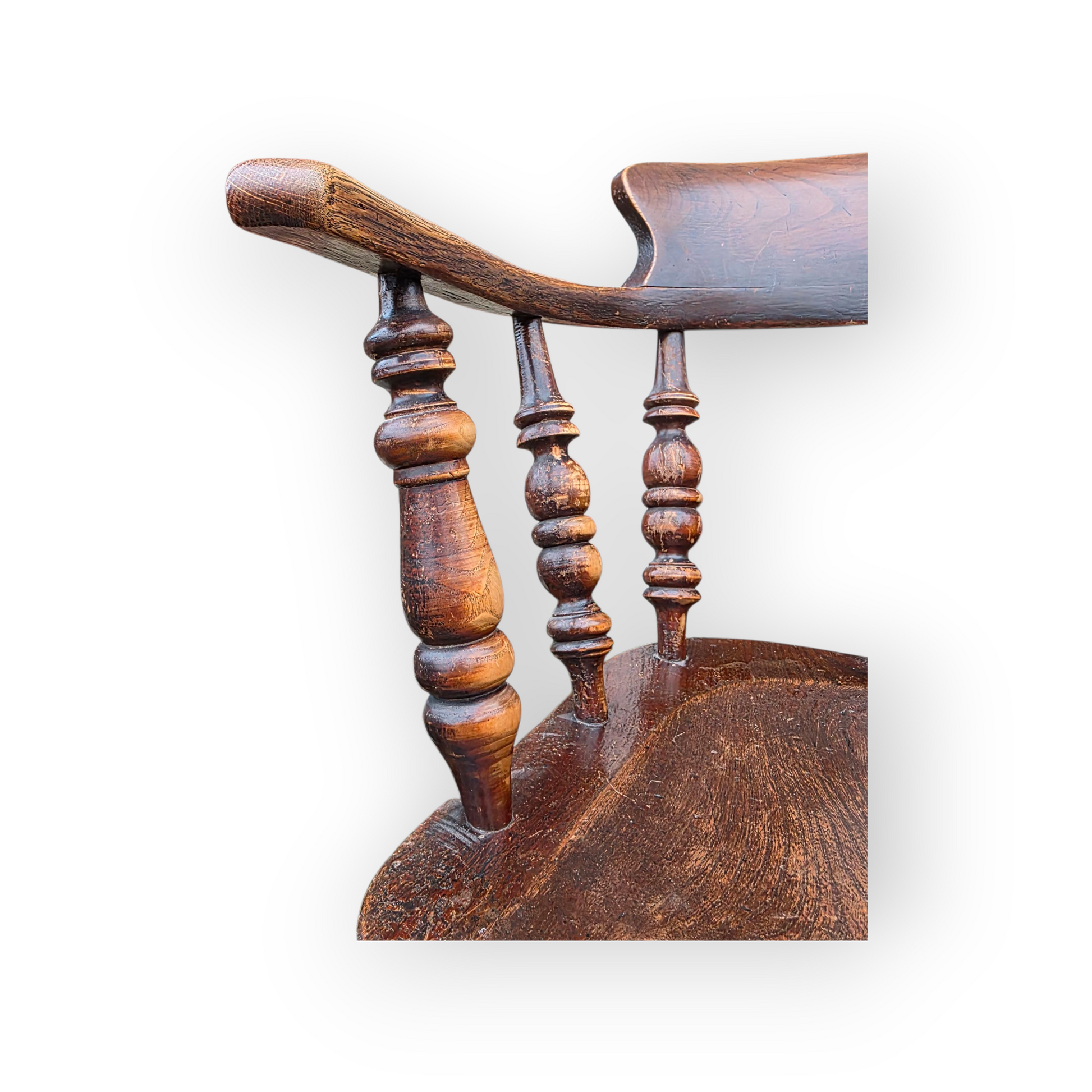 Meet this charming piece of history: an authentic 19th-century English Antique Captain's Chair, also known as a Smoker's Bow Chair.