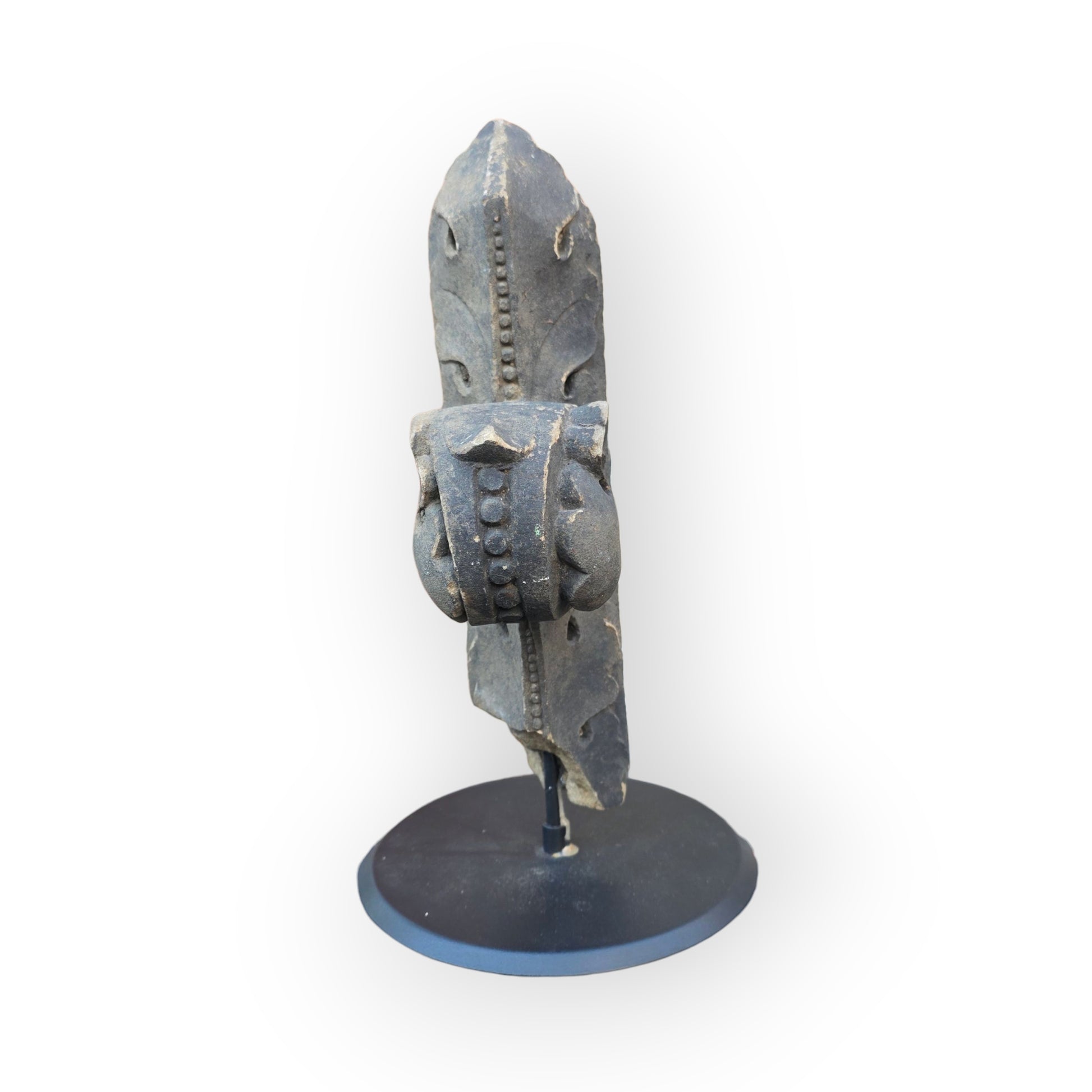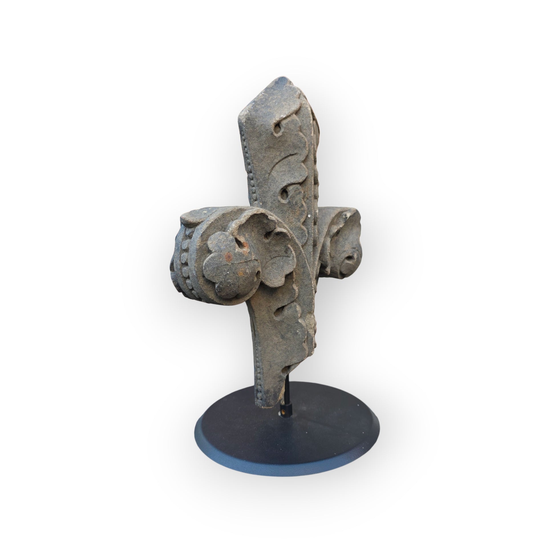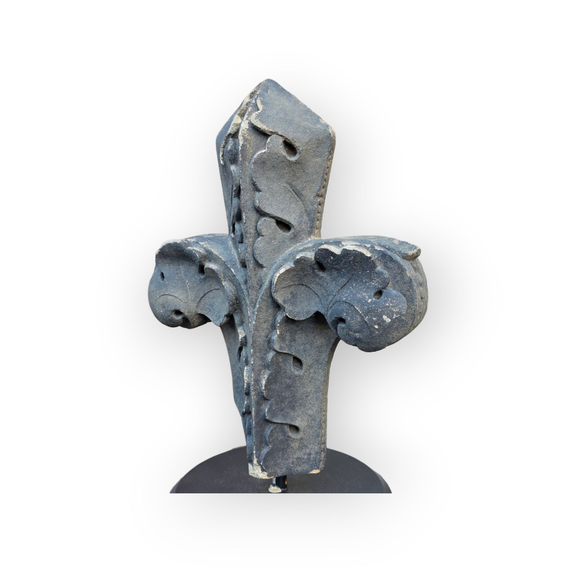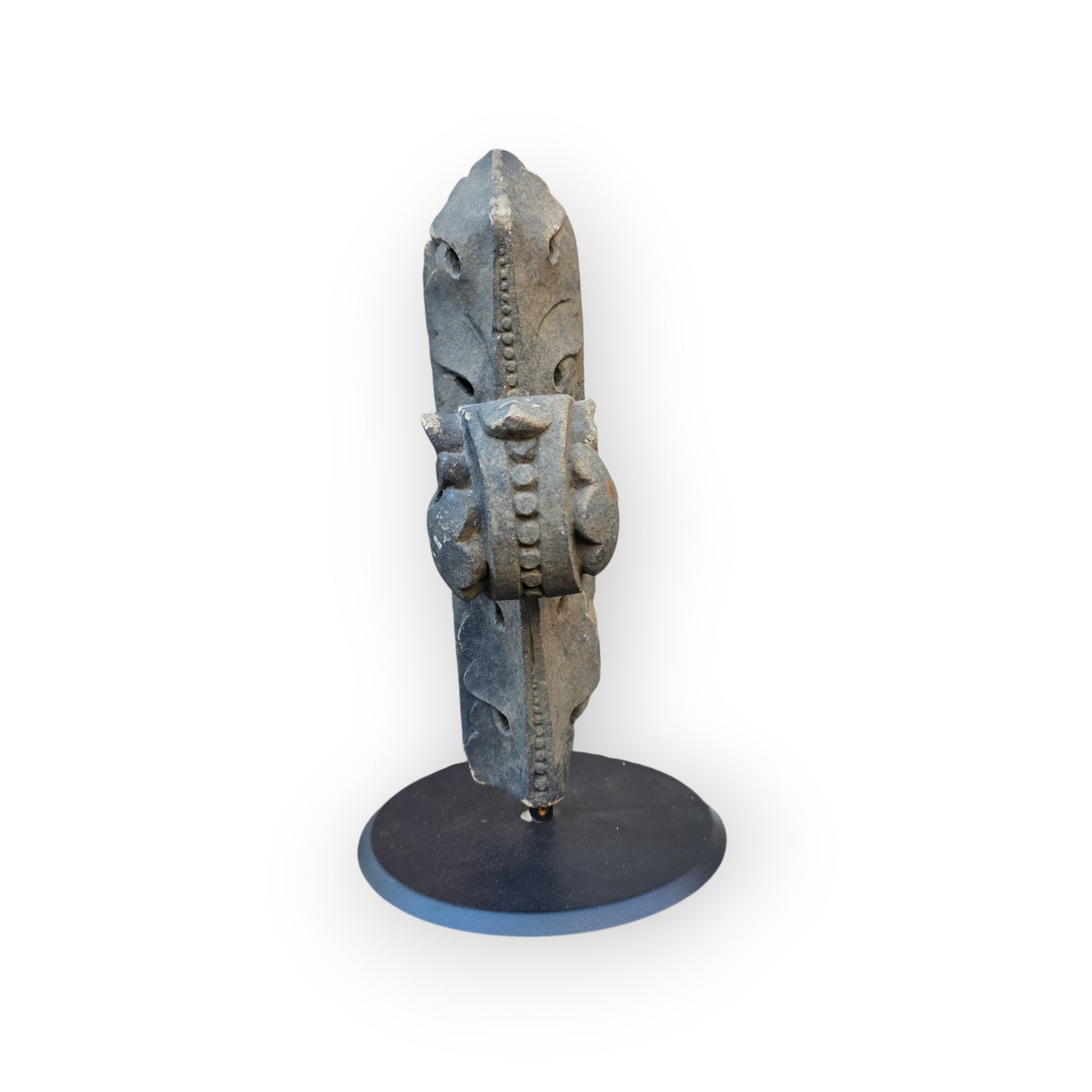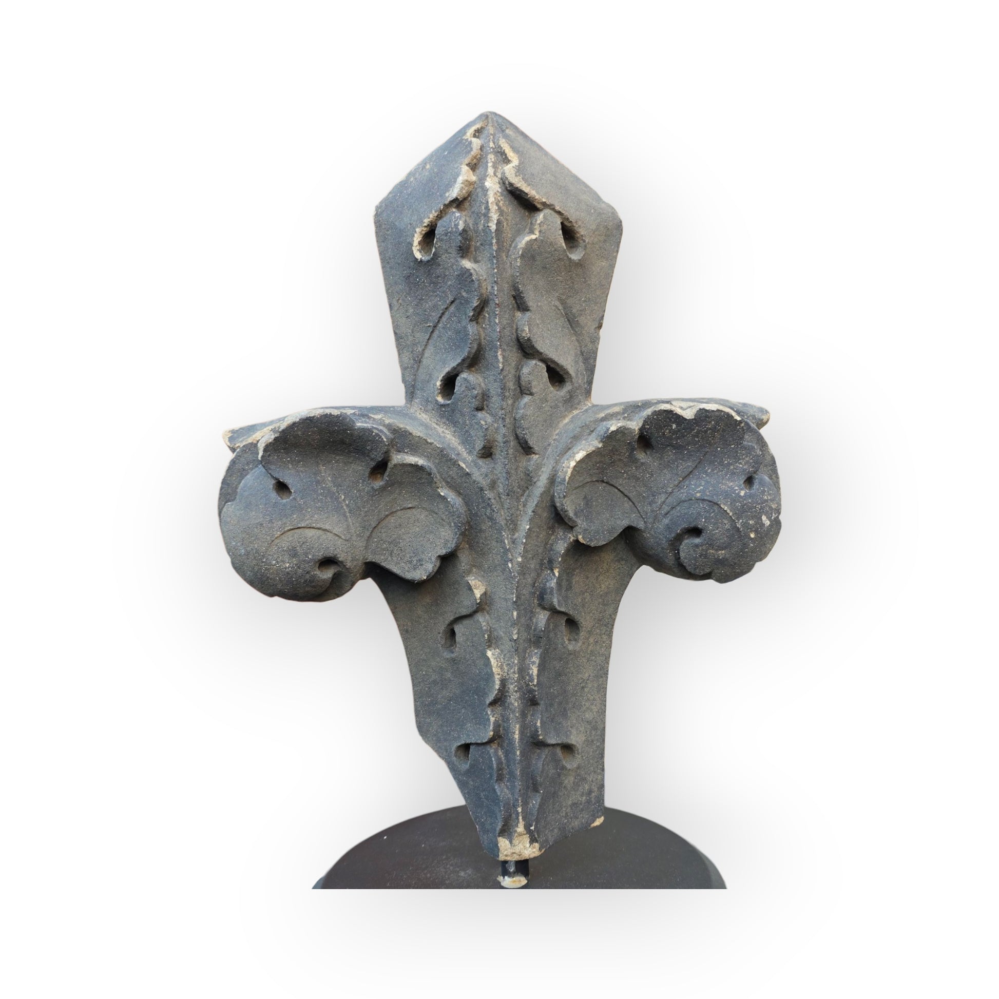 Condition: Please refer to the images. The base of the stone finial has age-related losses. Supported on a contemporary blacksmith-made stand.