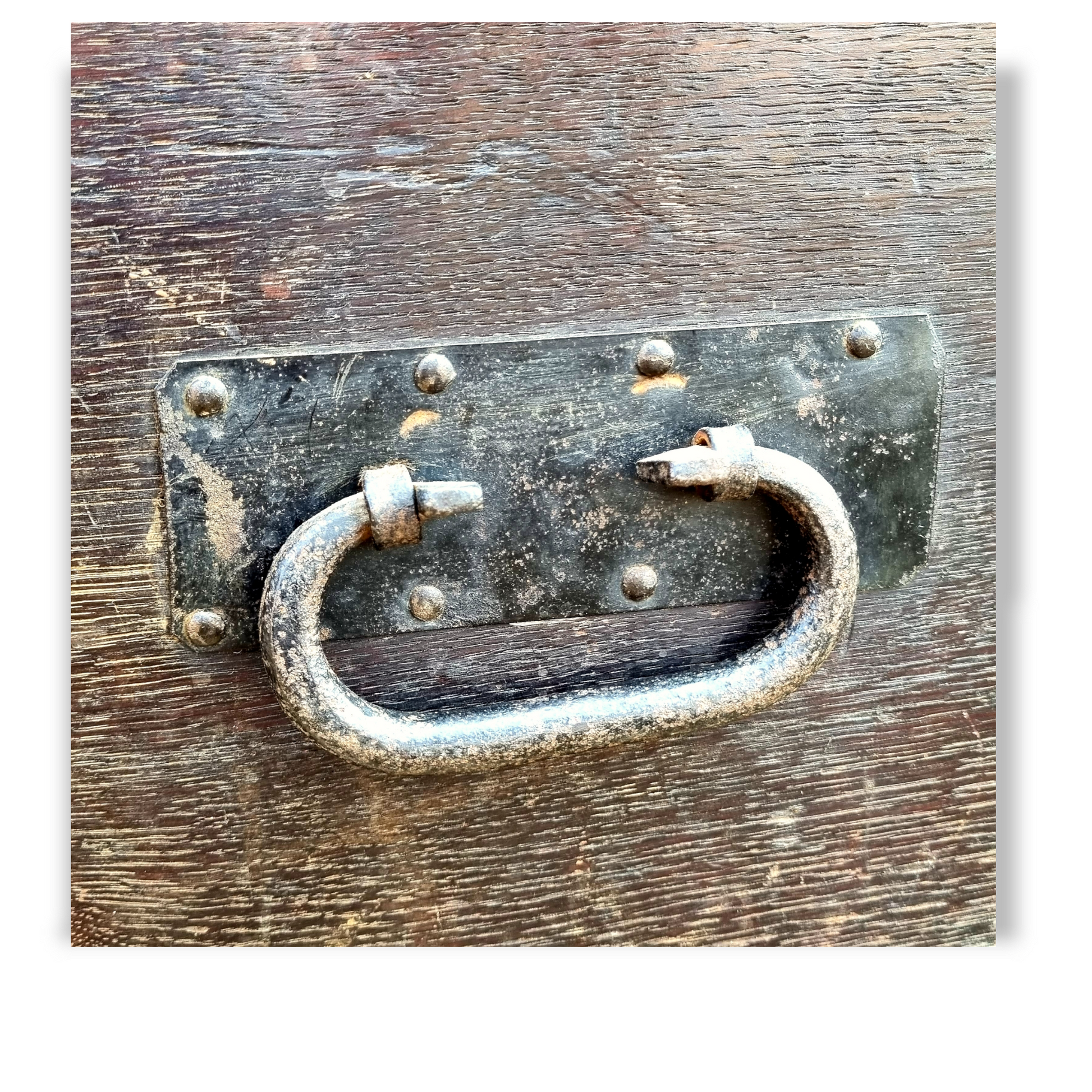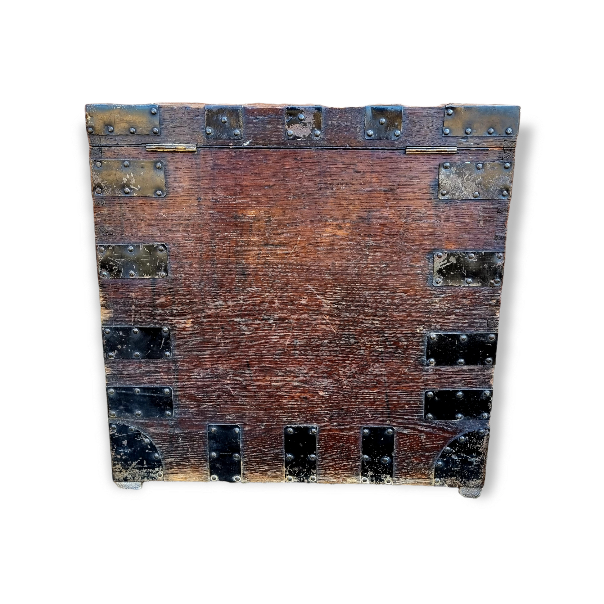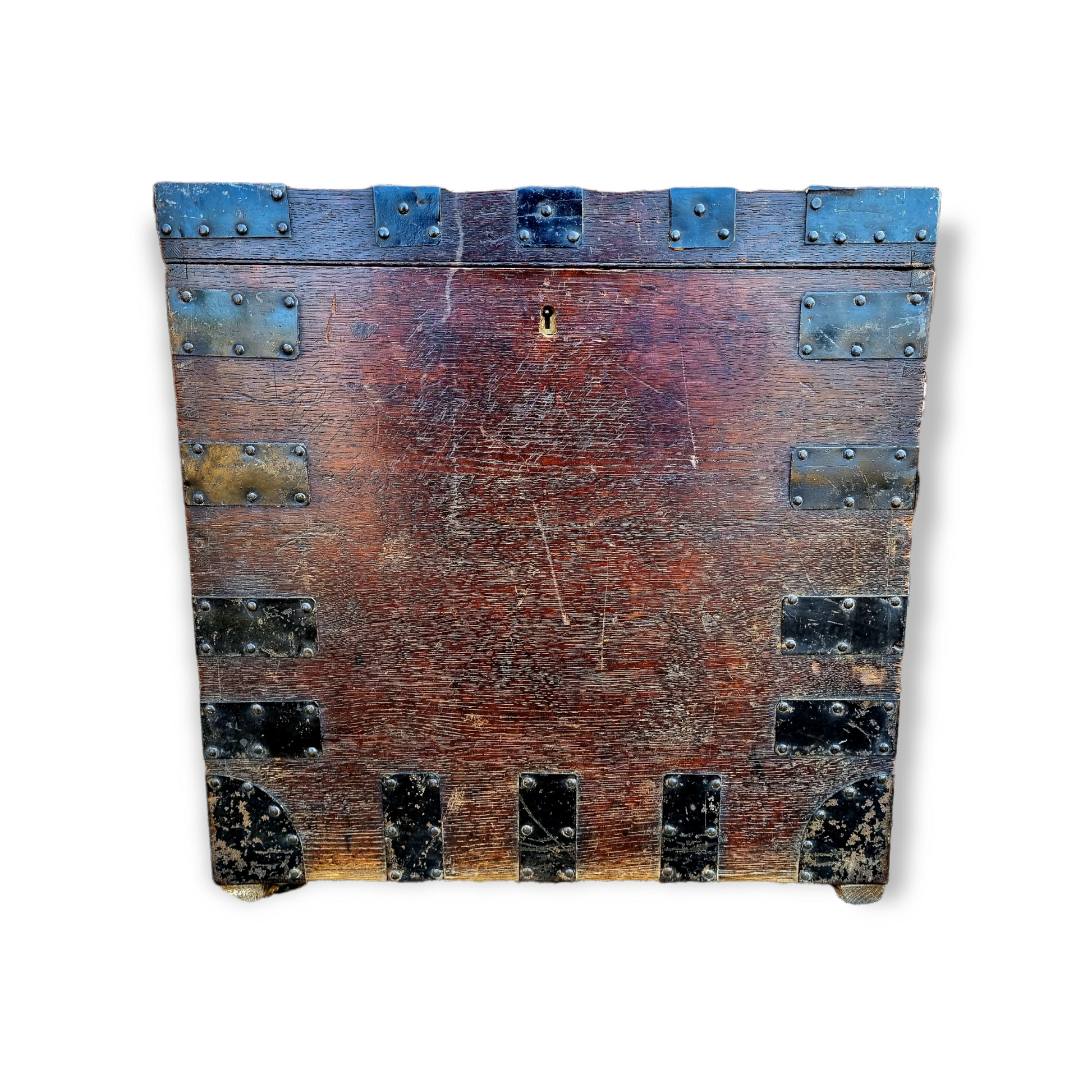 A 19th Century wooden chest with iron bindings. Made for the use as a silver chest / strong box with two carry-handles.
