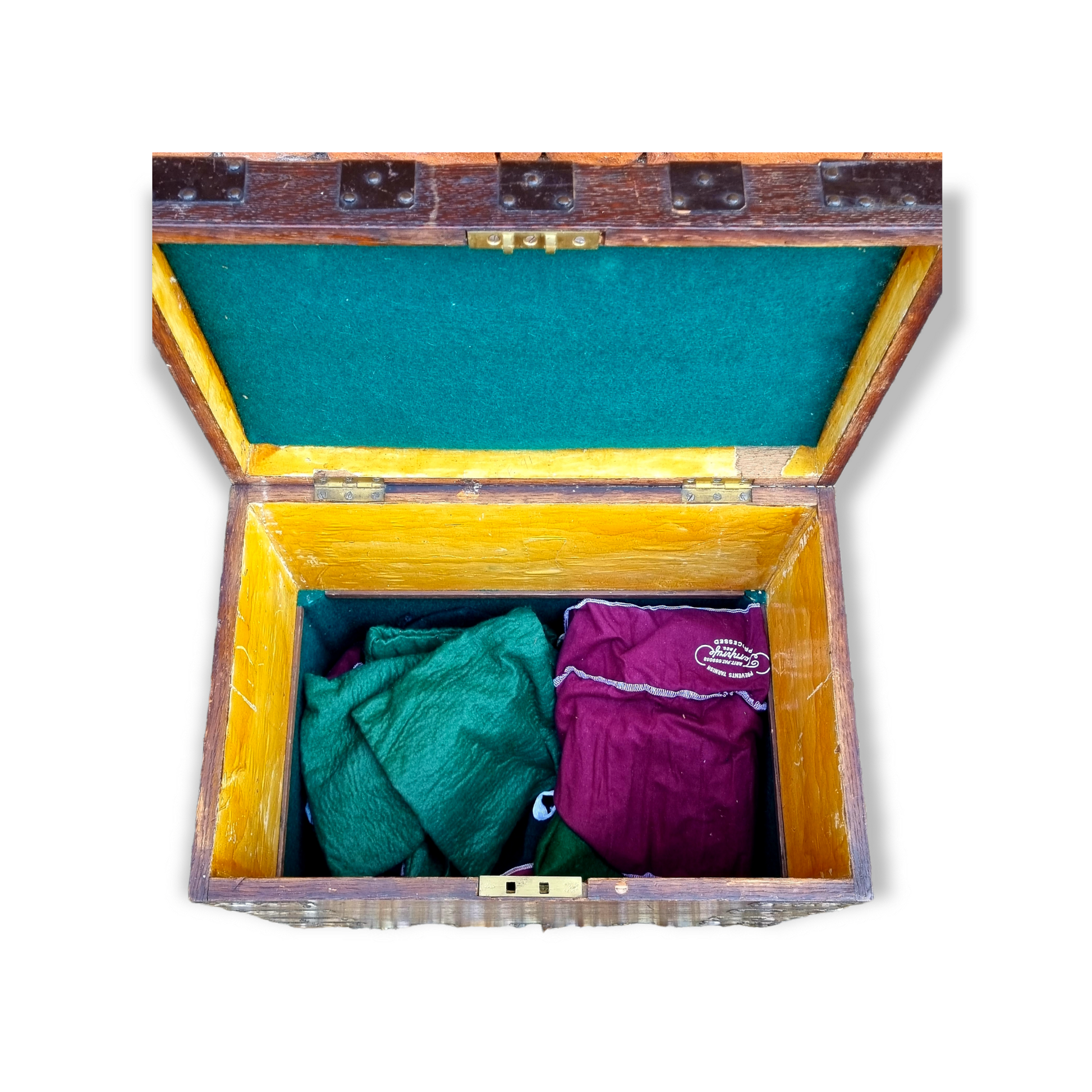 The lid opens to reveal an interior lined with green and yellow felt with lift-out tray.