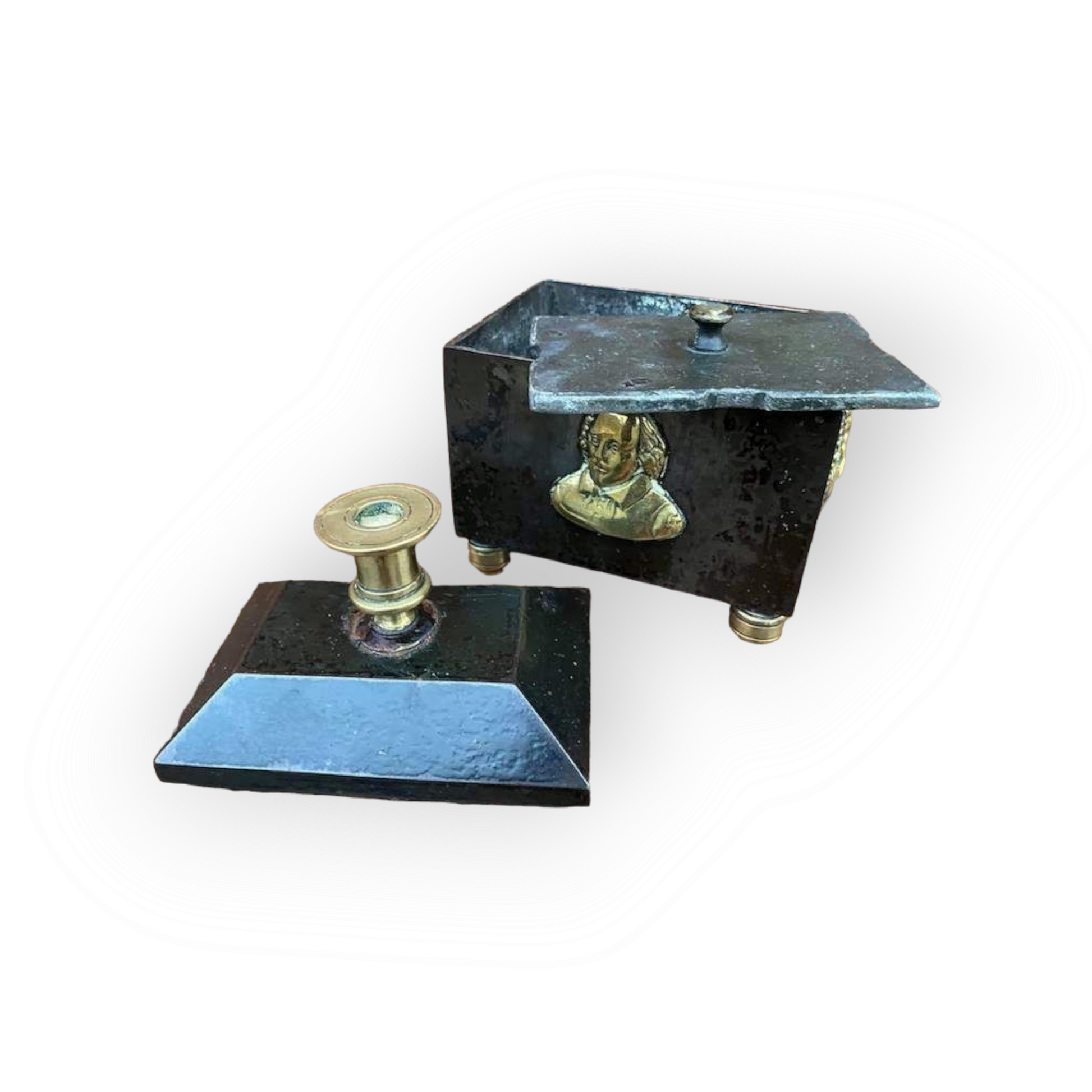 William Shakespeare Interest - A 19th Century English Antique Steel & Brass Tobacco Jar Decorated With Images of Shakespeare