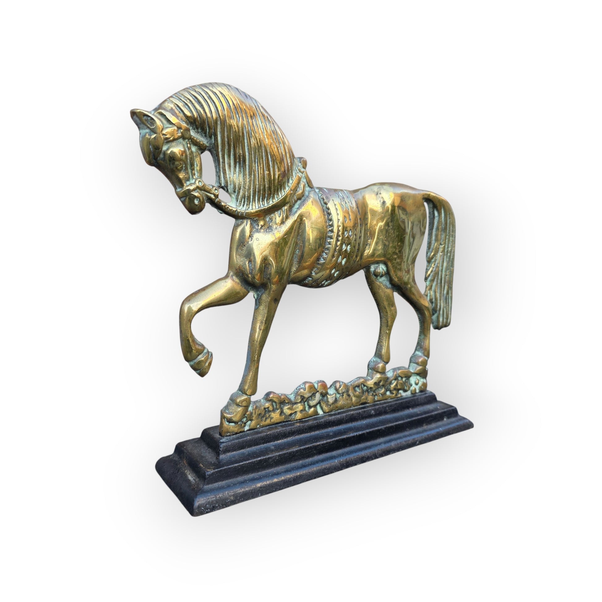 A 19th-century English antique cast brass horse, modelled in bold relief with muscular form, arched neck, and stylised mane and likely produced as an ornament for an overmantel. Supported on a stepped, ebonised, cast-iron base. This sculptural piece reflects Victorian interest in equestrian imagery and rural life.