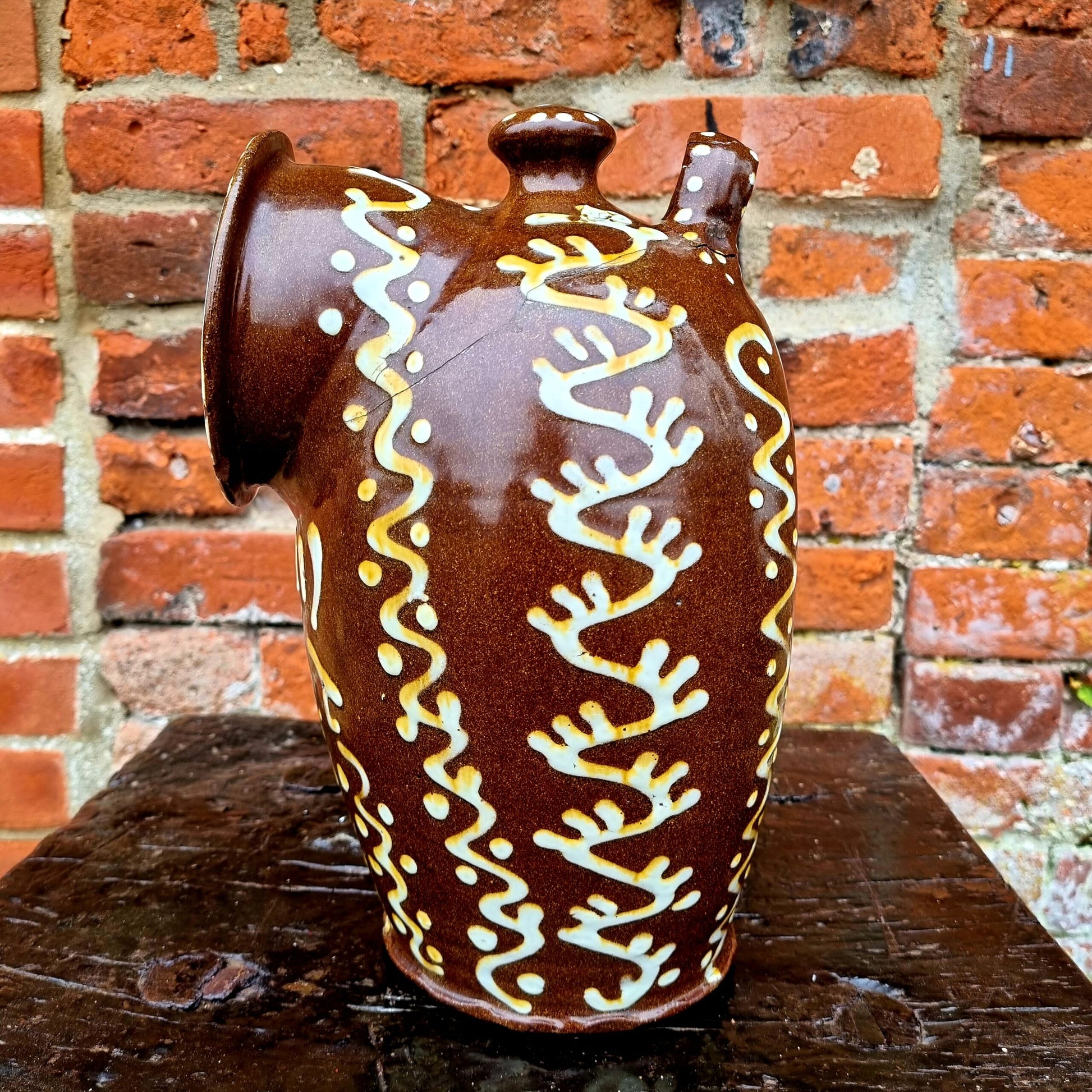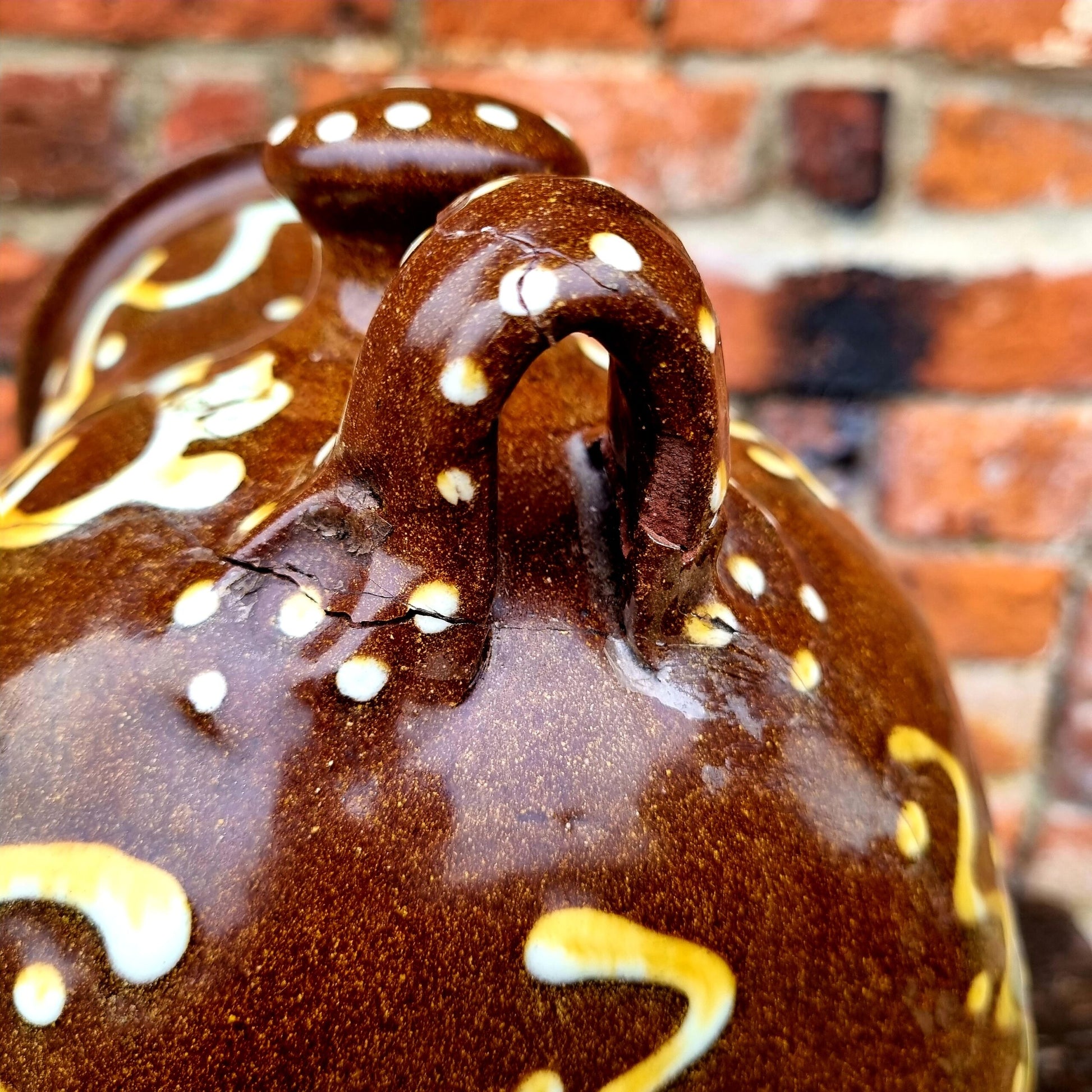 Condition: as per the images. A crack runs from the left side of the hanger (this has also been re-attached) to the front aperture and also down a proportion of the right side of the back of the main body. This is still a functional and decorative piece of slipware.