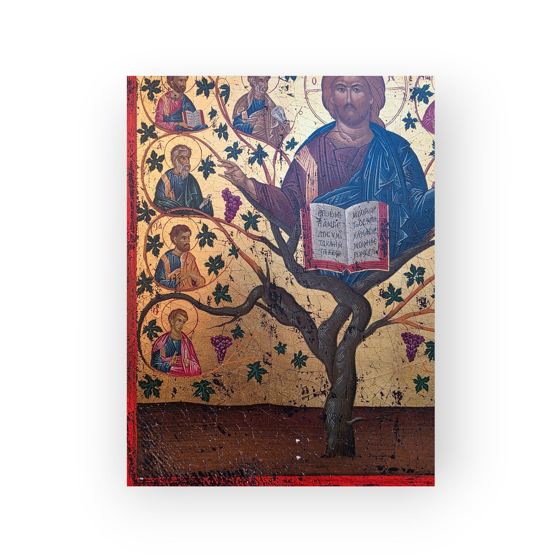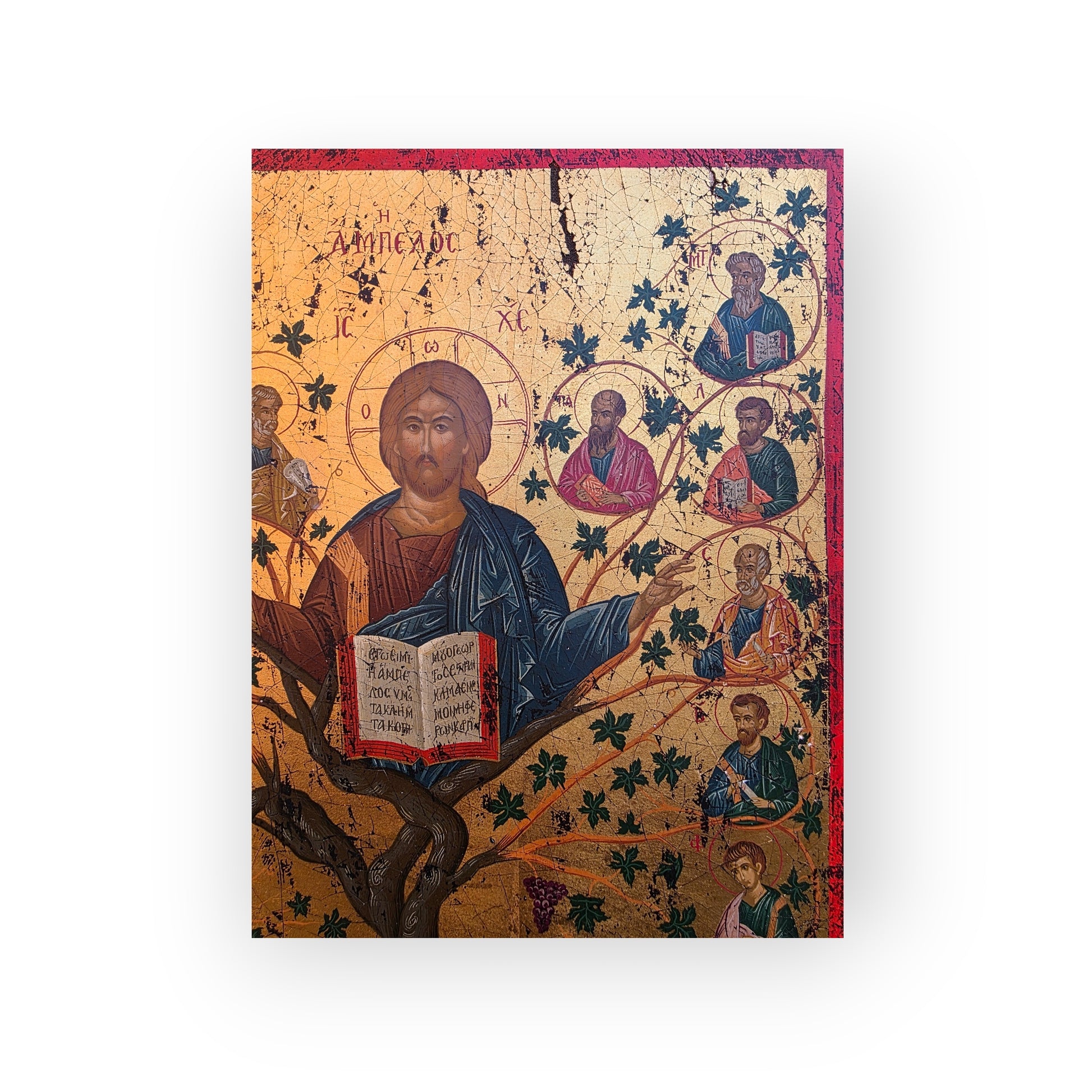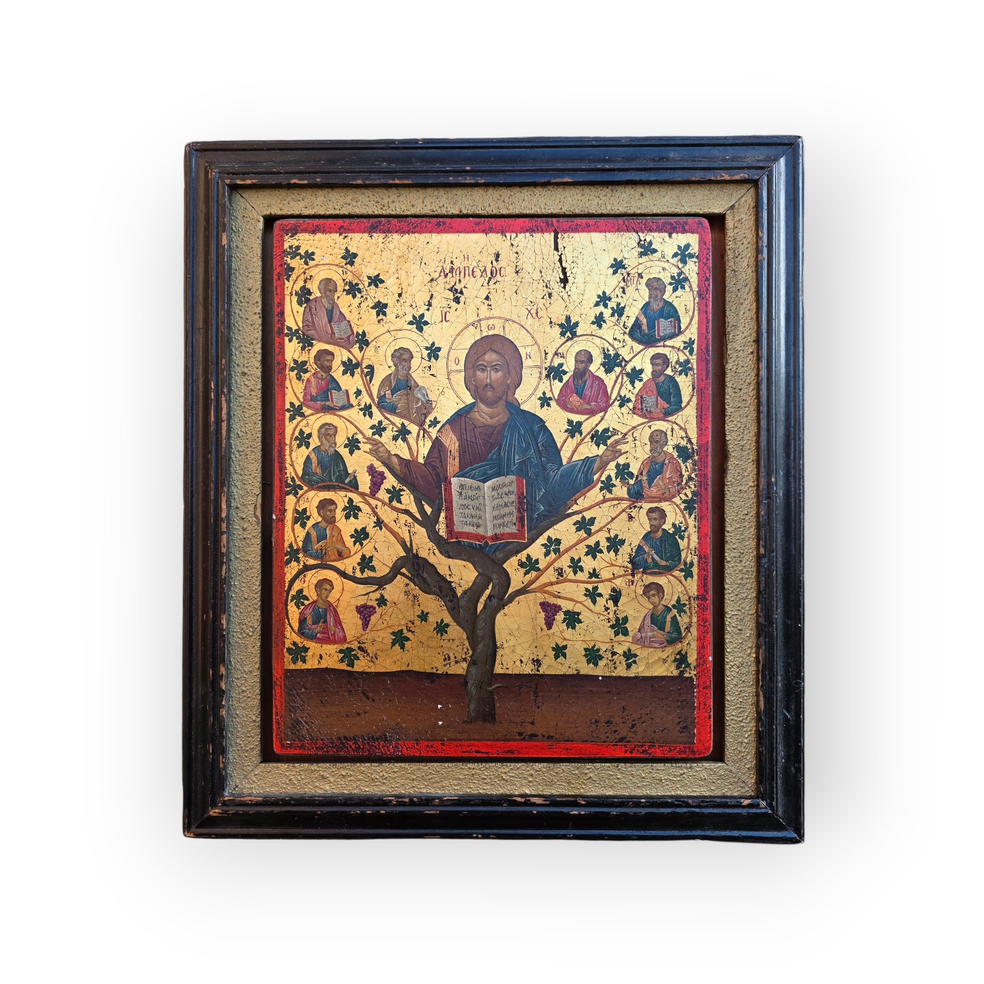 A luminous early 19th-century Greek School icon depicting Christ the Vine, rendered in the Byzantine tradition with oil and gilt on panel. Rooted in the Gospel of John (“Ἐγώ εἰμι ἡ ἄμπελος” – I am the vine), this sacred composition presents thirteen New Testament figures, with Christ enthroned at the centre of a stylised tree, surrounded by apostles in symmetrical harmony.