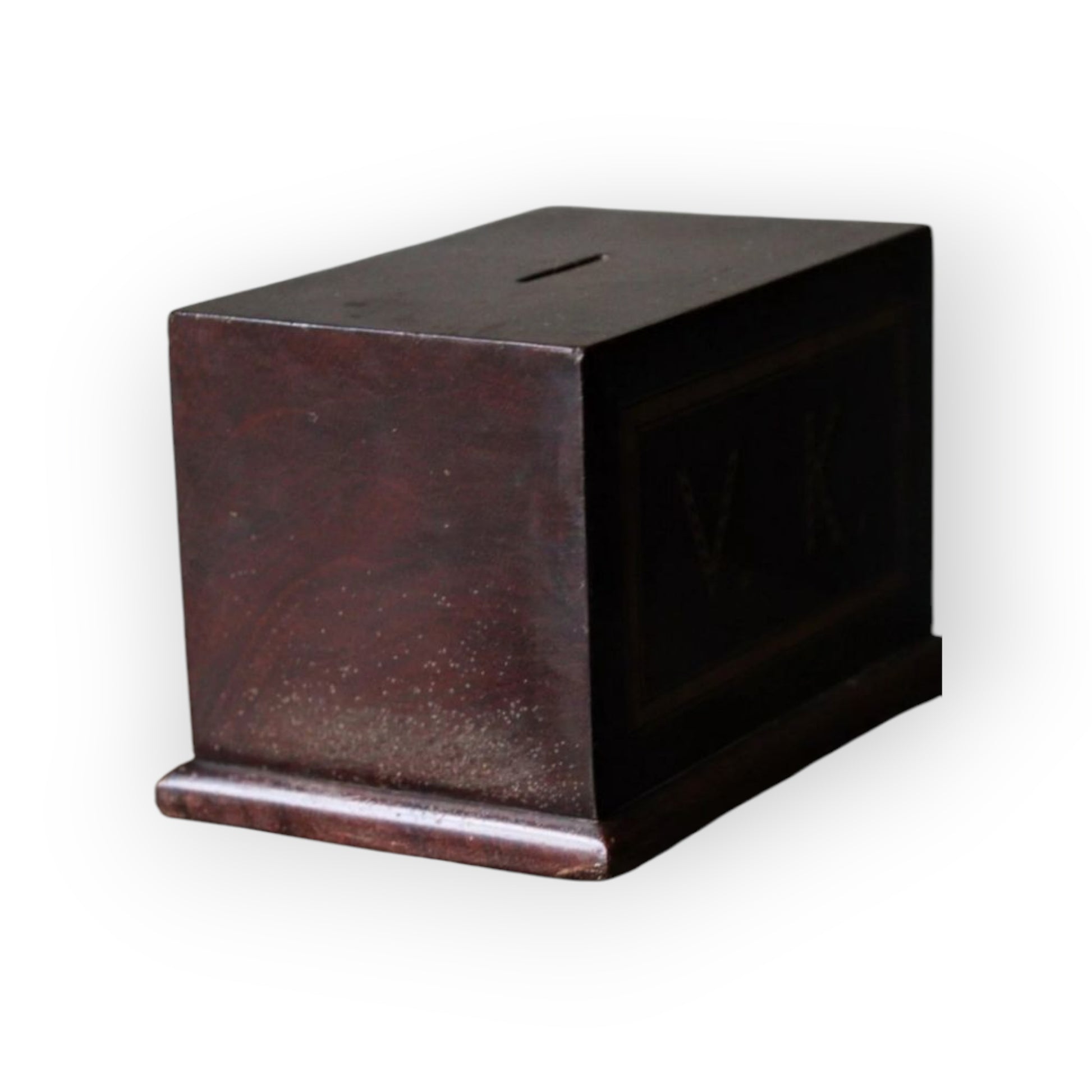 The top with a single coin aperture, over a front with inlaid veneers, with the initials "VK" surrounded by a decorative border. The base, with moulded edge (detachable by means of the removal of four screws), removes to reveal a void interior.