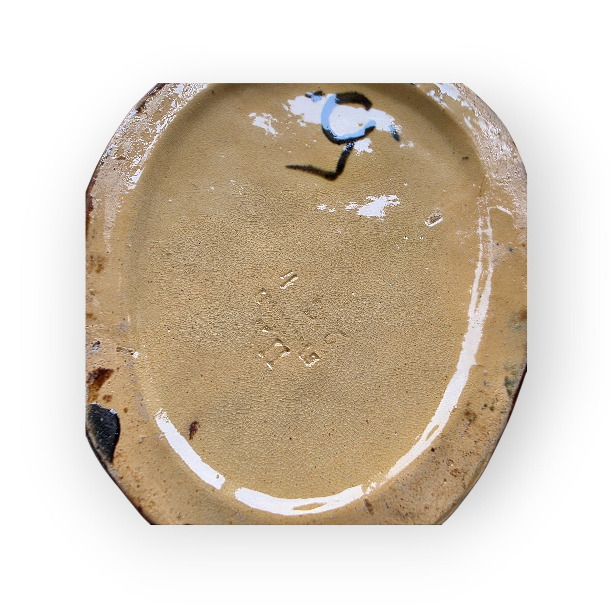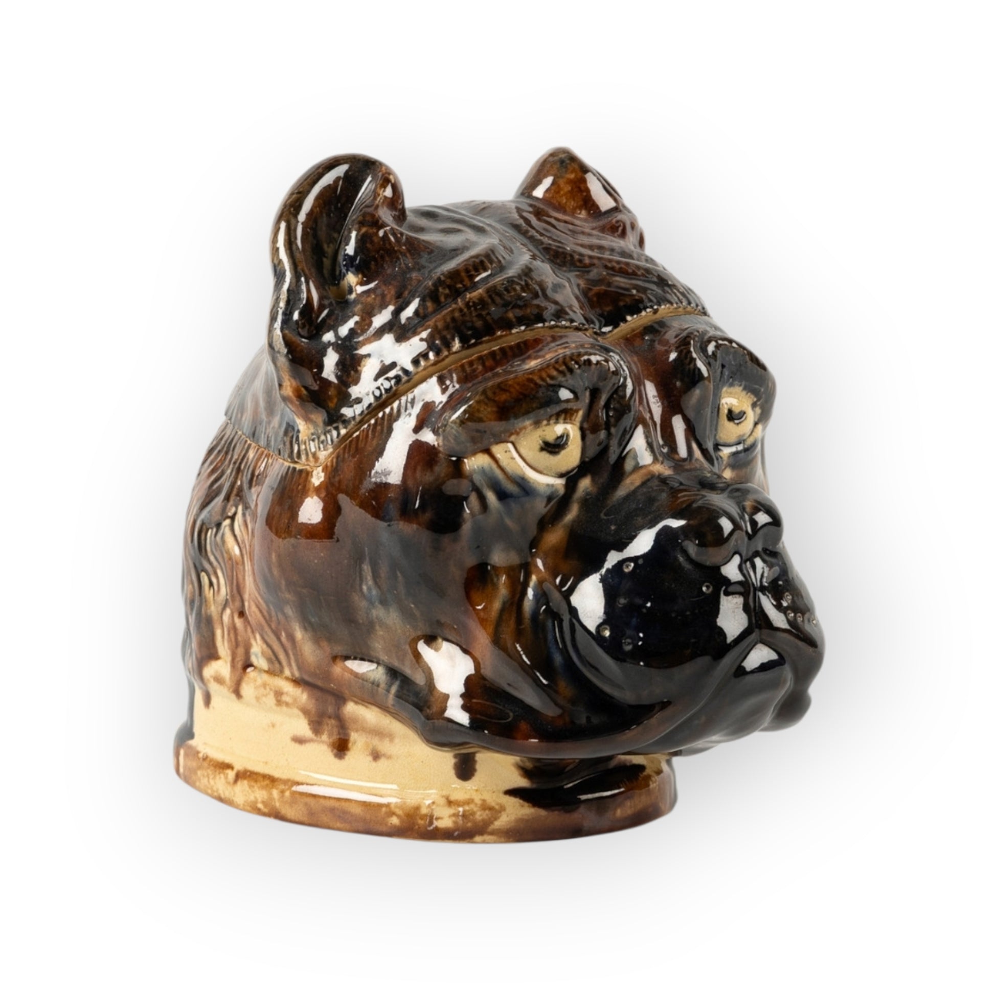 The bulldog’s features are boldly modelled, with the humorous, slightly grumpy expression that makes these Scandinavian novelty jars so appealing. The glaze has developed an attractive surface character over time, and the sculptural form retains a strong decorative presence. Originally intended for loose tobacco, it now stands as a delightful piece of late 19th‑century ceramic folk art.