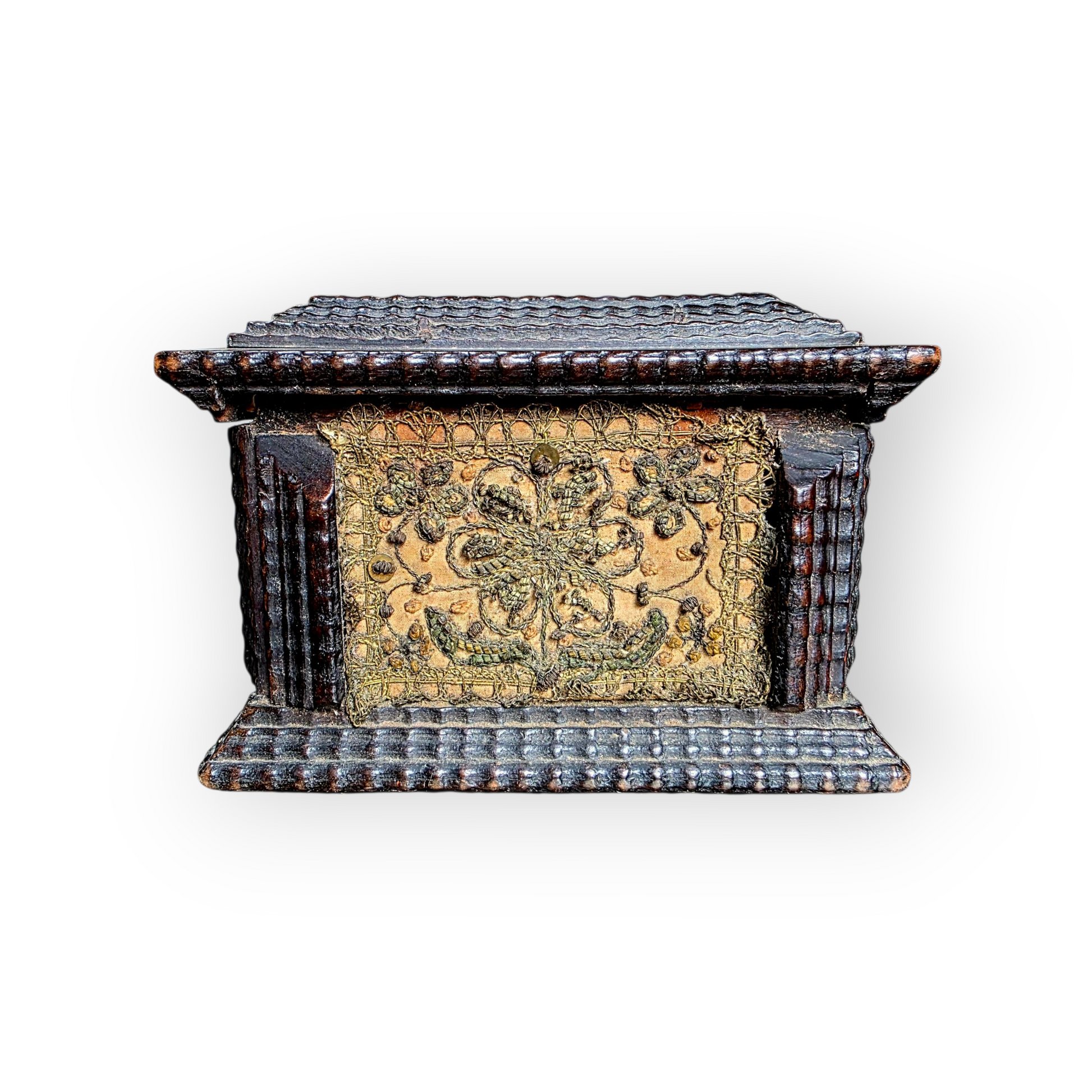 A rare survivor from the early 1600s, this exquisitely small continental table-top box measures just 5 inches wide (approx. 12.7 cm), yet it encapsulates the craftsmanship and domestic artistry of the period. The box is constructed from richly patinated hardwood, likely walnut, and features inset textile panels adorned with raised stumpwork embroidery—a technique popular in the late 16th and early 17th centuries, characterized by its dimensional, padded motifs often depicting flora, fauna, or allegorical scenes.