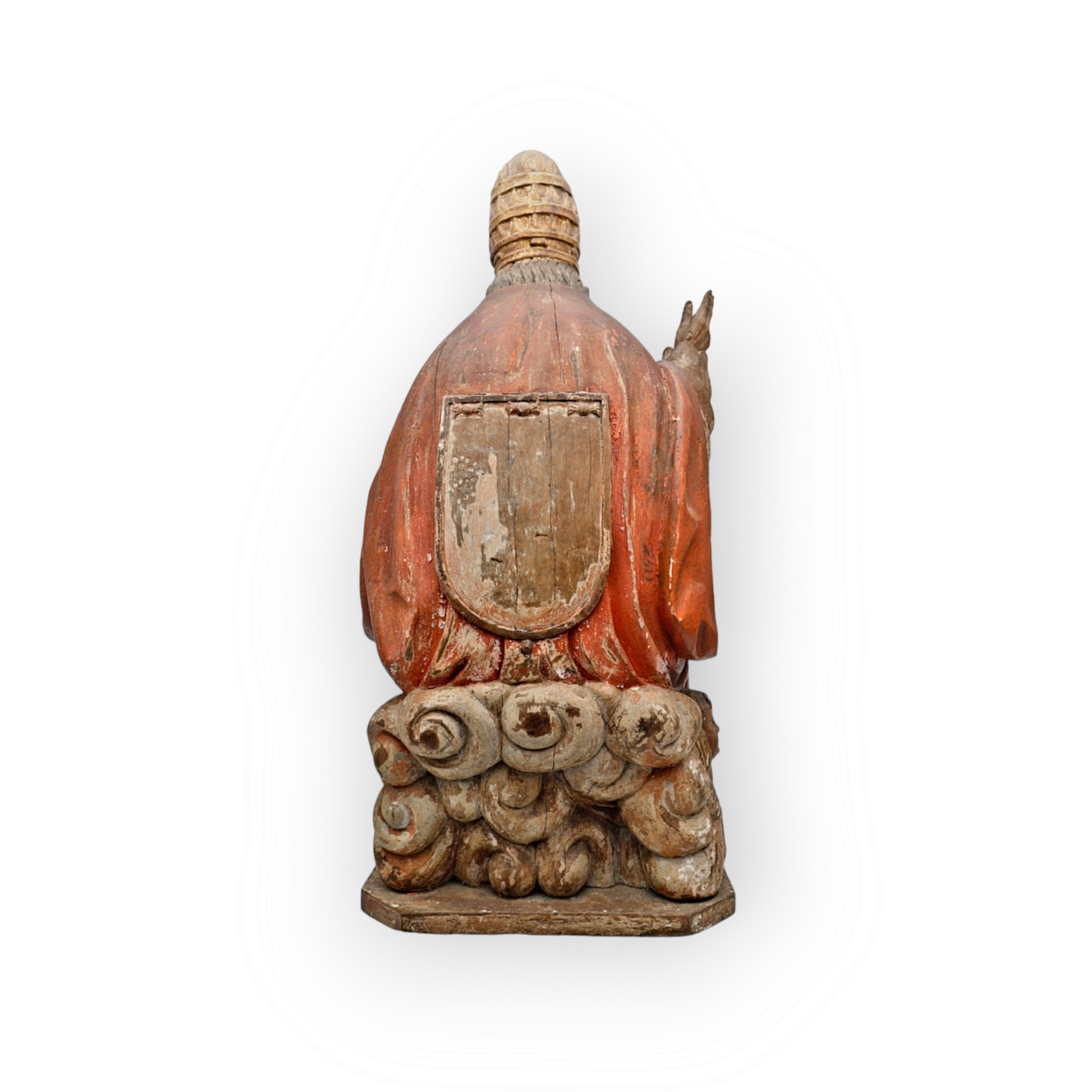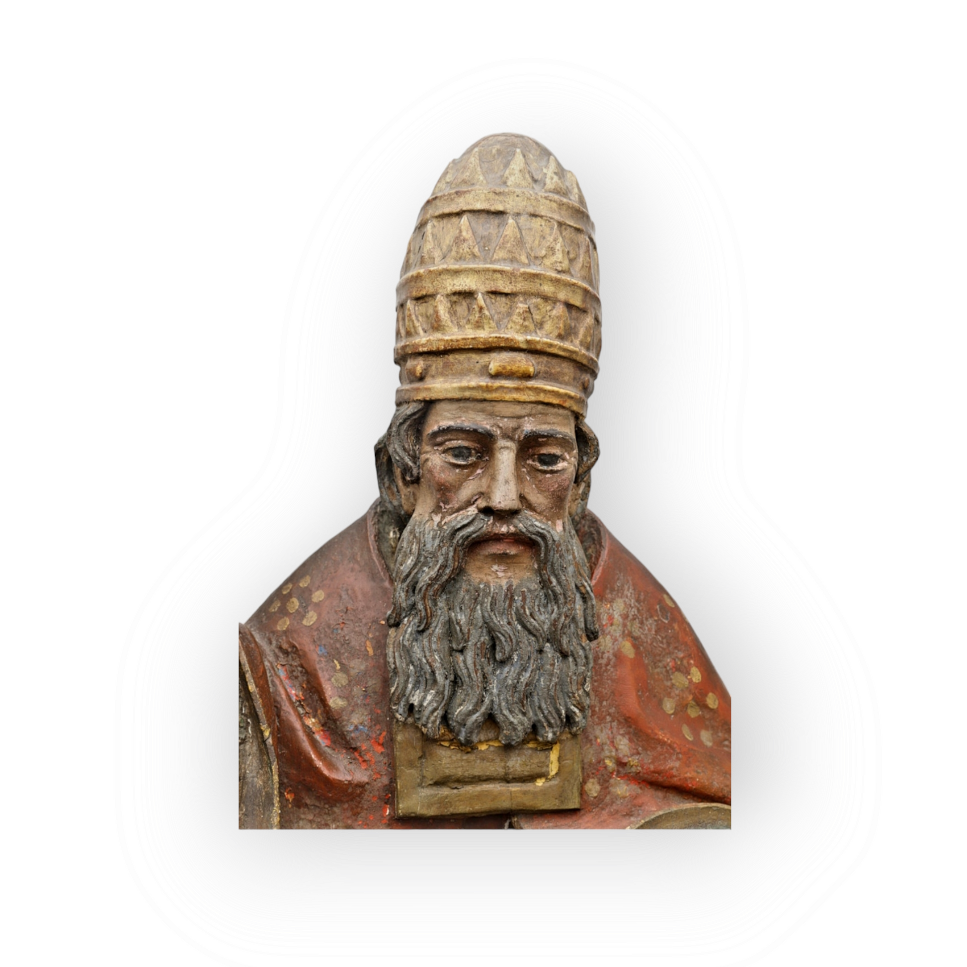 This sculpture is carved in this manner with a Papal Crown, swathed in ecclesiastical robes, an orb in his left hand which represents the universe, his right arm raised and two fingers outstretched making a blessing to the world.