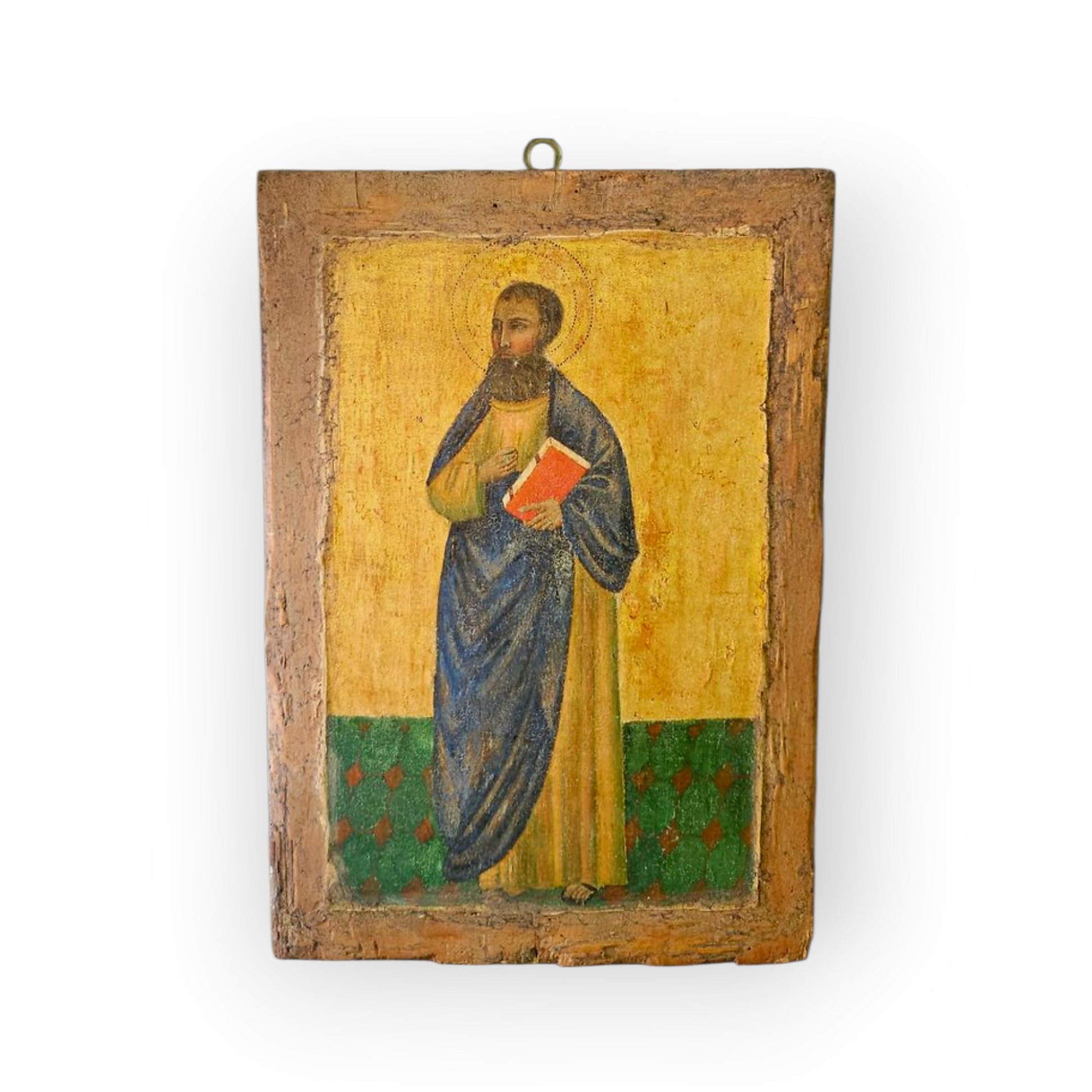 This striking hand-painted icon, dating to the 18th century, depicts Mark the Evangelist - one of the four authors of the Gospels - rendered in rich pigments on a solid wooden panel. Likely originating from Eastern Europe or the Orthodox tradition, the icon features Mark holding a gospel, symbolising divine wisdom and authorship. The craftsmanship reveals age-appropriate wear, with a beautifully patinated surface and traces of devotional use.