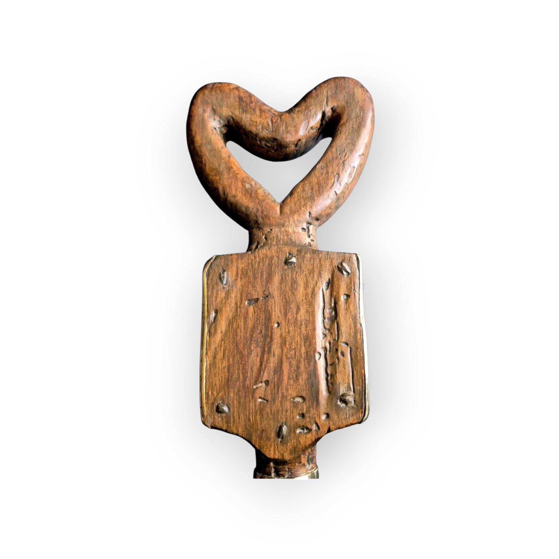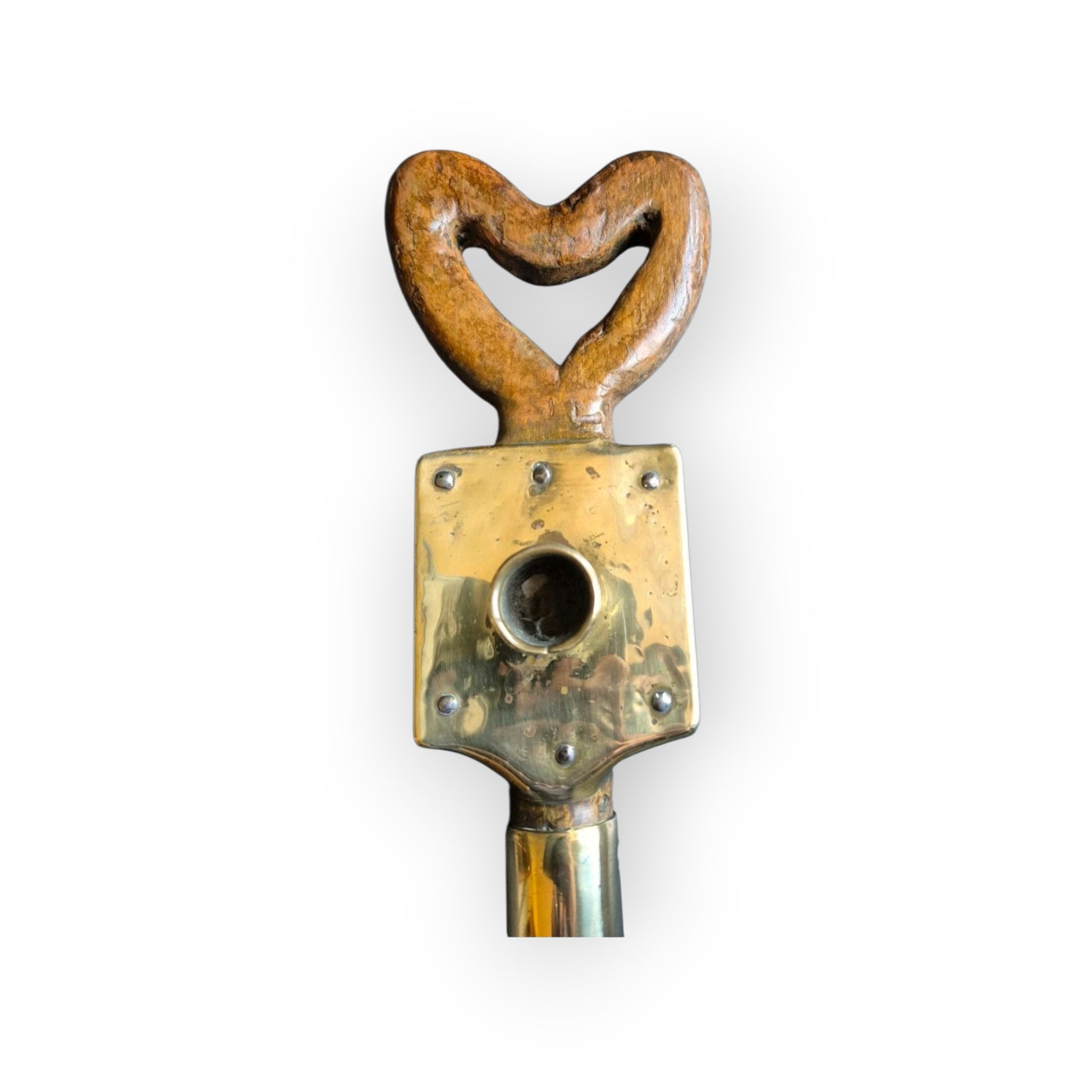 This rare late 18th‑century cellar candlestick combines the warmth of carved treen (wood) with the gleam of brass. Its hand‑carved wooden handle extends gracefully to its tapering iron spike, crowned by a brass candle holder and cover. Such pieces were practical companions in Georgian cellars, yet today they stand as sculptural survivors of domestic history.