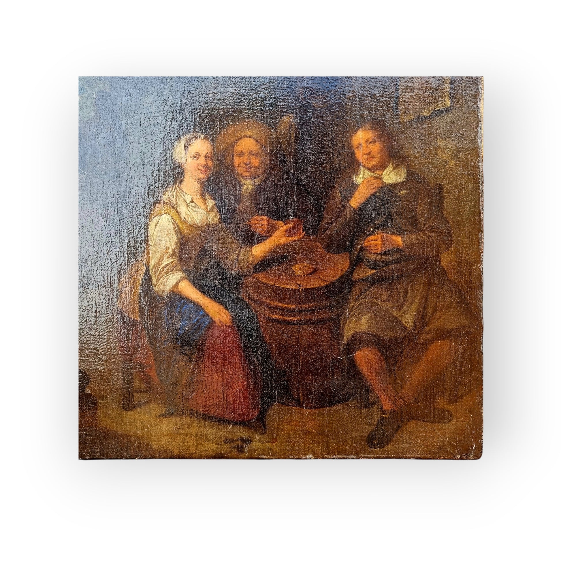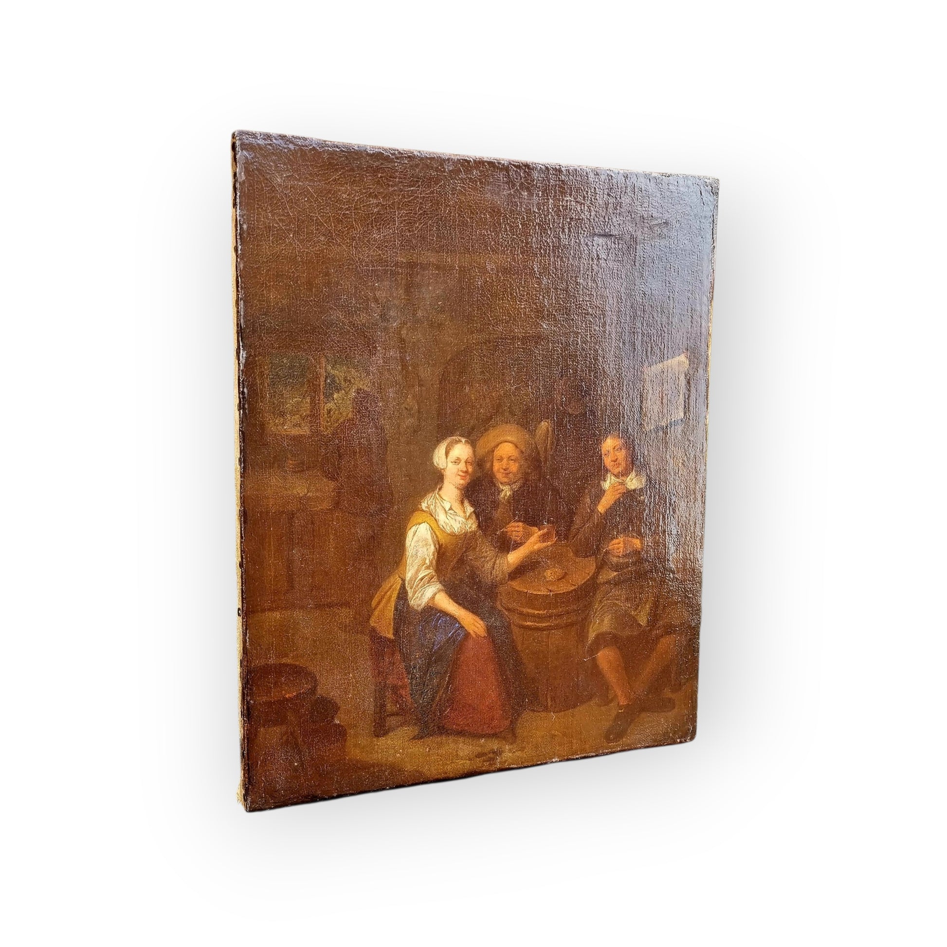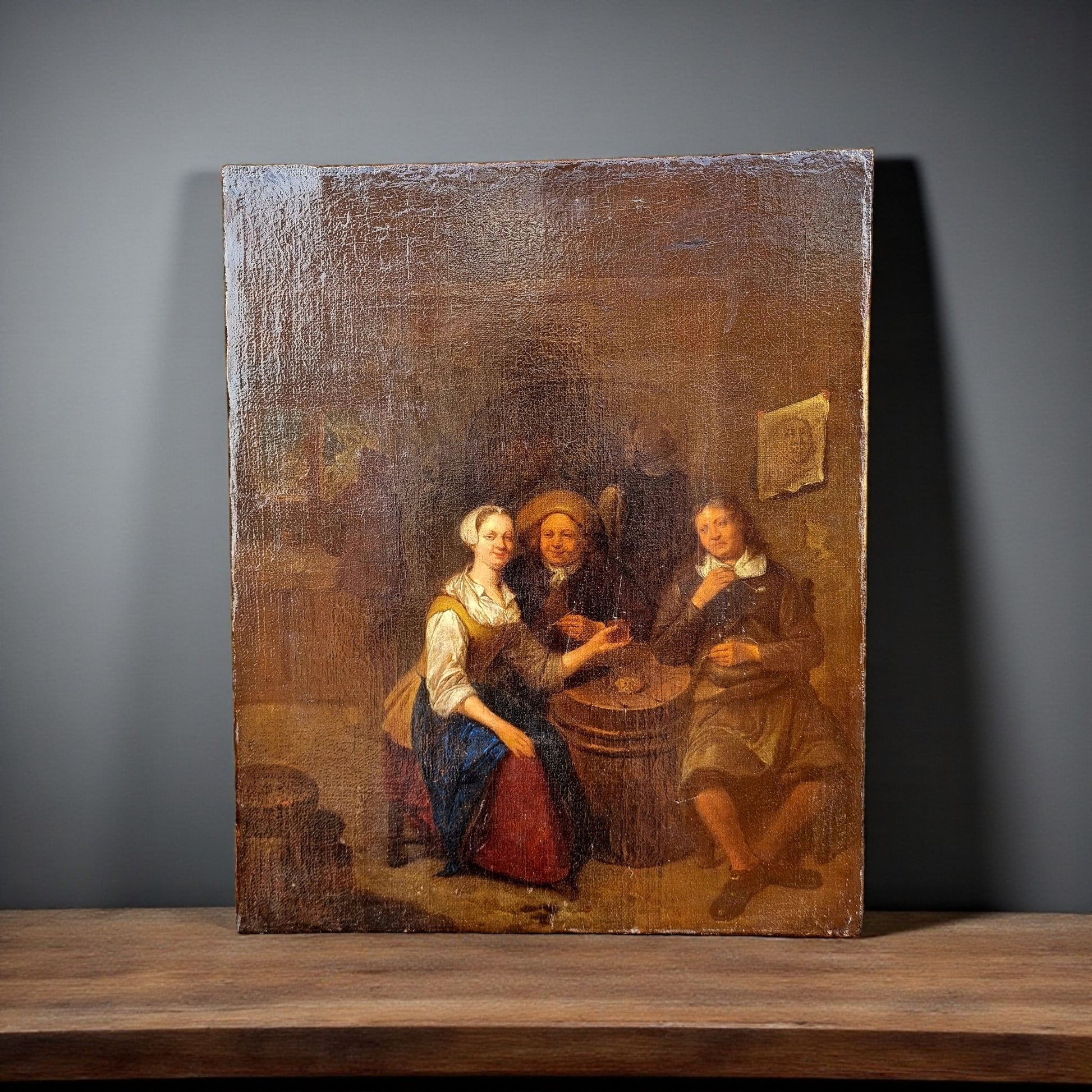 A charming 17th-Century Dutch School antique oil on canvas depicting an interior tavern scene.