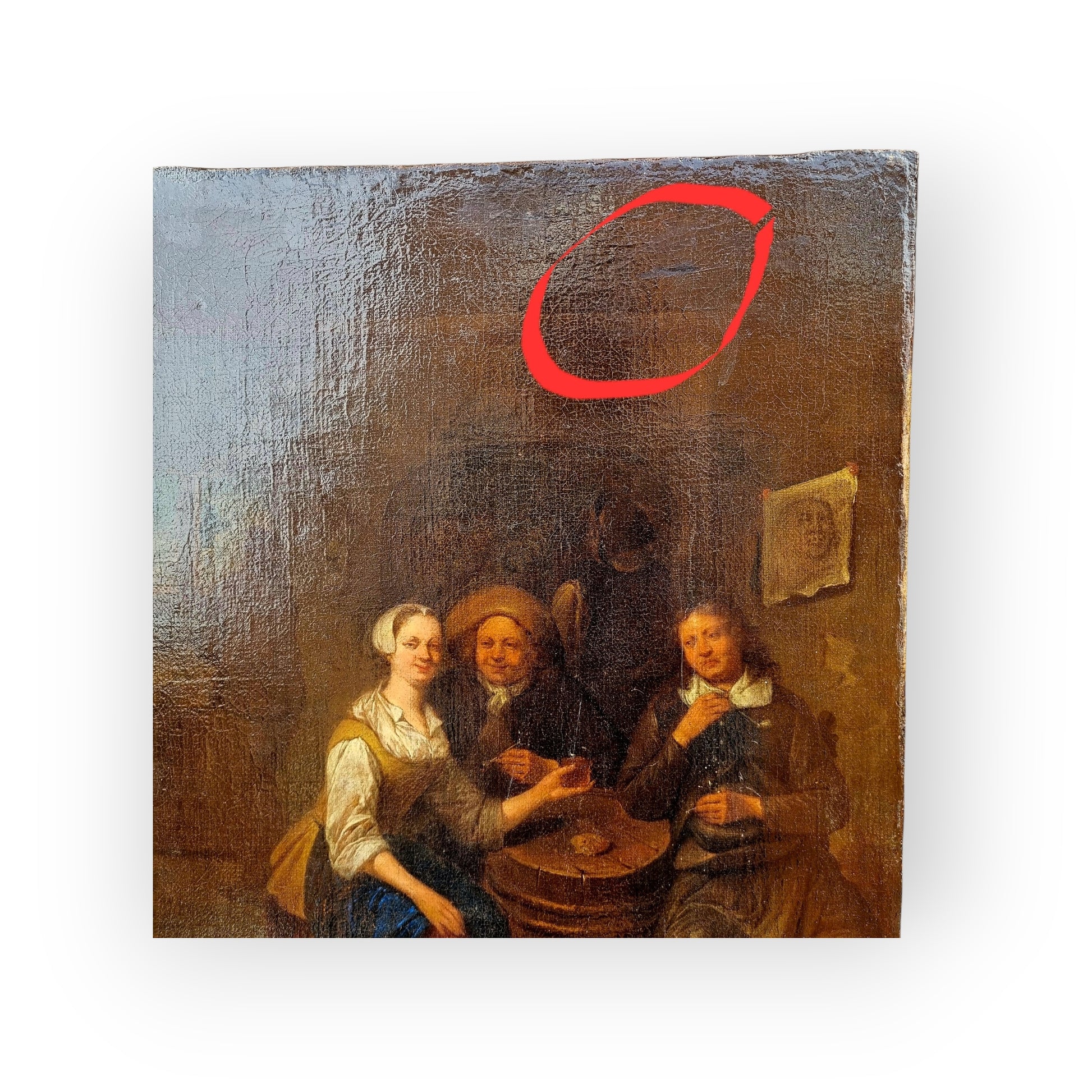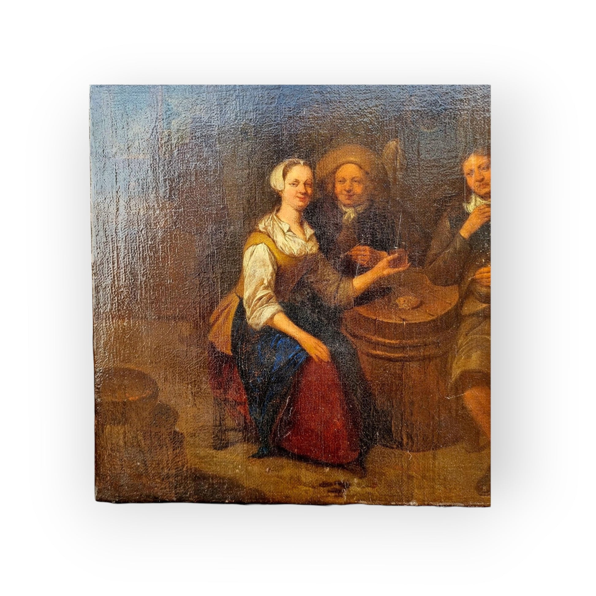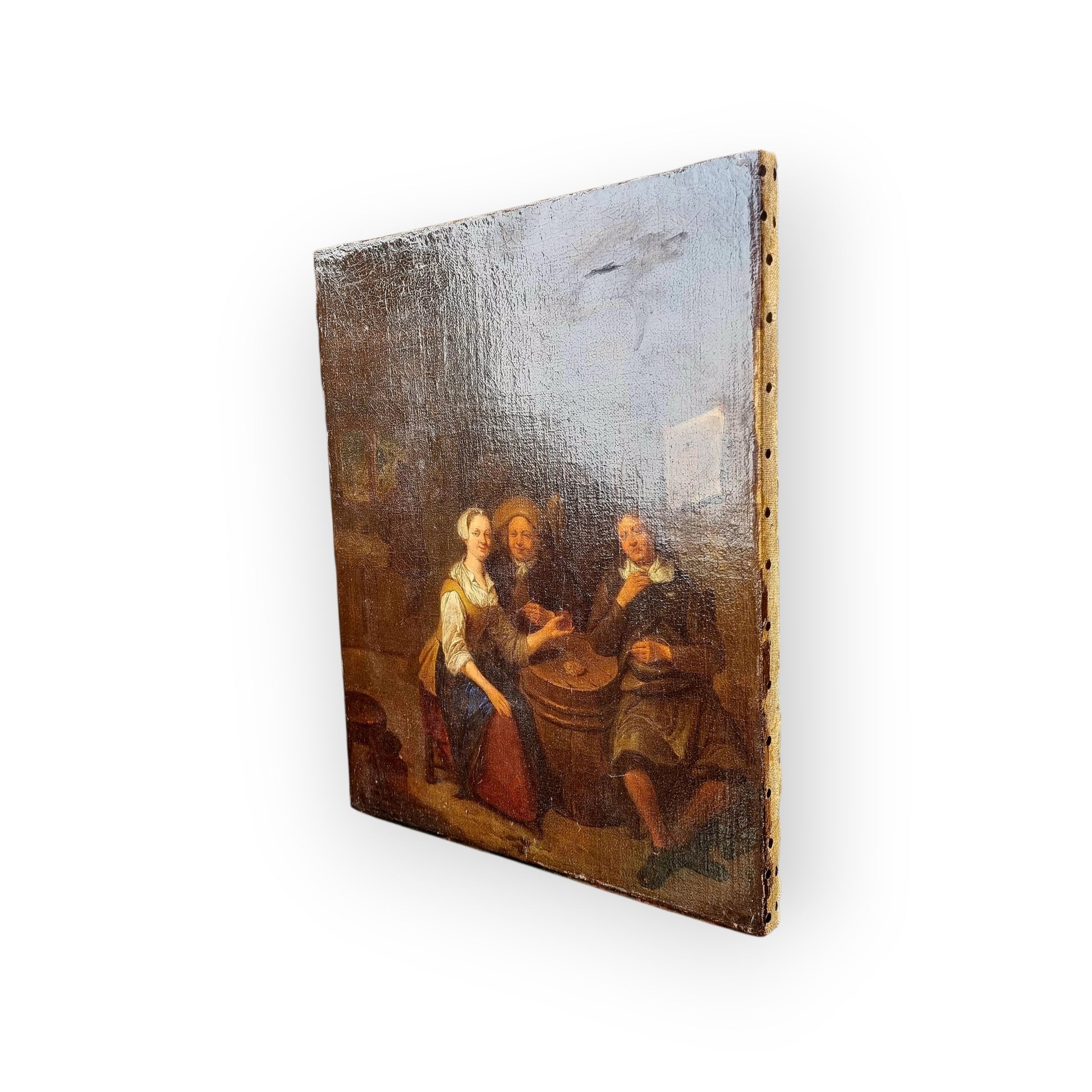 A charming 17th-Century Dutch School antique oil on canvas depicting an interior tavern scene.