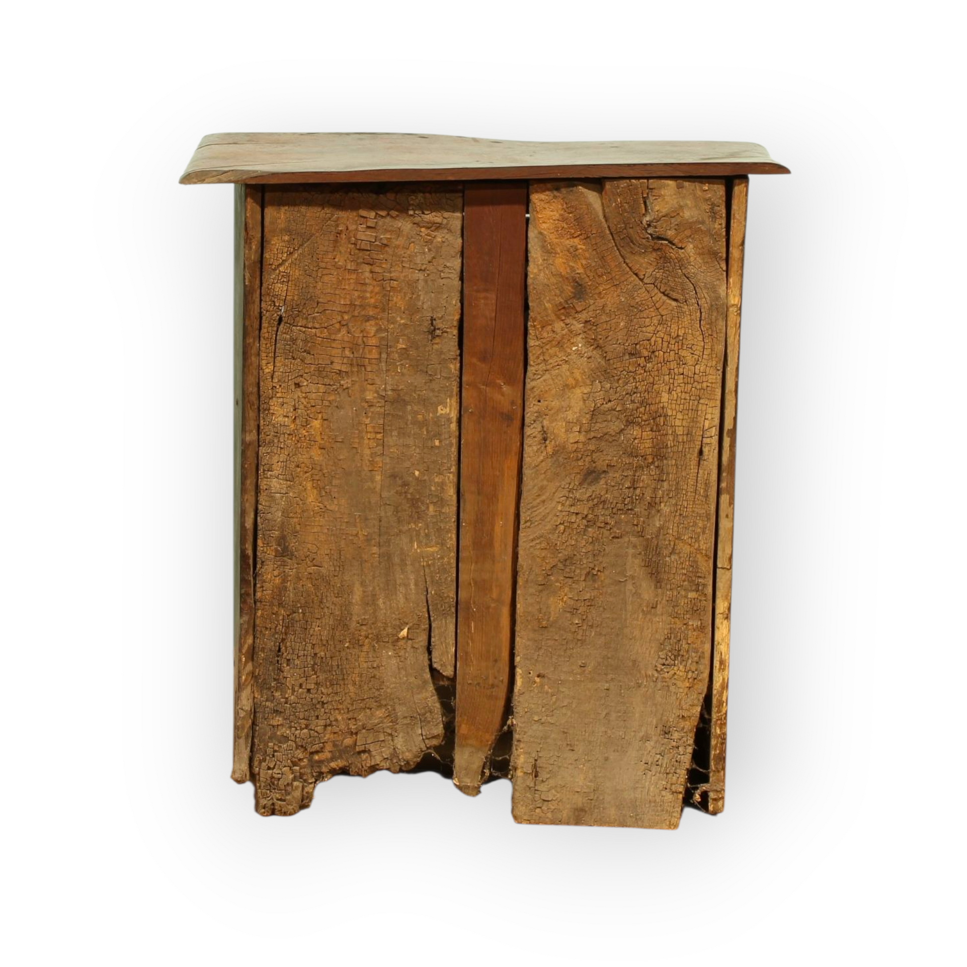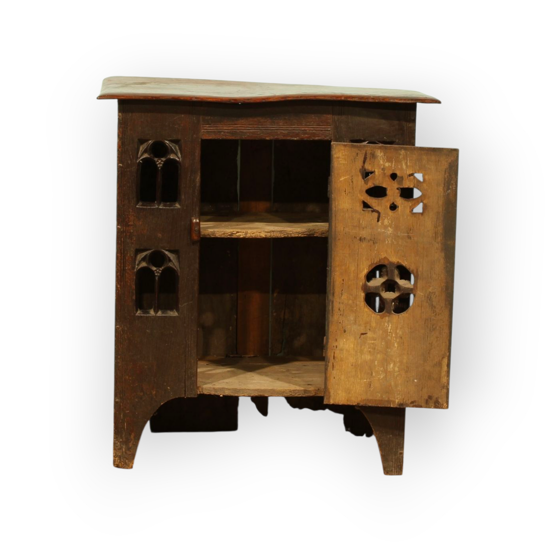 The form echoes medieval ecclesiastical furniture used for storing alms or sacred vessels, and its revivalist execution suggests a Victorian fascination with Gothic craftsmanship. The pierced panels and pegged construction are consistent with the aesthetic of the Gothic Revival, while the patina and wear lend it an authentic period feel.