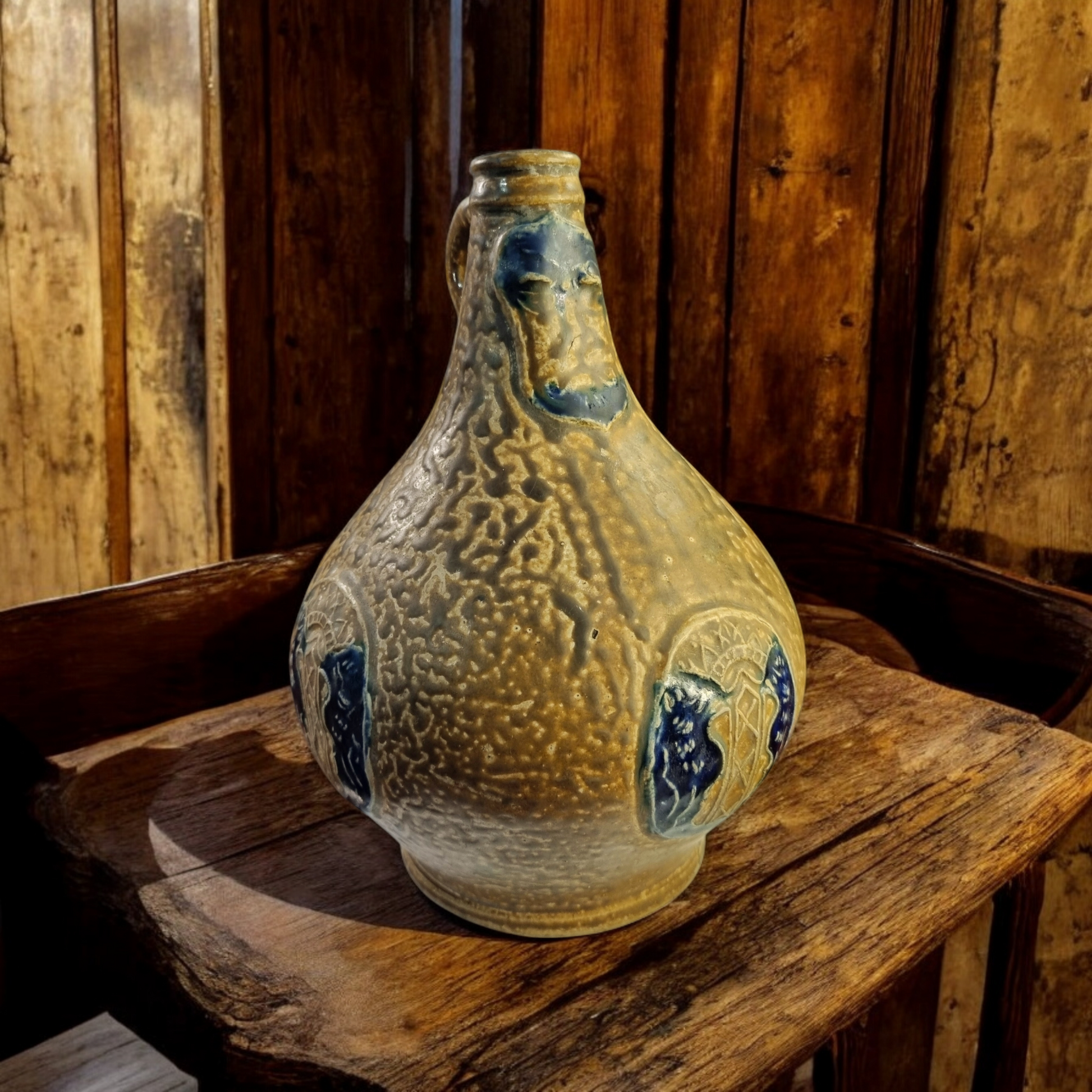 Rare 17thC German Antique Bellarmine / Bartmannkrug With Cobalt Blue & Tiger-Glaze Salt-Glazed Decoration