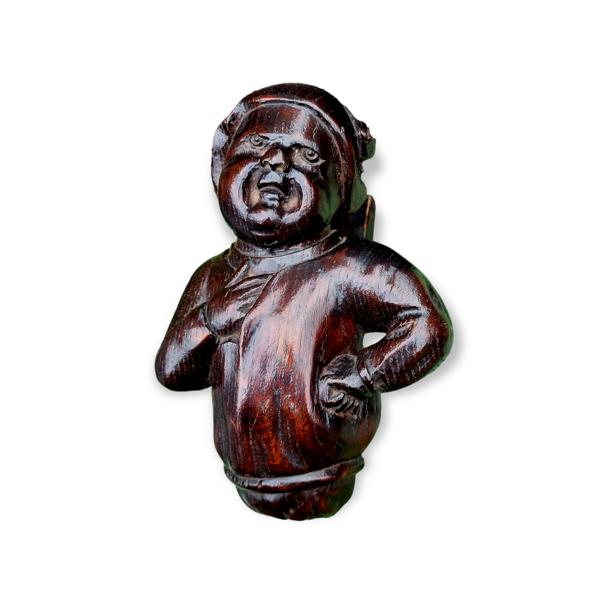 A pair of 15th-century style English antique carved oak figures of humorous characters, by repute originating from Beverley Minster, Yorkshire, England. Given the style of the carving, whilst in the late medieval manner, these are more likely to have been carved during the 19th century. The Minster does have several early characterful carvings in the Nave, and these may well have influenced the wood carver who made the two now offered here for sale.