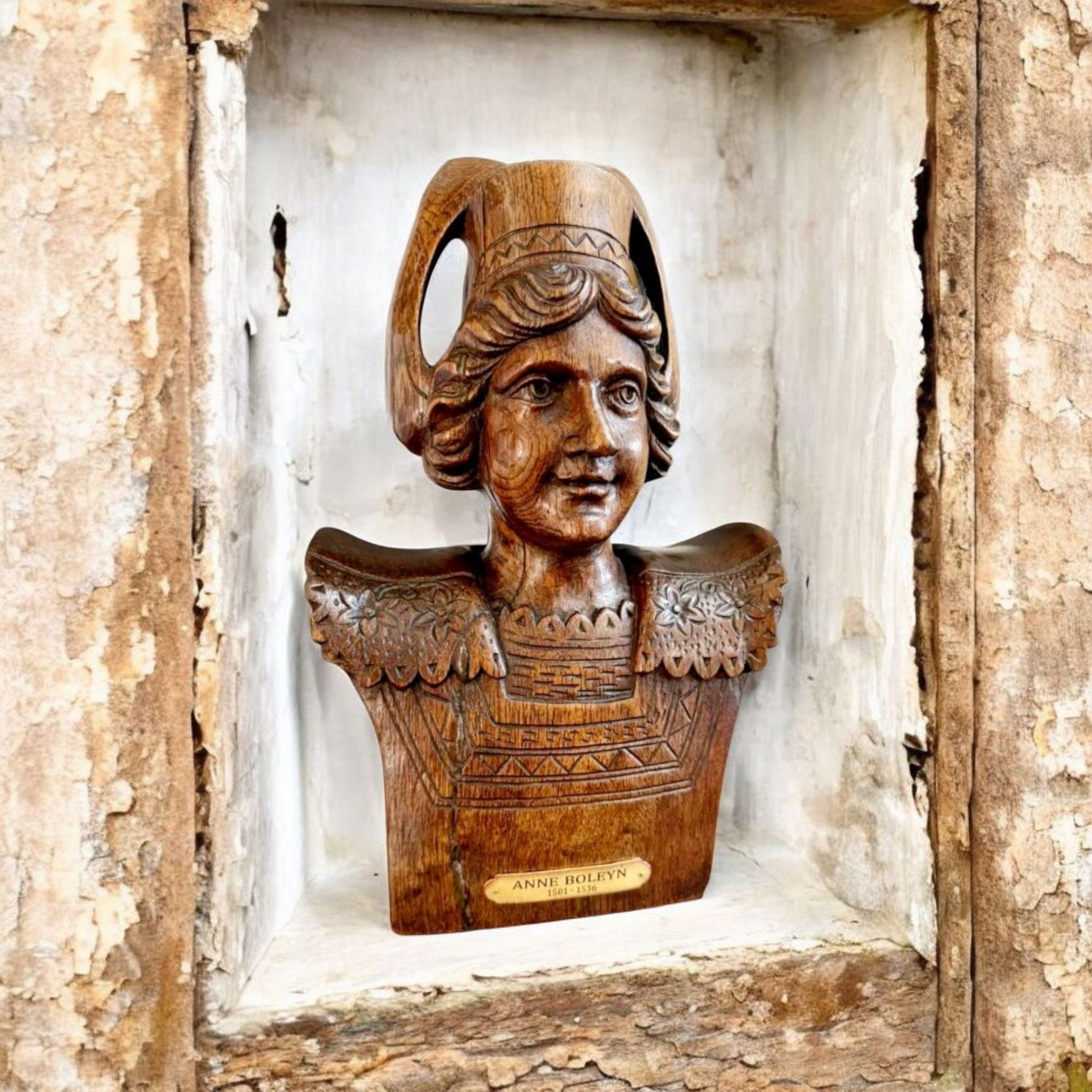 Carved from old English oak in the Renaissance manner, we offer for sale a decorative bust of Anne Boleyn, the second wife of Henry VII and mother to Princess Elizabeth, who was later to become Queen Elizabeth I.
