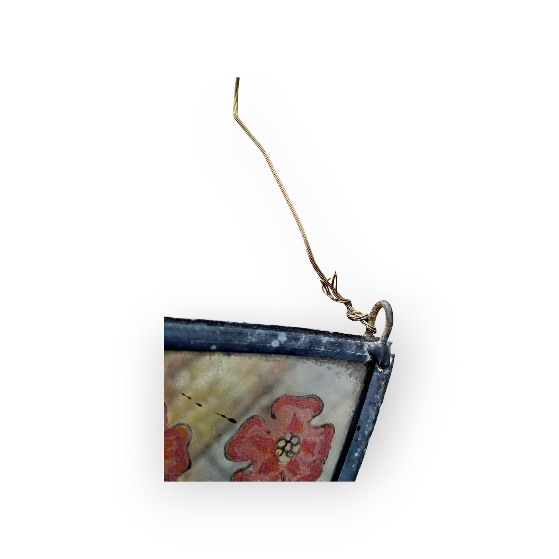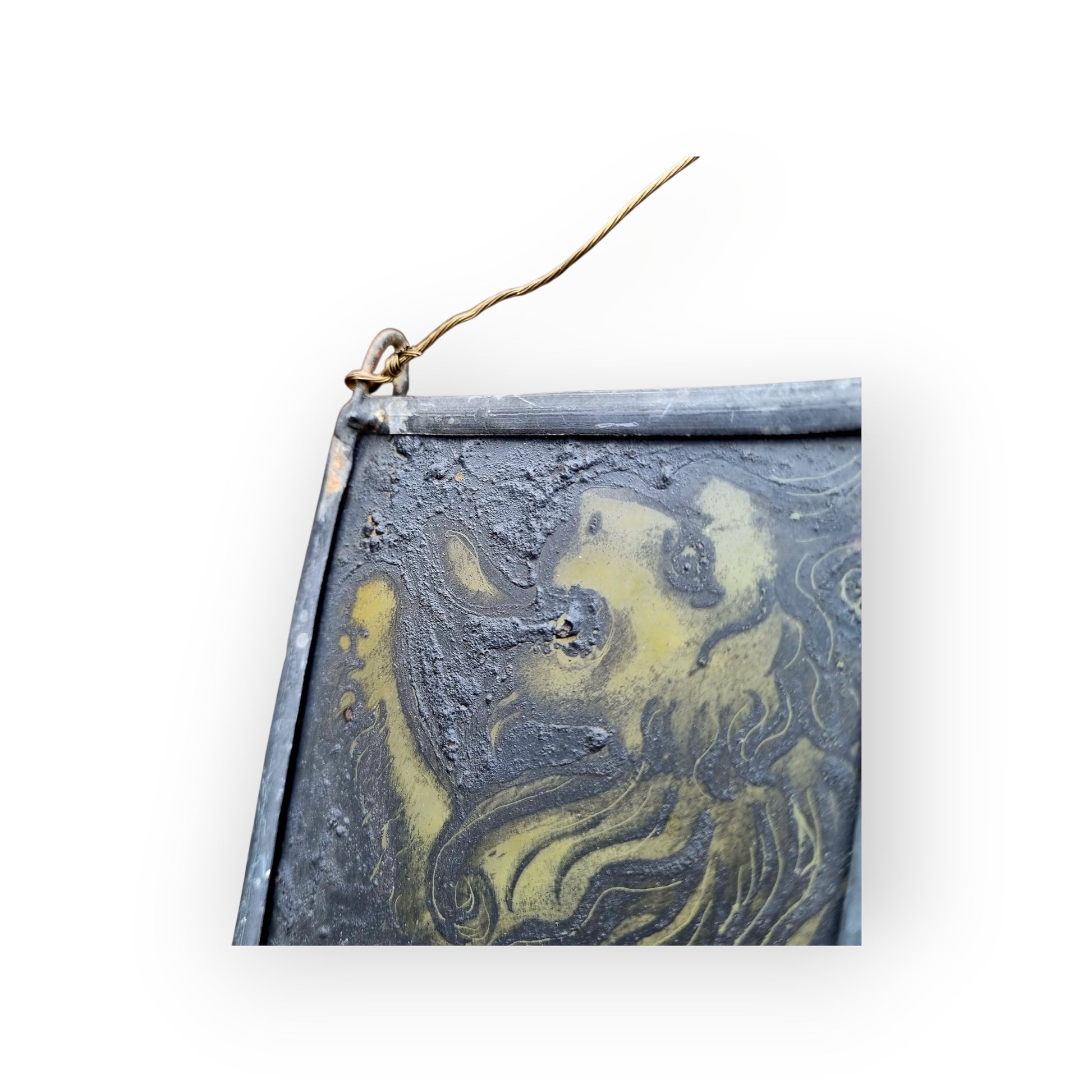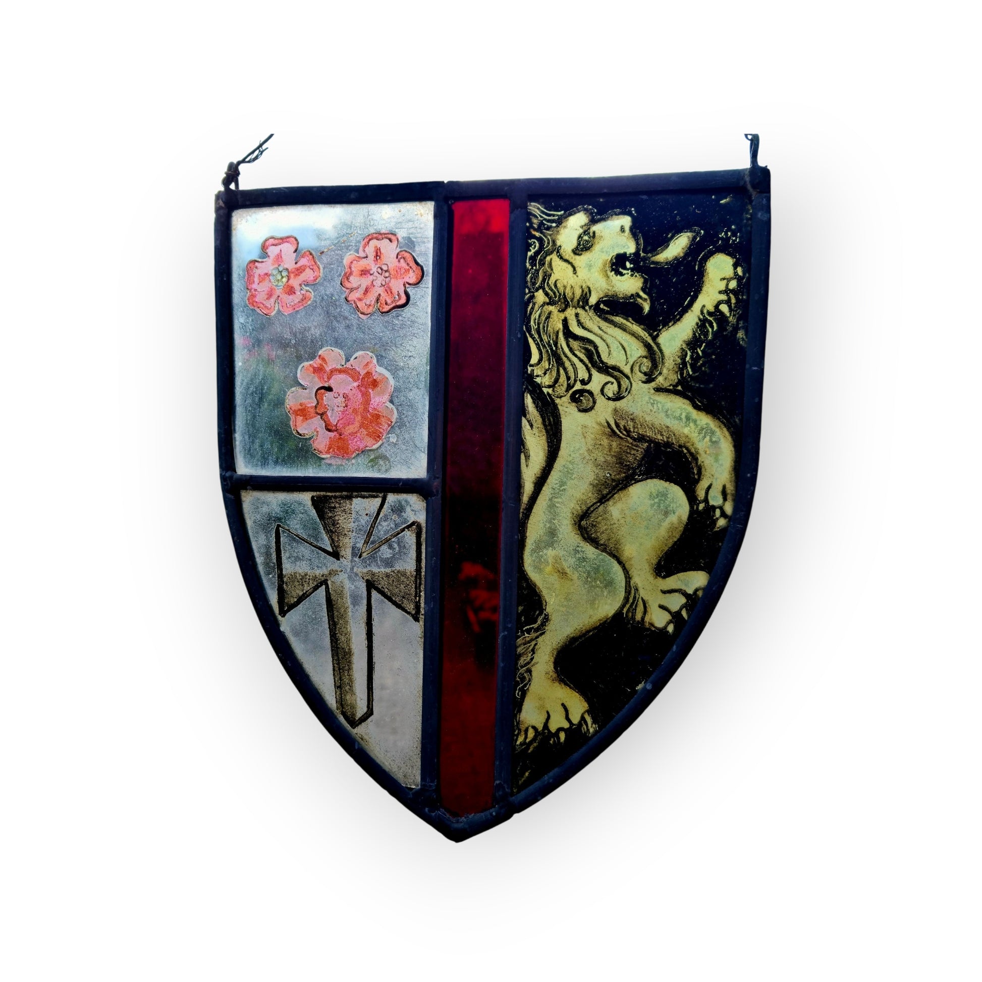 A 16th-Century antique stained glass armorial shield set within a lead frame incorporating a rampant lion supporter flanked by three roses and a cross below.