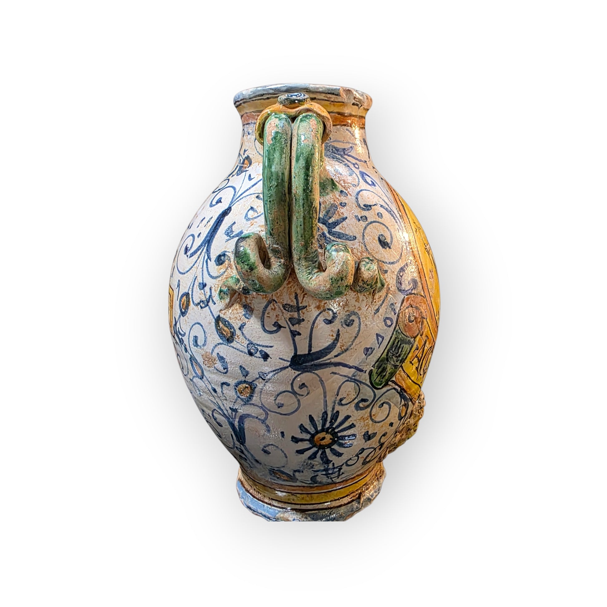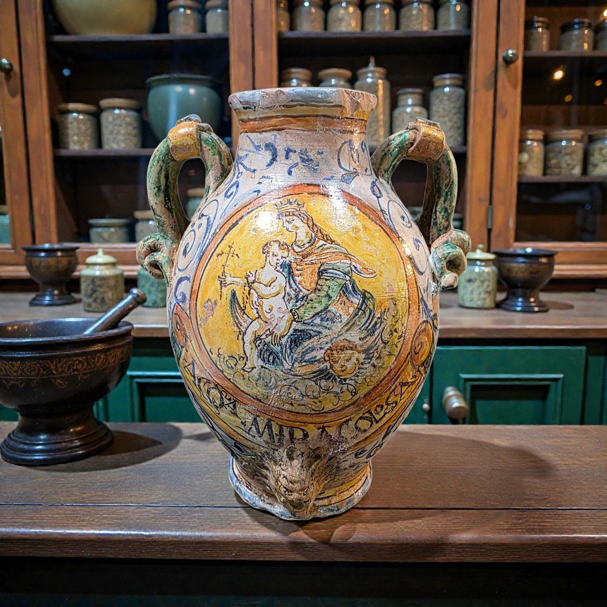 This piece is not only a rare survival of early pharmaceutical ware, but also a devotional object — a fusion of faith, science, and craftsmanship. Its sculptural presence and iconography make it a museum‑worthy addition to any collection of Italian majolica, religious art, or early medical history.